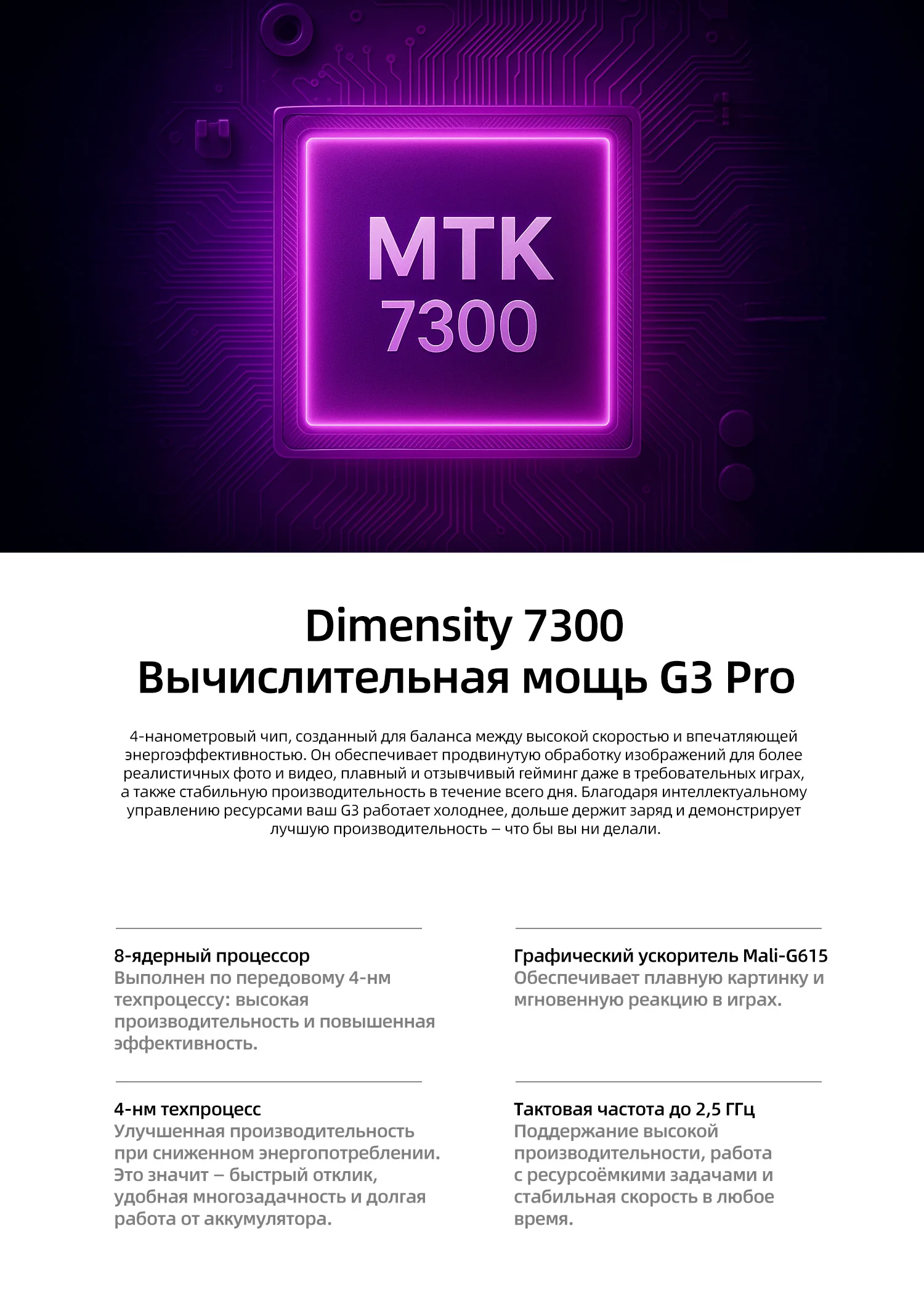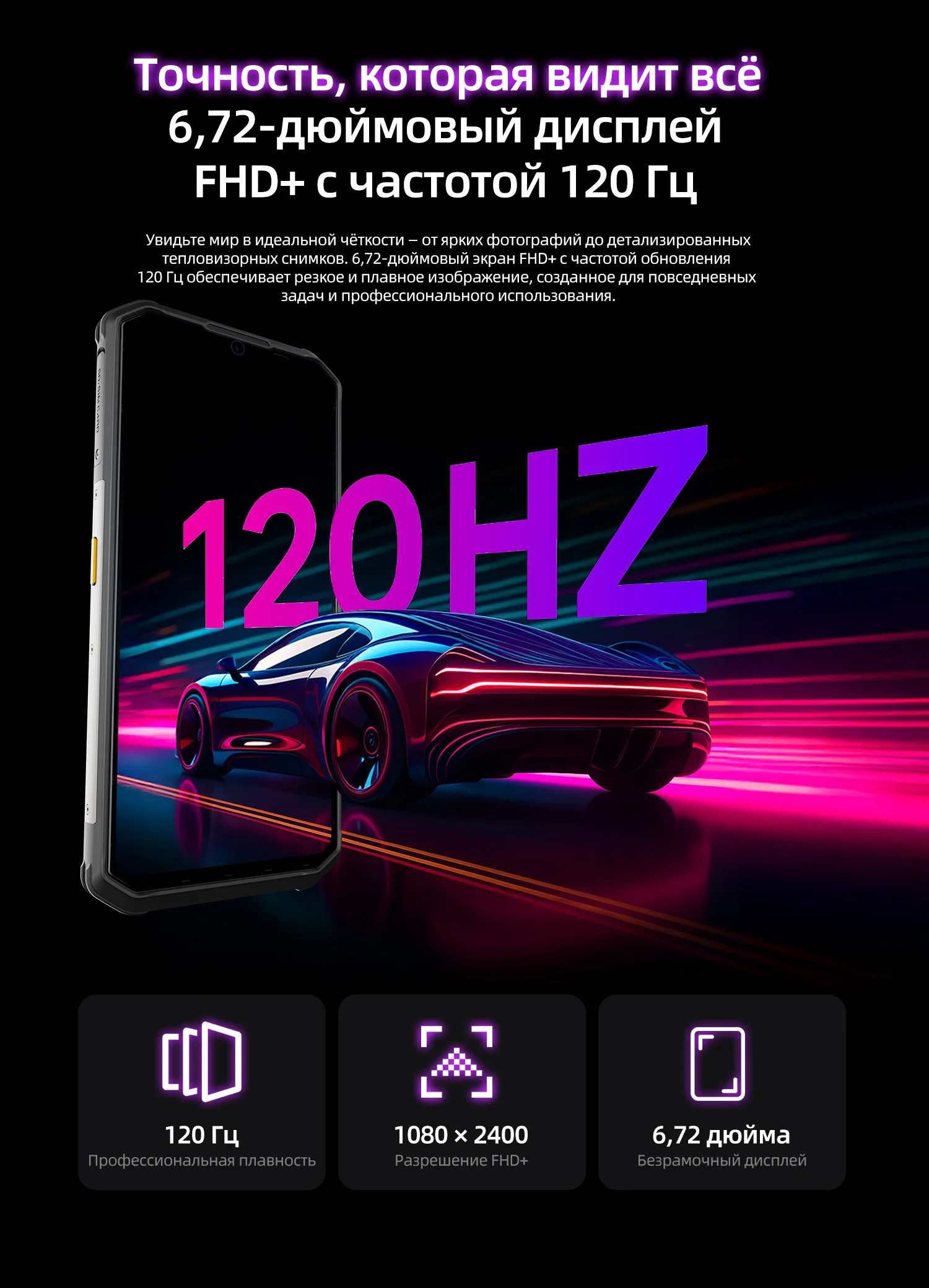 ОПЕРАЦІЙНА СИСТЕМА Операційна система — Android 15 КОРПУС Матеріал корпусу — Метал, Авіаційний алюміній, Пластик, Полікарбонат, Гума підвищеної міцності та зносостійкості, Скло Стандарт захисту — IP68, IP69K, MIL-STD-810 Захист корпусу — Водозахист, Вологозахист, Пилозахищений, Ударостійкий ЗВ'ЯЗОК Стандарти зв'язку — GSM, 3G, 4G (LTE), 5G Кількість SIM-карт — 2 SIM Формат SIM-карти — Nano-SIM Тип слота SIM-карт — SIM + SIM + MicroSD ЕКРАН Діагональ екрану — 6.72" Тип екрану — IPS Роздільна здатність екрана — 2400x1080 пікс.Full HD+ Частота оновлення екрану — 120 Гц Щільність пікселів — 392 ppi Захист екрану — Panda Glass ПРОЦЕСОР Процесор — MediaTek Dimensity 7300 Кількість ядер — 8 Частота процесора — 4x 2.5 ГГц ARM Cortex-A78, 4x 2.0 ГГц ARM Cortex-A55 Графічний процесор — ARM Mali-G615 ПАМ'ЯТЬ Оперативна пам'ять — 12 ГБ (+ 12 ГБ віртуальної пам'яті) Внутрішня пам'ять — 512 ГБ Слот для картки пам'яті — microSD до 1 ТБ КАМЕРА Камера — 64 МП + 2 МП Фронтальна камера — 50 МП ДОДАТКОВО БЕЗДРОТОВІ ТЕХНОЛОГІЇ Wi-Fi — 6 (802.11ax) Технологія GPS — A-GPS, GPS Супутникова система — GPS, ГЛОНАСС, Galileo, BDS Bluetooth — 5.2 NFC — Є VoLTE — Є FM-радіо — Є (через навушники) ІНТЕРФЕЙСИ Аудіо вихід (3.5 мм) — Є Роз'єм для синхронізації — USB Type-C ЗАХИЩЕННІСТЬ IP (ступінь захисту від проникнення) — IP68 / IP69K / Військовий сертифікат MIL-STD-810 Захист від пилу — Пил не може потрапити у пристрій. Повний захист від контакту. Захист від води — Витримує занурення на глибину до 1,5 м більше 30 хвилин, пристрій при цьому зберігає працездатність і може працювати в зануреному режимі. Захист від удару/падіння — Корпус і електроніка захищені від падінь і ударів, з висоти до 1,5 м. Скло — Гартоване удароміцне, стійке до подряпин, ударів та інших механічних впливів. Температура — від -35°C до +55°C ТЕХНОЛОГІЇ Датчик зовнішнього освітлення, Датчик наближення, Акселерометр, Магнітометр, Датчик відбитків пальців, Гіроскоп АКУМУЛЯТОР Місткість акумулятора — 10 000 mАh Потужність зарядки — 33 Вт Підтримка бездротової зарядки — Є Потужність бездротової зарядки — 18 Вт ГАБАРИТИ Розміри — 177.5 x 82.8 x 16 мм Вага — 375 г КОМПЛЕКТАЦІЯ Смартфон, Кабель USB, Блок живлення, Скріпка для лотка сим карти, Інструкція Характеристики та комплектація товару можуть бути змінені виробником без попередження.AGM G3