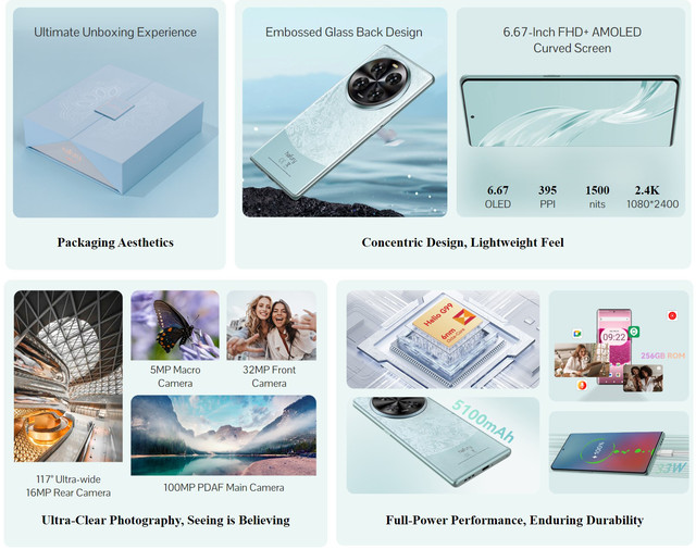 Пристрій Cubot Hafury Meet не лише смартфон, а й стильний аксесуар. У комплекті з ним ви знайдете ретельно підібраний набір аксесуарів, які стануть чудовим доповненням до вашого способу життя. Від модних фешн-чохлів для телефонів до практичних доповнень, таких як візитниця Parum та багатофункціональне дзеркало, кожна деталь розроблена з урахуванням вашого задоволення. Екран розміром 6,67 дюйми з роздільною здатністю 2400x1080 на базі технології AMOLED забезпечує високу якість зображення. Його частота оновлення 120 Гц надає зображенню плавність та реалістичність. Пікова яскравість вражаючих 1500 нит гарантує відмінну видимість навіть при яскравому сонячному світлі. Оптичний датчик відбитка пальця, вбудований у дисплей, забезпечує легке та зручне розблокування пристрою, зберігаючи при цьому високий рівень безпеки даних. Оснащений потужним восьмиядерним процесором Helio G99, цей смартфон піднімає продуктивність на новий рівень, забезпечуючи плавний запуск ігор та ефективне виконання багатозадачних завдань. Завдяки вражаючим 12 ГБ оперативної пам'яті та 256 ГБ вбудованої пам'яті, ви отримуєте можливість необмеженої та захоплюючої цифрової подорожі, а також достатньо простору для зберігання всіх ваших спогадів. Відкрийте для себе нові горизонти фотографії з основною потрійною камерою, що складається з 100-мегапіксельного об'єктива, який легко запам'ятовує кожну деталь з приголомшливою чіткістю і точністю. Доповніть свою колекцію фотографій надширококутним об'єктивом на 16 МП, що дозволяє захоплювати широкі пейзажі з кутом огляду 117°, а також насолоджуйтесь макрофотографією за допомогою об'єктива на 5 МП, що дозволяє розкривати красу прихованих деталей та текстур у світі. Дайте своєму вигляду сяйво з фронтальною камерою на 32 МП, що забезпечує яскраві та чіткі селфи, що надають впевненості вашому образу. Розкрийте свій творчий потенціал, захоплюючи чудові кадри за допомогою різноманітних функцій камери, які надаються у вашому розпорядженні, та відкрийте для себе нові аспекти світу у кожному кадрі. Спілкуйтеся з упевненістю завдяки подвійному мікрофону із системою шумоподавлення, яка дозволяє вашому голосу звучати чітко та без перешкод, забезпечуючи кришталево чисті розмови без відволікань. Звук динаміка також має високу якість: він гучний і чистий. Hafury Meet поєднує потужний і довговічний акумулятор ємністю 5100 мАг, який легко справляється з вашим динамічним життям. Завдяки швидкій зарядці потужністю 33 Вт ви завжди залишитеся зарядженими, щоб бути в курсі всього, що відбувається протягом дня. Hafury Meet не просто телефон, а й стильний аксесуар завдяки персоналізованому та модному чохлу із дзеркалом, розробленому компанією Hafury. Цей чохол дозволить вам легко поєднувати його з власним стилем, додаючи неповторний шарм вашого пристрою. ХАРАКТЕРИСТИКИ КОРПУС Матеріал корпусу — Пластик ПРОГРАМНІ ХАРАКТЕРИСТИКИ Операційна система — Android 13 ЗВ'ЯЗОК Стандарти зв'язку — 2G, 3G, 4G (LTE) Кількість SIM-карт — 2 SIM Тип SIM-карти — Nano-SIM Тип слота — SIM + Гібридний (SIM або MicroSD) ЕКРАН Розмір екрану — 6.67" Тип матриці — AMOLED Роздільна здатність екрана — 2400x1080 пікс. Частота оновлення — 120 Гц Щільність пікселів — 395 ppi ПРОЦЕСОР Процесор — MediaTek Helio G99 Кількість ядер — 8 Частота — 2x 2.2 ГГц Cortex-A76 + 6x 2.0 ГГц Cortex-A55 Графічний процесор — ARM Mali-G57 MC2 ПАМ'ЯТЬ Оперативна пам'ять — 12 ГБ (+ 12 ГБ віртуально