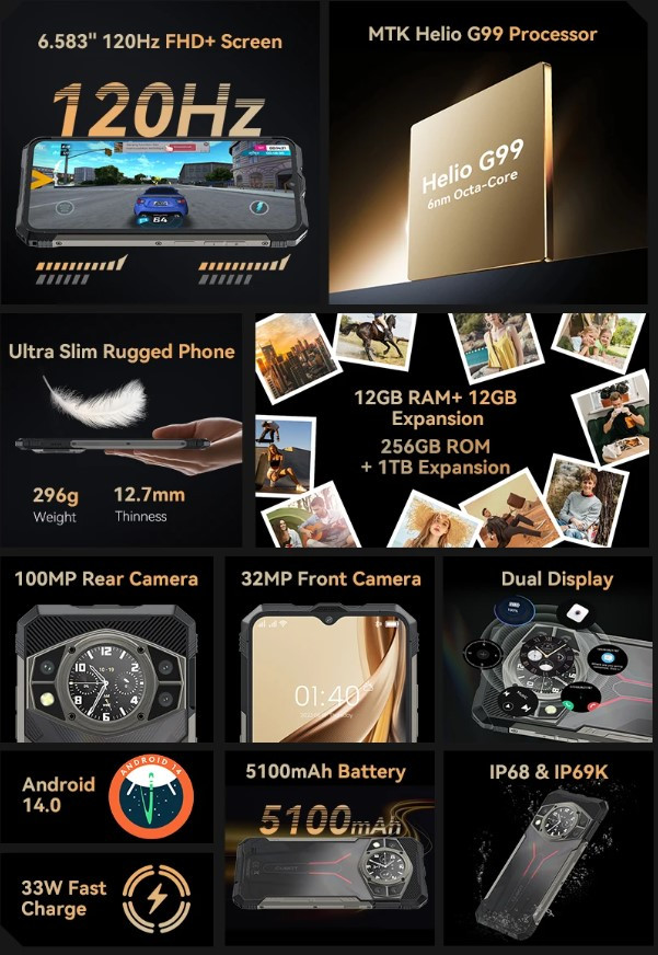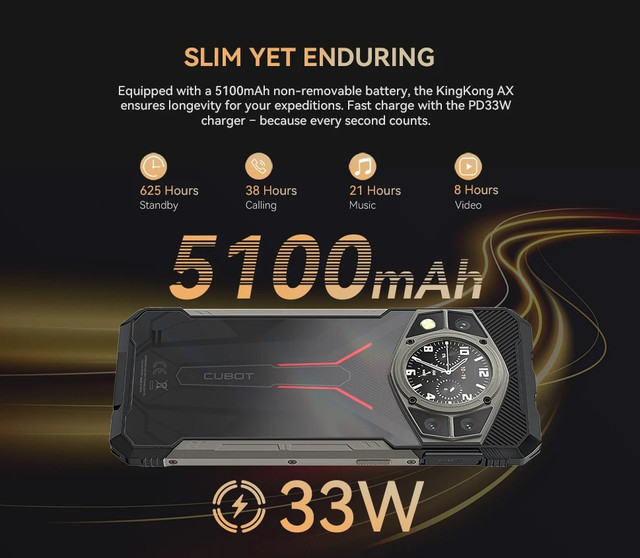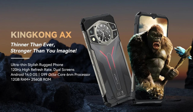 KingKong AX - це свіжий смартфон від компанії Cubot, який вражає приголомшливим дизайном, що нагадує стрілу Купідона і здатний завоювати ваше серце з першого погляду. Сертифікації IP68/IP69K/MIL-STD-810H гарантують надійний захист від води, вологи, ударів і падінь. Завдяки цим сертифікатам, цей телефон можна брати куди завгодно, адже він здатний витримувати різні погодні умови та екстремальні ситуації. Діагональ екрану в 6,583 дюйми з IPS-матрицею та роздільною здатністю 2408x1080 забезпечує оптимальний комфорт при читанні електронних книг та новин. Висока якість кольору створює приємні враження при перегляді медіаконтенту, роблячи його більш яскравим і реалістичним. Процесор MediaTek Helio G99 залишається актуальним і на сьогоднішній день. Він забезпечує хорошу частоту кадрів в іграх з високими вимогами, яка коливається між 27 та 60 кадрами на секунду. Оперативної пам'яті об'ємом 12+12 ГБ буде достатньо для коректної роботи з кількома програмами одночасно. Для зберігання файлів є внутрішня пам'ять обсягом 256 ГБ, що задовольнить потреби звичайного користувача. Задня камера з роздільною здатністю 108 мегапікселів оснащена подвійним світлодіодним спалахом та 6 оптичними елементами, що забезпечує високу якість фотографій та відеоконтенту. Фронтальна камера з роздільною здатністю 32 мегапікселя має функцію розпізнавання облич, що уможливлює використання її для розблокування пристрою. Крім того, вона ідеально підходить для створення оригінальних селфі та запису відео зі швидкістю 30 кадрів на секунду. Акумулятор ємністю 5100 мАг є стандартним для більшості смартфонів і забезпечує можливість використання пристрою протягом 1-2 днів при активному використанні. Завдяки швидкій зарядці смартфон Cubot KingKong AX буде готовий до роботи швидше, роблячи його надійним помічником у вирішенні важливих завдань. Другий дисплей на задній стороні смартфона KingKong AX є цікавою особливістю. У стандартному режимі він служить для відображення функціонального годинника, який може бути налаштований у різних варіантах дизайну. Крім того, цей додатковий дисплей дозволяє переглядати корисну інформацію, що робить його зручним інструментом у різних ситуаціях. ОПЕРАЦІЙНА СИСТЕМА Операційна система — Android 14 КОРПУС Стандарт захисту — IP69K, IP68, MIL-STD-810G Захист корпусу — Водозахист, Вологозахист, Пилозахищений, Ударостійкий ЗВ'ЯЗОК Кількість SIM-карт — 2 SIM Формат SIM-карти — Nano-SIM Тип слота SIM-карт — SIM + Гібридний (SIM або MicroSD) Стандарти зв'язку — GSM, 3G, 4G (LTE) ЕКРАН Діагональ екрану — 6.58" Роздільна здатність екрана — 2408x1080 пікс. FHD+ Частота оновлення — 120 Гц Щільність пікселів — 401 PPI Тип екрану — IPS Захисне скло — Gorilla glass Додатково: ПРОЦЕСОР Процесор — Mediatek Helio G99 Кількість ядер — 8 Частота процесора — 2х 2.2 ГГц ARM Cortex-A76, 6x 2.0 ГГц ARM Cortex-A55 Графічний процесор — ARM Mali-G57 MC2 ПАМ'ЯТЬ Внутрішня пам'ять — 256 Гб Оперативна пам'ять — 12 ГБ (+ 12 ГБ віртуальної пам'яті) Слот для картки пам'яті — Є Підтримка карт пам'яті microSD — до 1 ТБ КАМЕРА Камера — 108 МП + 5 МП + 0.3 МП Фронтальна камера — 32 МП, ƒ/ 2.2 БЕЗДРОТОВІ ТЕХНОЛОГІЇ Wi-Fi — IEEE 802.11 a/b/g/n/ac Технологія GPS — A-GPS, GPS Супутникова система — GLONASS, Beidou, Galileo Bluetooth — 5.2 NFC — Є VoLTE — Є ІНТЕРФЕЙСИ Інтерфейси та підключення — USB Type-C ЗАХИЩЕННІСТЬ IP (ступінь захисту від проникнення) — IP68 / IP69K / Військовий сертифікат MIL-STD-810G Захист від пилу — Пил не може потрапити у пристрій. Повний захист від контакту. Захист в