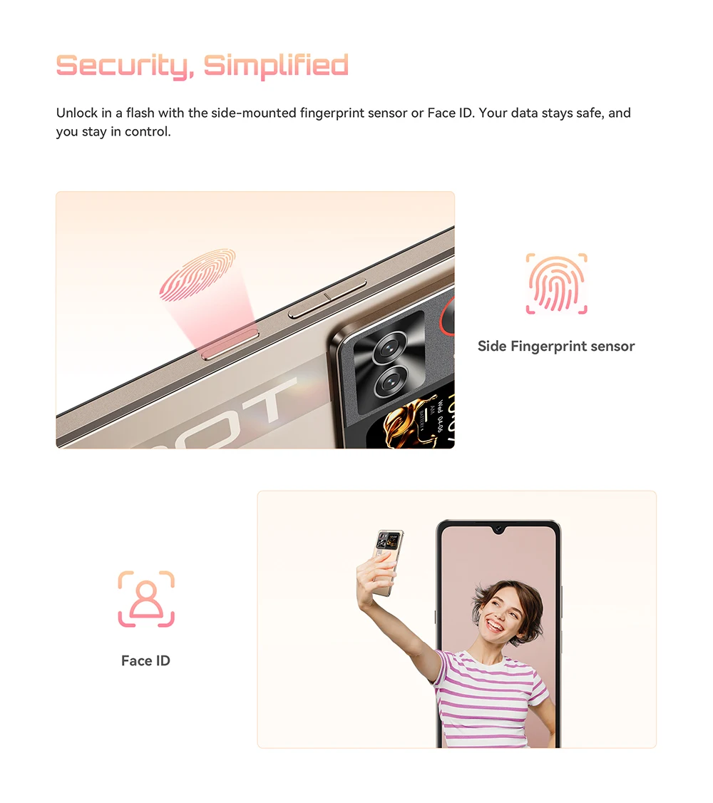 CUBOT X100 – це стильний та сучасний смартфон, доступний у двох кольорах: елегантному чорному та яскравому золотому. Корпус з матовим покриттям та великим логотипом на задній панелі надає впевненого вигляду. Завдяки товщині всього 8,9 мм та вазі 208 г він залишається зручним у використанні, поєднуючи легкість та міцність. Основний екран має діагональ 6,88 дюйми, роздільну здатність HD+ і частоту оновлення 120 Гц, що забезпечує плавність картинки. Скло Gorilla Glass захищає дисплей від подряпин та випадкових ударів. На задній кришці розташований 1,72-дюймовий TFT-екран з роздільною здатністю 320х380 пікселів. Він дозволяє швидко перевіряти час, оповіщення, музику або використовувати його як видошукач для селфі на основну камеру. Смартфон оснащений процесором MediaTek Dimensity 7025 (6-нм, 8 ядер), до 16 ГБ ОЗП (8+8 ГБ розширення) та 256 ГБ сховища, яке можна розширити картою пам'яті. Це робить CUBOT X100 збалансованим пристроєм для розваг, роботи та повсякденного використання. Потрійний модуль включає 64 МП основний сенсор з PDAF, 5 МП надширококутний об'єктив та 2 МП макрооб'єктив. Фронтальна камера на 16 МП забезпечує якісні селфі та чіткі відеодзвінки. Система з двома динаміками та підсилювачами створює насичене стереозвучання, що підходить як для музики, так і для перегляду фільмів чи ігор. Місткість акумулятора становить 5100 мА·год, що вистачає на цілий день активного використання. Підтримується швидке заряджання 33 Вт (PD) для максимальної зручності. Смартфон працює на Android 15, має бічний сканер відбитків пальців та Face ID для швидкого розблокування. Підтримує NFC для безконтактних платежів, Bluetooth 5.0, OTG, дводіапазонний Wi-Fi (2.4/5 ГГц) та всі сучасні навігації: GPS, ГЛОНАСС, Galileo, Beidou. ОПЕРАЦІЙНА СИСТЕМА Операційна система — Android 15 КОРПУС Матеріал корпусу — Пластик, Метал, Скло ЗВ'ЯЗОК Кількість SIM-карт — 2 SIM Формат SIM-карти — Nano-SIM Тип слота SIM-карти — SIM + SIM Стандарти зв'язку — GSM, 3G, 4G (LTE), 5G ЕКРАН Діагональ екрану — 6.88" Тип екрану — IPS Роздільна здатність екрана — 1640x720 пікс. Частота оновлення екрану — 120 Гц Щільність пікселів — 260 ppi Захисне скло — Corning Gorailla Glass Екран на задній стороні: Діагональ екрану — 1.72" Тип екрану — IPS Роздільна здатність екрана — 380x320 пікс. Функції — Годинник, Камера, Компас, Сповіщення, Відтворення музики ПРОЦЕСОР Процесор — MediaTek Dimensity 7025 Кількість ядер — 8 Частота процесора — 2x 2.5 ГГц Cortex-A78 + 6x 2.0 ГГц Cortex-A55 Графічний процесор — IMG BXM-8-256 ПАМ'ЯТЬ Внутрішня пам'ять — 256 ГБ Оперативна пам'ять — 8 ГБ (+ 8 ГБ віртуальної пам'яті) Слот для картки пам'яті — Немає КАМЕРА Камера — 64 МП + 5 МП + 2 МП Фронтальна камера — 16 МП АУДІО Стереозвук — Є БЕЗДРОТОВІ ТЕХНОЛОГІЇ Wi-Fi — 5 (802.11ac) Технологія GPS — A-GPS, GPS Супутникова система — GPS, ГЛОНАСС, Galileo, Beidou Bluetooth — 5.0 VoLTE — Є NFC — Є ІНТЕРФЕЙСИ Аудіо вихід (3.5 мм) — Немає Роз'єм для синхронізації — USB Type-C 3.1 ТЕХНОЛОГІЇ Акселерометр, Датчик освітлення, Датчик наближення, Цифровий компас, Датчик відбитків пальців АКУМУЛЯТОР Місткість акумулятора — 5100 мАг Потужність зарядки — 33 Вт ГАБАРИТИ Розміри — 171.9 x 78.1 x 8.9 мм Вага — 208 г КОМПЛЕКТАЦІЯ Смартфон, Кабель USB Type-C, Блок заряджання, Чохол накладка, Скло, Інструмент для вилучення SIM-карти, Інструкція Характеристики та комплектація товару можуть бути змінені виробником без попередження.CUBOT X100
