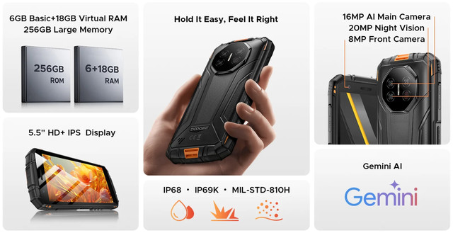 DOOGEE Fire 3 Ultra – це смартфон, призначений для тих, хто цінує надійність та витривалість. Посилений корпус із захисними заглушками на роз'ємах забезпечує повний захист від пилу та вологості. Завдяки сертифікаціям IP68, IP69K та MIL-STD-810H, пристрій стійко витримує удари, перепади температур, занурення у воду та роботу в екстремальних умовах. Це чудовий вибір як для повсякденного міського використання, так і для подорожей, експедицій чи роботи на свіжому повітрі. Fire 3 Ultra стане вашим надійним партнером у будь-яких життєвих ситуаціях. Яскравий 5,5-дюймовий дисплей IPS з роздільною здатністю 1080×2408 та частотою оновлення 90 Гц гарантує плавне зображення з високою чіткістю та насиченими кольорами навіть під прямим сонячним світлом. Посилене скло із захистом від подряпин робить екран надійним у щоденному використанні під час роботи в екстремальних умовах. Смартфон оснащений потужним процесором Unisoc T7200 та підтримує до 24 ГБ оперативної пам'яті (6 ГБ фізичної + до 18 ГБ віртуальної), що гарантує швидку та стабільну роботу навіть у багатозадачному режимі. Вбудоване сховище об'ємом 256 ГБ дозволяє зберігати велику кількість файлів, а підтримка карт microSD до 2 ТБ відкриває практично безмежні можливості для фото, відео, документів та програм. Основна камера 16 МП з AI-оптимізацією забезпечує чіткі та деталізовані знімки, а передня камера 8 МП ідеально підходить для селфі та відеодзвінків. Підтримка режиму HDR та захист від бризок дозволяють знімати за будь-яких умов. Додатково смартфон оснащений камерою нічного бачення 20 МП, яка робить чорно-білі фото навіть у темряві. Місткий акумулятор 8350 мАг забезпечує до 61 дня роботи в режимі очікування та до 41 години перегляду відео без підзарядки. Завдяки підтримці швидкої зарядки 18 Вт смартфон швидко відновлює енергію, а функція OTG Reverse Charging дозволяє використовувати його як павербанк для зарядки інших пристроїв. ОПЕРАЦІЙНА СИСТЕМА Операційна система — Android 15.0 (DokeOS 4.1) КОРПУС Стандарт захисту — IP68 / IP69K / MIL-STD-810 Захист корпусу — Водозахист, Вологозахист, Пилозахищений, Ударостійкий Матеріал корпусу — Метал, Авіаційний алюміній, Пластик, Полікарбонат, Гума підвищеної міцності та зносостійкості, Скло ЗВ'ЯЗОК Кількість SIM-карт — 2 SIM Формат SIM-карти — Nano-SIM Тип слота SIM-карти — SIM + SIM + MicroSD Стандарти зв'язку — GSM, 3G, 4G (LTE) ЕКРАН Діагональ екрану — 5.5" Тип екрану — IPS Роздільна здатність екрана — 1440х720 пікс Частота оновлення екрану — 90 Гц Щільність пікселів — 293 ppi Захист екрану — Panda glass ПРОЦЕСОР Процесор — Unisoc T7200 Кількість ядер — 8 Частота процесора — 2x 1.6 ГГц Cortex-A75 + 6x 1.6 ГГц Cortex-A55 Графічний процесор — ARM Mali-G57 MP1 ПАМ'ЯТЬ Внутрішня пам'ять — 256 ГБ Оперативна пам'ять — 6 ГБ (+ 18 ГБ віртуальної пам'яті) Слот для картки пам'яті — Є, microSD 2 ТБ КАМЕРА Камера — 16 МП + 20 МП + Ai МП Фронтальна камера — 8 МП БЕЗДРОТОВІ ТЕХНОЛОГІЇ Wi-Fi — 5 (802.11ac) Технологія GPS — A-GPS, GPS Супутникова система — GPS, ГЛОНАСС, Galileo, Beidou Bluetooth — 5.0 VoLTE — Є NFC — Є Інфрачервоний порт — Немає ІНТЕРФЕЙСИ Аудіо вихід (3.5 мм) — Є Роз'єм для синхронізації — USB Type-C 2.0 ЗАХИЩЕННІСТЬ IP (ступінь захисту від проникнення) — IP68 / IP69K / Військовий сертифікат MIL-STD-810 Захист від пилу — Пил не може потрапити у пристрій. Повний захист від контакту. Захист від води — Витримує занурення на глибину до 2 м більше 30 хвилин, пристрій при цьому зберігає працездатність і може працювати в зануреному режимі. Захист від удару/пад