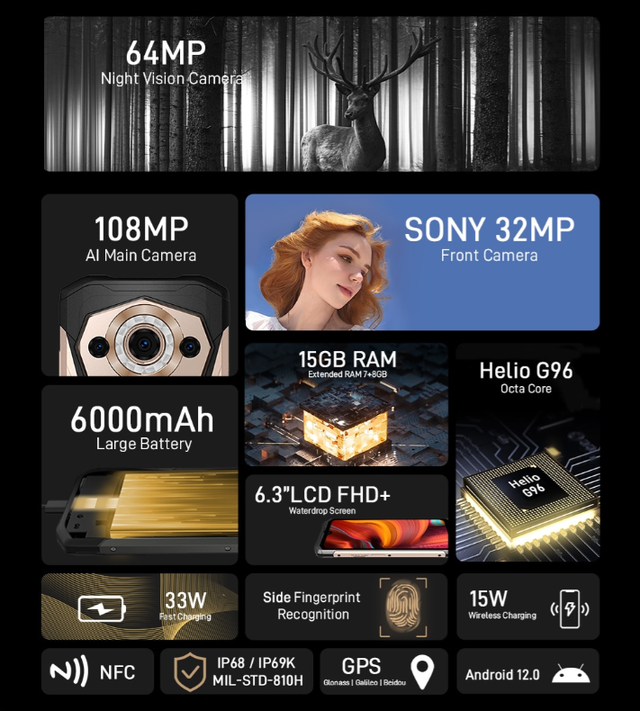 Захищений смартфон Doogee S99 дуже схожий по дизайну з попередньою моделлю, але тут величезний упор зроблений на нічну зйомку. Це одна із перших моделей, якій виділили окрему 64 Мп камеру для нічного режиму! Фото та відео виробляються в монохромному режимі, якість помітно краща, ніж у попередніх моделей. Doogee S99 виробляється в стильному корпусі, який не соромно дістати з кишені у будь-якому суспільстві. Його захист за стандартом IP69K дозволяє без проблем занурюватися у воду, а також падати на будь-які поверхні. На задній панелі розташували вставку з камерами та спалахом, реалізовано все це стильно та досить функціонально. Прогумований корпус дуже приємно лежить у руці, на передній панелі знаходиться камера всередині краплевидного вирізу - все, як і личить сучасному захищеному флагману. Флагмани початку 2023 року виявилися на стільки цікавими, що обійти стороною їх якісну камеру неможливо. Тут встановлений модуль із роздільною здатністю 108 Мп, який дозволяє без проблем знімати так добре, як ніколи раніше. Тут великий наголос зробили на чіткість, а також опрацювання тіней та яскравих ділянок. Якщо Ви спробуєте зробити фото на цей смартфон - нічого іншого не захочете. Фронтальна камера туди ж – вона дуже деталізована та промальовує навіть дрібні ділянки. Зі смартфоном Doogee S99 Ви можете не турбуватися ні про що. Акумулятора вистачить більш ніж на добу, NFC для безконтактної оплати є, а якщо подивитися на мультимедійну складову - вона чудова. Ця модель без проблем подолає різні випробування, дасть впевненість і комфорт у використанні, а також пристойний рівень якості зв'язку. Якщо Ви вибрали собі такий – значить щось точно розумієте у захищених смартфонах! ХАРАКТЕРИСТИКИ ОПЕРАЦІЙНА СИСТЕМА Операційна система — Android 12 КОРПУС Стандарт захисту — IP69K, IP68, MIL-STD-810G Захист корпусу — Водозахист, Вологозахист, Пилозахищений, Ударостійкий ЗВ'ЯЗОК Кількість SIM-карт — 2 SIM Формат SIM-карти — Nano-SIM Тип слота SIM-карт — SIM + SIM + MicroSD Стандарти зв'язку — GSM, 3G, 4G (LTE), 5G ЕКРАН Діагональ екрану — 6.3" Роздільна здатність екрана — 1080 x 2340 пікс. FHD+ Частота оновлення екрану — 60 Гц Щільність пікселів — 270 ppi Тип екрану — IPS Захисне скло — Corning Gorilla Glass 5 ПРОЦЕСОР Процесор — MediaTek Helio G96 Кількість ядер — 8 Частота процесора — 2x Cortex A76 2.05 GHz + 6x Cortex A55 2.0 GHz Графічний процесор — ARM Mali-G57 MC2 900MHz ПАМ'ЯТЬ Внутрішня пам'ять — 128 ГБ Оперативна пам'ять — 8 ГБ Слот для картки пам'яті — Є Підтримка карт пам'яті microSD — до 512 Гб КАМЕРА Камера — 108 Мп + 64 Мп + 16 Мп Фронтальна камера — 32 Мп, Sony IMX616, ƒ/ 2.0 БЕЗДРОТОВІ ТЕХНОЛОГІЇ Wi-Fi — IEEE 802.11 a/b/g/n/ac Технологія GPS — A-GPS, GPS Супутникова система — ГЛОНАСС, Бейдоу, Galileo Bluetooth — 5.1 NFC — Є Інфрачервоний порт — Немає FM-тюнер — Є VoLTE — Є ЗВУК Звук — 4 стереодинаміка з підтримкою технології smartPA ІНТЕРФЕЙСИ Інтерфейси та підключення — USB Type-C, Аудіо 3,5 ЗАХИЩЕННІСТЬ IP (ступінь захисту від проникнення) — IP68 / IP69K / Військовий сертифікат MIL-STD-810G Захист від пилу — Пил не може потрапити у пристрій. Повний захист від контакту. Захист від води — Витримує занурення на глибину до 2 м більше 30 хвилин, пристрій при цьому зберігає працездатність і може працювати в зануреному режимі. Захист від удару/падіння — Корпус і електроніка захищені від падінь і ударів, з висоти до 2 м. Скло — Гартоване удароміцне, стійке до подряпин, ударів та інших механічних впливів. Температура — від -55°C до +75°C ТЕХНОЛОГІЇ Акс