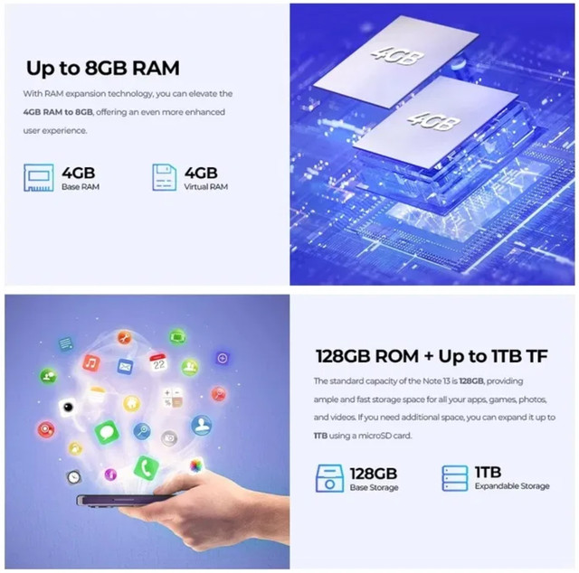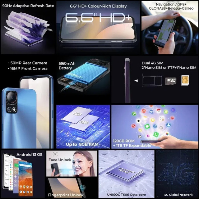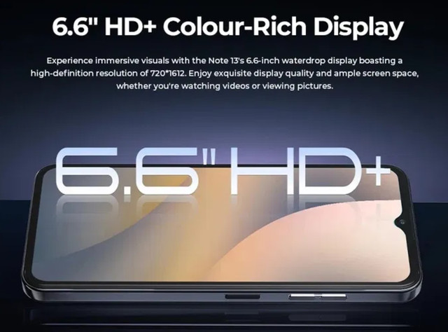 Екран (6.6", IPS, 1612х720, 90 Гц) / Unisoc Tiger T606 (1.6 ГГц) / Основна камера 50 МП + AI, Фронтальна камера: 16 МП / RAM 4 ГБ / 128 ГБ вбудованої пам'яті / 3G / 4G (LTE) / GPS / ГЛОНАСС / Galileo / BDS / Підтримка 2х SIM-карт (SIM + Гибридный (SIM или MicroSD)) / Android 13 / 5160 мА*г / 10 Вт Смартфон HOTWAV Note 13 – унікальний зразок стильного дизайну. Корпус аналогічний старшій моделі і має пластикову панель з приємним на дотик покриттям, на якому не залишаються сліди відбитків і добре переливається на сонячному світлі. Блок камер став меншим і не так виділяється з корпусу. Смартфон легкий і тонкий, з товщиною всього 8,9 мм, що забезпечує оптимальне відчуття захоплення, і він утримується в руках. Вага всього 236 грамів робить його виключно портативним, і його дизайн виділяє його серед конкурентів. HOTWAV Note 13 приносить вам задоволення від великого дисплея з роздільною здатністю HD+. Цей 6,6-дюймовий екран із співвідношенням 20:9 і яскравістю 500 нит занурить вас у захоплюючий досвід. Частота оновлення екрана 90 Гц забезпечує неймовірну плавність, роблячи кожен рух на екрані максимально реалістичним та захоплюючим. Усередині HOTWAV Note 13 працює потужний процесор Unisoc T606 з восьмиядерною архітектурою на 12 нм, забезпечуючи стабільну та високу продуктивність. Варіативна ОЗУ дозволяє настроїти пристрій до 8 ГБ (+4 ГБ), що гарантує повний та потужний досвід користувача. Базова конфігурація включає 4 ГБ ОЗУ і 128 ГБ вбудованої пам'яті. За потреби ви можете розширити сховище до 1 ТБ за допомогою картки microSD, щоб завжди було достатньо місця для програм, ігор, фотографій та відео. Камери смартфона HOTWAV Note 13 дарують можливість сфотографувати моменти максимальної деталізації. Основна 50-мегапіксельна камера зі штучним інтелектом робить кожну фотографію неймовірно виразною, захоплюючи навіть найдрібніші деталі. Фронтальна 16-мегапіксельна камера також підтримується штучним інтелектом, що гарантує високу якість селфі. HOTWAV Note 13 оснащений великою батареєю ємністю 5160 мАг, що дозволяє не турбуватися про зарядку протягом дня. Ви зможете насолоджуватися переглядом відео, прослуховуванням музики та іграми тривалий час. Підтримка швидкого заряджання потужністю 18 Вт забезпечує швидке відновлення заряду, дозволяючи залишатися на зв'язку навіть у дорозі. ОС Android 13 надає вам більший контроль над смартфоном, дозволяючи вибирати, які програми можуть отримувати доступ до вашої особистої інформації, включаючи фотографії, відео та буфер обміну. Note 13 пропонує зручні та безпечні методи розблокування за допомогою бічного сенсора відбитків пальців. Підтримка NFC та Google Pay дозволяє робити платежі за допомогою смартфона, не носячи з собою гаманець. Навігаційна система 4-в-1 підвищує точність та надійність розташування, навіть у віддалених районах, забезпечуючи надійну навігацію. ХАРАКТЕРИСТИКИ КОРПУС Матеріал корпусу — Пластик ПРОГРАМНІ ХАРАКТЕРИСТИКИ Операційна система — Android 13 ЗВ'ЯЗОК Стандарти зв'язку — 2G, 3G, 4G (LTE), VoLTE Кількість SIM-карт — 2 SIM Тип SIM-карти — Nano-SIM Тип слота — SIM + Гібридний (SIM або MicroSD) ЕКРАН Розмір екрану — 6.6" Тип матриці — IPS Роздільна здатність екрана — 1612х720 пікс.(HD+) Частота оновлення — 90 Гц Щільність пікселів — 269 ppi Яскравість екрану — 500 нит ПРОЦЕСОР Процесор — Unisoc Tiger T606 Кількість ядер — 8 Частота — 2x1.6 ГГц Cortex-A75 & 6x1.6 ГГц Cortex-A55 Графічний процесор — Mali-G57 MP1 ПАМ'ЯТЬ Оперативна пам'ять — 4 ГБ (+ 4 ГБ віртуальної пам'яті) Вбудована пам'ять — 12