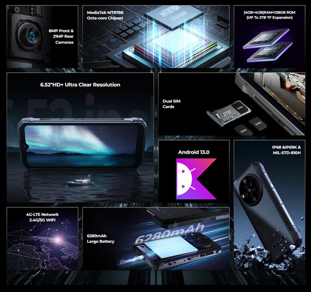 Смартфон HOTWAV T7 вирізняється високим ступенем стійкості до зовнішніх впливів, забезпечуючи йому перевагу над конкурентами. Пристрій має надійний захист від води та пилу з відповідністю стандартам IP68 та IP69K, а також відповідає військовому стандарту міцності MIL-STD-810H. Це робить його ідеальним вибором для активного способу життя, де надійність та міцність відіграють важливу роль. Перегляд контенту вимагає якісного дисплея, здатного передати всю красу зображення. У смартфоні HOTWAV T7 виробники впровадили зручний та ергономічний дисплей з діагоналлю 6.52 дюйми. Цей технологічний екран створює чудовий букет кольорів, дозволяючи вам насолоджуватися контентом з максимальним комфортом та задоволенням. До того ж він захищений спеціальним протиударним склом, що робить використання пристрою ще надійнішим та безпечнішим. Смартфон HOTWAV T7 працює на процесорі MediaTek MT8788, виконаному по 12-нм техпроцесу, спеціально розробленому для ефективного виконання ігрових та повсякденних завдань. З його восьмиядерним процесором та графічним процесором Mali-G72 MP3, він забезпечує плавну ігрову динаміку та вражаючу графіку. Не тільки для ігор - високопродуктивна архітектура MT8788 гарантує швидку реакцію в багатозадачному режимі, легко впораючись з різними програмами. З вражаючим обсягом вбудованої пам'яті в 128 ГБ, цей смартфон пропонує достатньо місця для зберігання інформації, що робить його ідеальним компаньйоном для музичних та розважальних потреб. Захоплюйте життєві моменти легко та невимушено зі смартфоном HOTWAV T7. Цей пристрій оснащений фронтальною камерою роздільною здатністю 8 МП та тиловою камерою Sony 21 МП. Фронтальна камера ідеально підходить для швидких селфі або відеодзвінків, забезпечуючи чіткість та виразність у кожному кадрі. Чудова 21-мегапіксельна задня камера захоплює яскраві кольори та дрібні деталі на всіх знімках, будь то пейзажі чи портрети. Незалежно від ситуації, HOTWAV T7 стане вашим надійним супутником для повсякденного фотографування. Насолоджуйтесь легкістю та якістю зйомки з цим зручним та надійним смартфоном. Смартфон HOTWAV T7 оснащений потужним акумулятором ємністю 6280 мАг, який забезпечує до 50 днів автономної роботи в режимі очікування. Це означає, що ви можете насолоджуватися використанням пристрою протягом 30 годин без перерви на зарядку, граючи, спілкуючись або займаючись іншими справами, не турбуючись про розрядку батареї. Тепер ваш смартфон завжди буде готовий до довгих сеансів використання без необхідності постійної підзарядки. Смартфон HOTWAV T7 має низку корисних функцій, серед яких: Ці функції роблять HOTWAV T7 ідеальним супутником не тільки у повсякденному житті, але й в екстремальних ситуаціях, коли потрібний універсальний та надійний помічник. ОПЕРАЦІЙНА СИСТЕМА Операційна система — Android 13 КОРПУС Матеріал корпусу — Метал, Авіаційний алюміній, Пластик, Полікарбонат, Гума підвищеної міцності та зносостійкості, Скло Стандарт захисту — IP68, IP69K, MIL-STD-810G Захист корпусу — Водозахист, Вологозахист, Пилозахищений, Ударостійкий ЗВ'ЯЗОК Стандарти зв'язку - GSM, 3G, 4G (LTE) Кількість SIM-карт — 2 SIM Формат SIM-карти — Nano-SIM Тип слота SIM-карт — SIM + Гібридний (SIM або MicroSD) ЕКРАН Діагональ екрану — 6.52" Тип екрану — IPS Роздільна здатність екрана — 1600х720 пікс. (20:9) Частота оновлення екрана — 60 Гц Щільність пікселів — 269 ppi Захист екрану — Asahi Glass / Dragontrail Glass Яск
