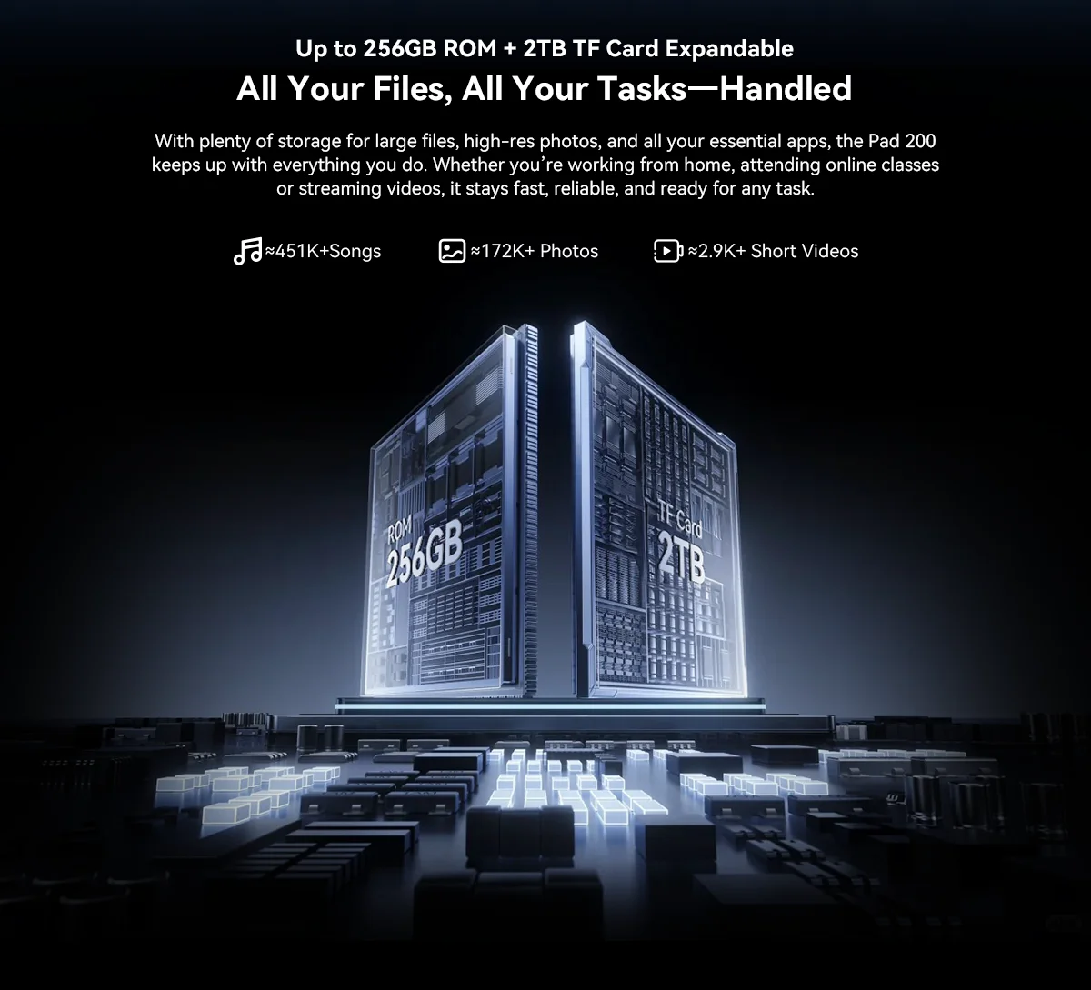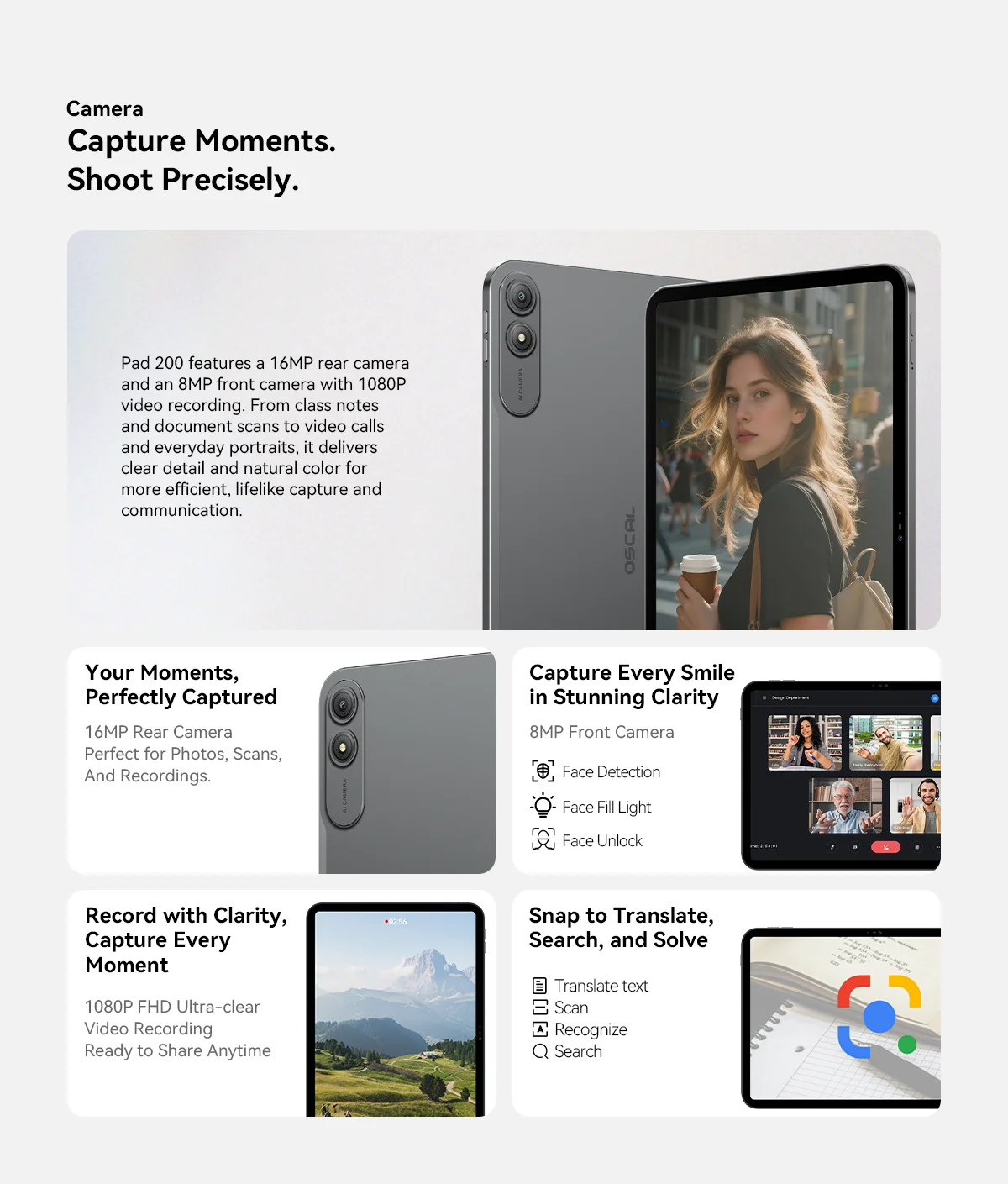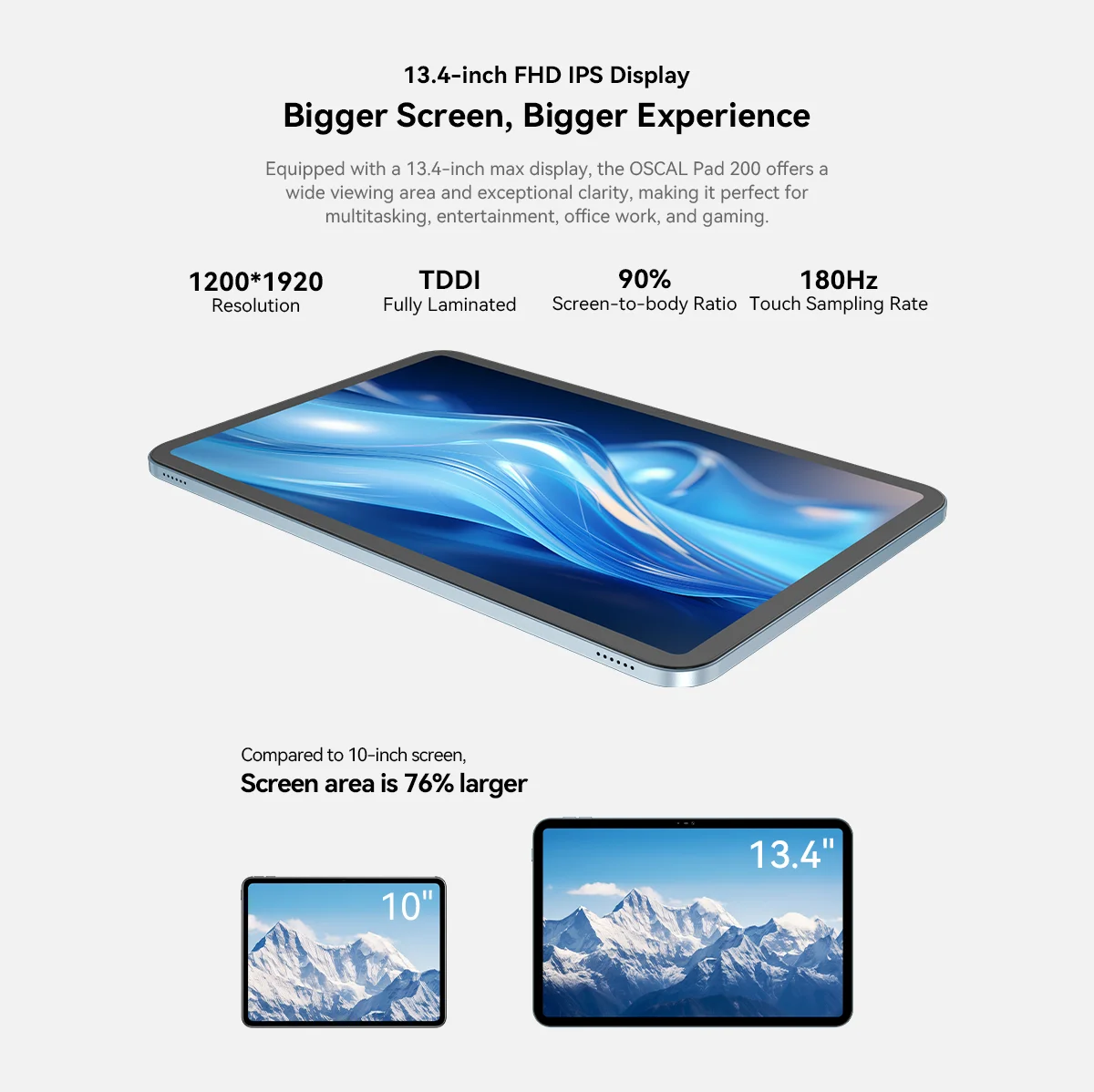 Blackview Oscal Pad 200 — це сучасний великоформатний планшет із акцентом на мультимедійність, багатозадачність і AI-можливості. Тонкий корпус товщиною лише 7,9 мм та вага близько 750 г роблять його зручним для щоденного використання вдома, в офісі чи в дорозі. Пристрій виглядає стримано й стильно у сірому або блакитному кольорі. Корпус має міцну конструкцію з якісних матеріалів, добре збалансований для тривалого утримання в руках. Планшет оснащений слотом Dual SIM, що дозволяє використовувати мобільний інтернет 4G без прив’язки до Wi-Fi — важлива перевага для поїздок і роботи поза домом. Планшет отримав великий 13,4-дюймовий IPS-екран із роздільною здатністю 1200х1920 пікселів та частотою оновлення 120 Гц. Завдяки цьому зображення виглядає плавним і чітким — ідеально для відео, ігор, браузингу та роботи з документами. Співвідношення екрана до корпусу — 90%, що створює ефект «великого полотна» для перегляду фільмів або роботи з таблицями та презентаціями. Частота опитування сенсора 240 Гц забезпечує швидку реакцію на дотик. Яскравість 350 ніт достатня для комфортного використання в приміщенні. Додаткові режими Night Light, Reading Mode та Dark Mode зменшують навантаження на очі, а AI-оптимізація контрасту допомагає під час тривалого навчання або читання. Oscal Pad 200 працює на 8-ядерному процесорі Unisoc T7280 (2×Cortex-A75 2.2 ГГц + 6×Cortex-A55 1.8 ГГц) з графікою Mali-G57 MP1. Це оптимальне рішення для щоденних завдань: навчання, офісні програми, відео, легкі ігри та мультимедіа. 6 ГБ оперативної пам’яті забезпечують плавну роботу системи та багатозадачність без затримок. Вбудоване сховище доступне у версіях 128 або 256 ГБ із можливістю розширення карткою TF до 2 ТБ — простору вистачить для фільмів, фото, навчальних матеріалів та програм. Планшет працює на Android 16 з оболонкою DokeOS 5.0, що пропонує PC Mode 3.0, Split Screen 2.0 та AI-функції, включаючи інтеграцію з Gemini AI для створення контенту, нотаток і креативних завдань. Основна камера 16 МП з автофокусом і LED-спалахом дозволяє робити чіткі фото документів, знімати відео у форматі 1080p та фіксувати важливі моменти. Це зручно для студентів, роботи з паперами чи створення контенту. Фронтальна камера 8 МП чудово підходить для відеодзвінків, онлайн-уроків, Zoom-конференцій і селфі. Підтримується AI-розпізнавання обличчя для швидкого розблокування. Інтеграція з Google Lens, ImageX та VidGen дозволяє редагувати фото, генерувати креативний контент і працювати з візуальними матеріалами без додаткового обладнання. Планшет оснащений подвійними BOX-динаміками Smart-K із AI-оптимізацією звучання. Вони забезпечують чистий, гучний і об’ємний звук для перегляду фільмів, прослуховування музики чи відеодзвінків. AI-шумозаглушення покращує якість голосу під час онлайн-спілкування навіть у шумному середовищі. Акумулятор ємністю 8300 мА·год забезпечує тривалий час роботи без підзарядки — до 23 годин прослуховування аудіо або до 5 годин активного відео. Функція AI Super Power Saving оптимізує споживання енергії для подовження автономності. Зарядка здійснюється через USB-C 2.0 з підтримкою OTG для підключення периферії. ОСНОВНЕ Операційна система — Android 16 Фірмова оболонка — Doke OS 5.0 КОРПУС Тип корпусу — Моноблок Матеріал корпусу — Пластик, Метал ЗВ'ЯЗОК Можливість здійснювати дзвінки — Є Стандарти та технології — 2G, 3G, 4G Кількість SIM-карт — 2 SIM Формат SIM-карти — Nano Тип слота SIM-карт — SIM + Гібридний (SIM або MicroSD) ЕКРАН Діагональ 