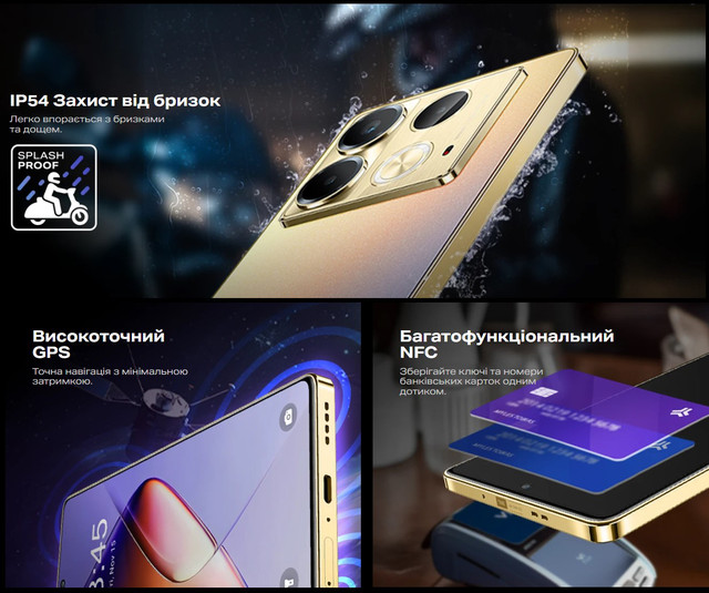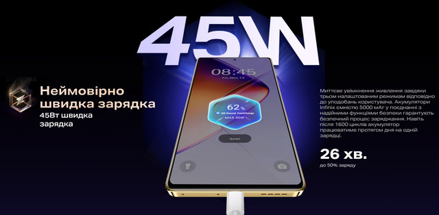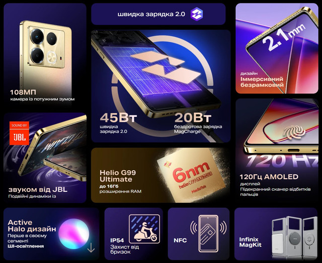 Infinix NOTE 40 – це новинка 2024 року від бренду Infinix, що поєднує передові технології та естетику. Кожна деталь є важливою, а вишуканий дизайн виражає привабливість великого міста. Яскравий AMOLED дисплей із частотою оновлення 120 Гц забезпечує чудову якість зображення, приносячи радість користувачам своєю чіткістю та яскравістю. Унікальний дизайн Unibody MDA надає пристрою неповторного візуального образу, тоді як антена, прихована під ультравузькою рамкою, додає йому єдності стилю. Представляємо 'Active Halo' – новаторське широко застосовуване ШІ-освітлення, перше у своєму сегменті. Цей інноваційний помічник, що спирається на передові технології штучного інтелекту, створює унікальні світлові ефекти, роблячи сцени ще яскравішими та живішими. Вбудований у пристрій процесор Helio G99 Ultimate пропонує потужну штучну інтелектуальну систему, що забезпечує високу продуктивність та енергоефективність. Цей чіп розроблений за технологією 6-нм, забезпечує швидку роботу пристрою та розширену підтримку широкого спектру сценаріїв штучного інтелекту. Крім того, контроль частоти кадрів XBOOST спільно з передовими розробниками ігор дозволяє досягти стабільно високої частоти кадрів у популярних MOBA та FPS-іграх. Це гарантує неперевершений ігровий досвід із максимальною продуктивністю. Можливість розширення оперативної пам'яті до 16 ГБ дозволяє миттєво запускати програми та покращує роботу в умовах багатозадачності, навіть якщо у фоновому режимі працює безліч програм. Це забезпечує надзвичайну продуктивність та дозволяє насолоджуватися безперервною роботою пристрою. Камера роздільною здатністю 108 МП у смартфоні NOTE 40 дозволяє створювати дивовижні та професійні фотографії неймовірної чіткості. Система потрійної камери відкриває перед вами чудовий світ фотографії. Завдяки 3-кратному суперзуму без втрати якості, ви можете розкрити потужність деталізації 108 мільйонів пікселів і збільшити зображення з високою чіткістю. Селфі-камера роздільною здатністю 32 МП дозволяє створювати чіткі та красиві селфі за допомогою кастомізуючих функцій, які допоможуть вам створити приголомшливий образ. Глибоке та захоплююче аудіо, забезпечуючи більш захоплюючий та потужний звук під час ігрових битв завдяки подвійним стереодинамікам та налаштованому звуку від JBL. Infinix представляє першу революційну мікросхему управління процесом заряджання - Infinix Cheetah X1. Ця передова технологія поєднує високоточне визначення потужності, універсальну підтримку сцен та модулі безпечного визначення напруги в одному чипі. Завдяки трьом налаштованим режимам відповідно до уподобань користувача, ви зможете миттєво включити живлення. Акумулятори Infinix ємністю 5000 мАч у поєднанні з надійними функціями безпеки гарантують безпечний процес заряджання. Навіть після 1600 циклів акумулятор працюватиме протягом дня на одній зарядці. Більше не потрібні дроти для підзарядки смартфона! Infinix MagKit полегшує процес зарядки - досить один раз клацнути, і все готово. Забудьте про проблеми із заряджанням смартфона завдяки керованій системі реверсивної зарядки. IP54 захист від бризок допоможе легко впоратися з бризками та дощем. Високоточний GPS забезпечить точну навігацію з мінімальними затримками. Функціональність NFC дозволяє зберігати ключі та номери банківських карток за одним дотиком. ОПЕРАЦІЙНА СИСТЕМА Операційна