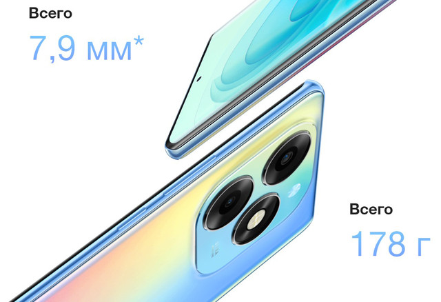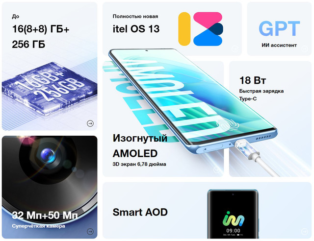 iTеl – китайська компанія, заснована у 2014 році, яка є частиною Transsion Holdings – великого міжнародного концерну, що спеціалізується на виробництві доступних за ціною мобільних пристроїв та електроніки. Transsion Holdings також володіє брендами Infinix та TECNO, пропонуючи свої продукти офіційно на ринку України. Новинка iTеl S23+, хоч і нагадує дорогий флагман, але його ціна в рази нижча, при цьому характеристики тут непогані і можуть бути привабливими для багатьох користувачів. iTеl S23+ оснащений вигнутим з обох боків AMOLED-екраном (під кутом вигину 59 °) діагоналлю 6,78 дюйма та роздільною здатністю Full HD + 2400х1080 пікселів. Цей дисплей охороняється склом Corning Gorilla Glass 5-го покоління, включає вбудований сканер відбитків пальців, і обіцяє вражаюче співвідношення екрану до корпусу в розмірі 93%. Серцем даного смартфона служить процесор Unisoc T616, восьмиядерний чіпсет із техпроцесом 12 нм. За продуктивністю він можна порівняти з чіпсетами Snapdragon 680 і Helio G85. iTеl S23+ пропонує 8 ГБ оперативної пам'яті LPDDR4X, а вбудованої 256 ГБ - для недорогого апарата значення дуже хороше. Завдяки технології Memory Fusion оперативну пам'ять можна розширити до 16 ГБ, зарезервувавши під неї частину накопичувача. Смартфон обладнаний передньою камерою з роздільною здатністю 32 мегапікселя, а задня камера отримала роздільну здатність 50 МП з яскравою діафрагмою f/1.6 та підтримкою 10-кратного цифрового зуму (хоча не оптичного). Додатковий модуль використовується для виміру глибини сцени. Телефон також обладнаний чіпом NFC та акумулятором ємністю 5000 мАг, який підтримує швидку зарядку потужністю 18 Вт через порт Type-C (зарядка до 100% займає лише дві години). iTel S23+ працює під керуванням Android 13 з оболонкою itelOS 13. Його товщина становить 7.9 мм, а вага – 178 грам. Матеріал корпусу — Пластик ПРОГРАМНІ ХАРАКТЕРИСТИКИ Операційна система — Android 13 Фірмова оболонка — itel OS 13 ЗВ'ЯЗОК Кількість SIM-карт — 2 SIM Формат SIM-карти — Nano-SIM Слот SIM-картки — SIM + SIM Стандарти зв'язку — GSM, 3G, 4G (LTE) ЕКРАН Діагональ екрану — 6.78" Тип матриці — AMOLED Роздільна здатність екрана — 2400x1080 пікс. FHD+ Частота оновлення екрану — 60 Гц Щільність пікселів — 388 ppi Яскравість екрану — 500 нит Співвідношення сторін — 20:9 ПРОЦЕСОР Процесор — Unisoc Tiger T616 Кількість ядер — 8 Частота процесора — 2x 2.0 ГГц ARM Cortex-A75, 6x 1.8 ГГц ARM Cortex-A55 Графічний процесор — ARM Mali-G57 MP1 ПАМ'ЯТЬ Оперативна пам'ять — 8 ГБ (+ 8 ГБ віртуальної пам'яті) Вбудована пам'ять — 256 ГБ Підтримка карт пам'яті — Немає КАМЕРА Основна камера — 50 МП + 0.08 МП Фронтальна камера — 32 МП КОМУНІКАЦІЇ Wi-Fi — 5 (802.11ac) GPRS — Є Навігація — GPS, GLONASS, Galileo, Baidu Bluetooth — 5.0 NFC — Є VoLTE — Є РОЗ'ЄМИ Роз'єм живлення — Type-C 2.0 Аудіо роз'єм — Немає ДАТЧИКИ Акселерометр, Датчик наближення, Датчик світла, Ліхтарик, Цифровий компас, Сканер відбитків пальців на екрані, Face ID АКУМУЛЯТОР Місткість акумулятора — 5000 mAh Потужність зарядки — 18 Вт (Блок живлення не постачається в комплекті) ГАБАРИТИ Розміри пристрою — 164.5 x 75.2 x 7.9 мм Вага пристрою — 178 р. КОМПЛЕКТАЦІЯ Смартфон, Кабель USB Type-C, Пластиковий кейс, Навушники, Скріпка для лотка сим карти, ІнструкціяiTel S23+ (plus)