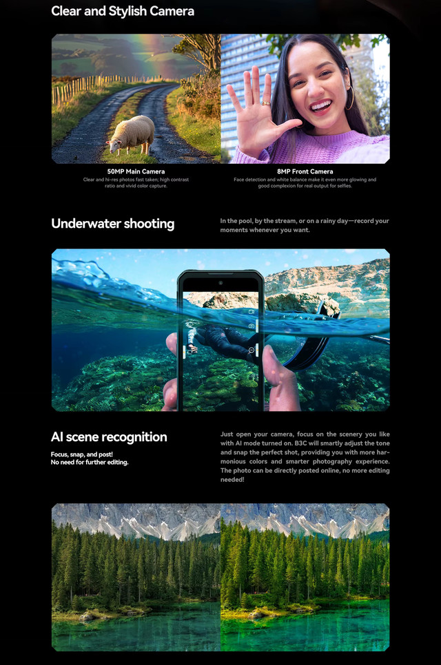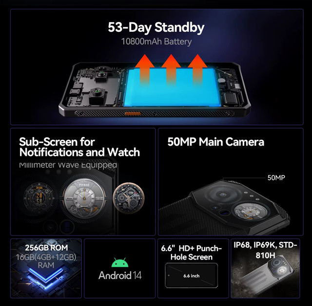 OUKITEL IIIF150 B3C – це захищений смартфон середнього класу, що відповідає стандартам захисту IP68, IP69K та MIL-STD-810H, що робить його надзвичайно стійким до зовнішніх впливів. Він витримує падіння з висоти до 1,5 м-коду, може бути занурений у воду, також здатний працювати в умовах екстремальних температур. Смартфон має 6,6-дюймовий дисплей з роздільною здатністю HD+ 720x1612 пікселів та частотою оновлення 90 Гц. Захищений міцним склом Corning Gorilla Glass, цей екран стійкий до подряпин та ударів, що робить його ідеальним для щоденного використання у різних умовах. Dynamic Island – це революційне рішення багатозадачності. Функція дозволяє отримувати повідомлення про заряд батареї, розблокування через розпізнавання обличчя та вхідні дзвінки, навіть якщо ви використовуєте інші програми. Легко перемикайтеся між завданнями одним дотиком до Dynamic Island. Вона з'являється лише тоді, коли це необхідно, допомагаючи максимально ефективно використовувати простір екрану та покращуючи ваш досвід використання. Другий 1,1-дюймовий екран додає пристрою унікальності серед конкурентів, дозволяючи зручно переглядати пропущені повідомлення, включаючи дзвінки, оповіщення та інші важливі оновлення. Це робить використання ще більш зручним та функціональним. Смартфон IIIF150 B3 – це надійний та потужний помічник, створений для тих, хто цінує продуктивність та функціональність. Пристрій оснащений восьмиядерним процесором Unisoc Tiger T606, який впевнено справляється з будь-якими щоденними та робочими завданнями. Завдяки 4 ГБ оперативної пам'яті з можливістю розширення ще на 12 ГБ за рахунок віртуальної пам'яті ви зможете комфортно працювати в багатозадачному режимі без зависань. Для зберігання ваших додатків, фото, відео та документів передбачено 128 ГБ вбудованої пам'яті – цього більш ніж достатньо для щоденного використання. Основна камера має роздільну здатність 50 МП, що дозволяє отримувати докладні та якісні знімки. Додатково, 8-мегапіксельна камера з нічним баченням та двома інфрачервоними сенсорами дозволяє робити фото навіть у повній темряві. Фронтальна камера на 8 МП підходить для селфі та відеодзвінків. Акумулятор ємністю 10800 мАг забезпечує тривалу автономну роботу, що особливо актуально за умов частих відключень електроенергії. Крім того, смартфон підтримує швидку зарядку потужністю 18 Вт, завдяки якій пристрій можна повністю зарядити за лічені хвилини, забезпечуючи безперебійну роботу протягом тривалого часу. ОПЕРАЦІЙНА СИСТЕМА Операційна система — Android 14.0 КОРПУС Стандарт захисту — IP68 / IP69K / MIL-STD-810H Захист корпусу — Водозахист, Вологозахист, Пилозахищений, Ударостійкий Матеріал корпусу — Метал, Авіаційний алюміній, Пластик, Полікарбонат, Гума підвищеної міцності та зносостійкості, Скло ЗВ'ЯЗОК Кількість SIM-карт — 2 SIM Формат SIM-карти — Nano-SIM Тип слота SIM-карти — SIM + Гібридний (SIM або MicroSD) Стандарти зв'язку — GSM, 3G, 4G (LTE) ЕКРАН Діагональ екрану — 6.6" Тип екрану — IPS Роздільна здатність екрана — 720x1612 пікс. HD+ Частота оновлення екрану — 90 Гц Щільність пікселів — 267 ppi Захисне скло — Corning Gorilla Glass 5 Міні-екран на задній кришці: Діаметр — 1,1” Відображає — циферблат, повідомлення, віджети та інша «швидка» інформація ПРОЦЕСОР Процесор — Unisoc Tiger T606 Кількість ядер — 8 Частота процесора — 2x 1.60 ГГц Cortex-A75 + 6x 1.60 ГГц Cortex-A55 Графічний процесор — ARM Mali-G57 MP1 ПАМ'ЯТЬ Внутрішня пам'ять — 128 ГБ Оперативна пам'ять