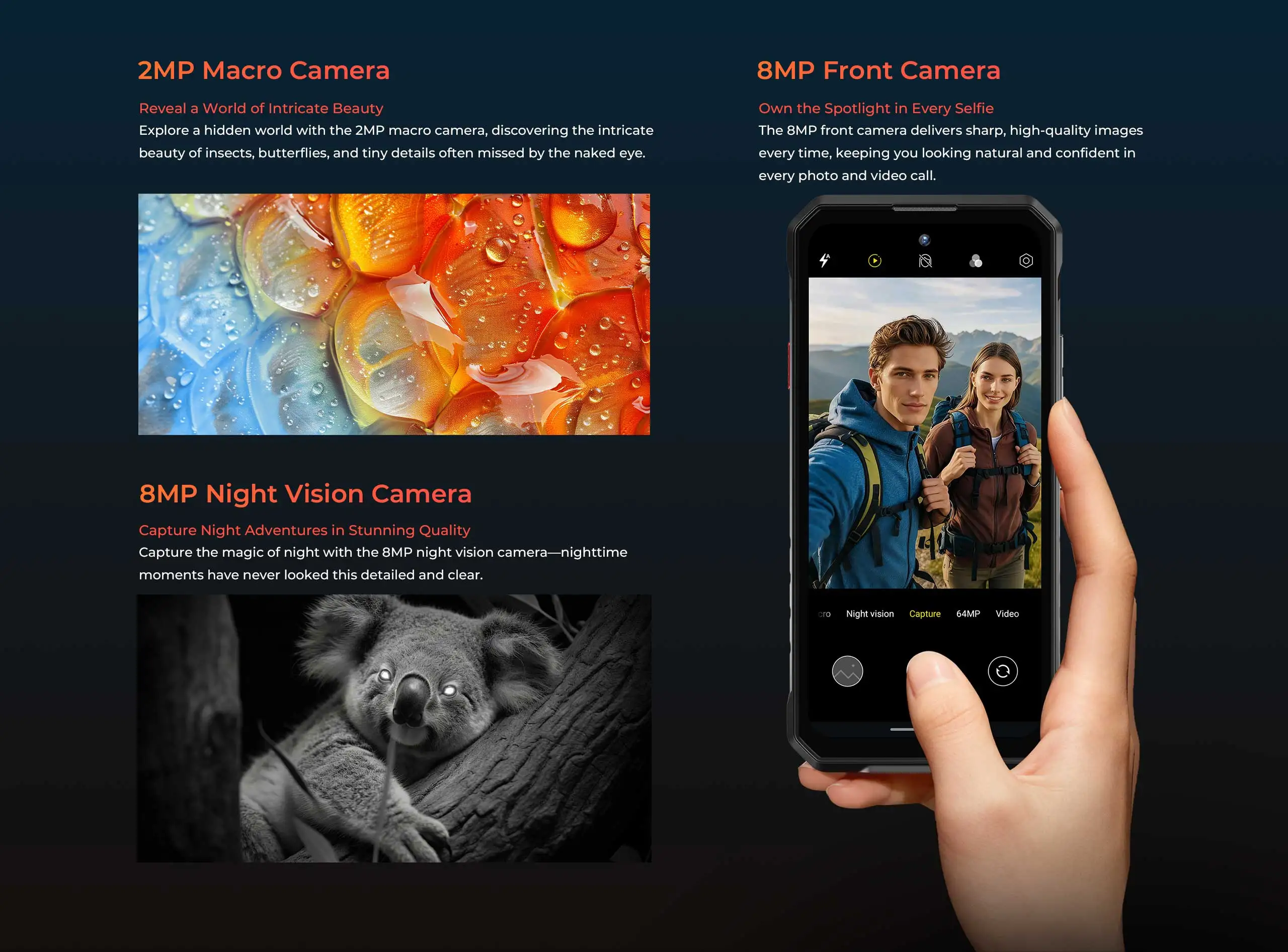 Oukitel WP58 Pro 8/512GB — це сучасний захищений смартфон, створений для роботи в екстремальних умовах. Корпус виконаний із комбінації металу, ударостійкого пластику та амортизуючої гуми, що забезпечує стійкість до падінь, ударів, тиску та механічних навантажень. Додатковий захист екрану забезпечує скло Gorilla Glass, яке захищає від подряпин і тріщин навіть при активному використанні. Смартфон отримав сертифікацію IP68, IP69K та MIL-STD-810H, що гарантує його повну водонепроникність, пилозахист і витривалість у діапазоні екстремальних температур. Oukitel WP58 Pro однаково впевнено поводиться на будівництві, у горах, під час експедицій та будь-яких умовах, де звичайні телефони просто не справляються. Модель оснащена великим 6,7-дюймовим IPS-дисплеєм із роздільною здатністю HD+ та високою щільністю пікселів 396 ppi, що забезпечує чітке та деталізоване зображення. Підтримка частоти оновлення 120 Гц робить взаємодію з інтерфейсом максимально плавною — анімації, прокрутка та ігрові сцени відтворюються без ривків. Завдяки якісній матриці з широкими кутами огляду екран залишається добре читабельним як у приміщенні, так і під сонячним світлом. Загартоване захисне скло підвищує стійкість до подряпин і сколів, що особливо важливо при роботі в польових умовах. Oukitel WP58 Pro побудований на восьмиядерному процесорі Unisoc T8200 з максимальною тактовою частотою 2,7 ГГц, який забезпечує швидку роботу інтерфейсу та впевнене виконання багатозадачних сценаріїв. Графічний прискорювач Mali-G57 MP4 підходить для сучасних мобільних ігор, картографічних сервісів, відео та вимогливих застосунків. Смартфон має 8 ГБ оперативної пам'яті з підтримкою технології віртуального розширення до 24 ГБ, що значно підвищує швидкість перемикання між задачами. Вбудоване сховище на 512 ГБ дозволяє зберігати велику кількість фото, відео та робочих файлів, а підтримка карти пам’яті обсягом до 2 ТБ перетворює телефон у повноцінне мобільне сховище. Основна камера смартфона має роздільну здатність 64 МП, що дозволяє отримувати яскраві та деталізовані знімки в будь-яких умовах освітлення. Додатковий датчик глибини 2 МП покращує портретні фото, забезпечуючи природне розмиття фону. Для нічної зйомки передбачена окрема 8 МП інфрачервона камера з двома IR-спалахами, яка здатна фіксувати деталі навіть у повній темряві — функція особливо корисна в походах, нічних патрулюваннях і польових роботах. Фронтальна камера на 50 МП забезпечує винятково високу якість селфі та відеозв’язку, точно передаючи відтінки шкіри та дрібні деталі обличчя. Усередині Oukitel WP58 Pro встановлений ємнісний акумулятор на 10 000 мА·год, який забезпечує кілька днів активної роботи без підзарядки. Це один із найкращих показників автономності у своєму класі. Смартфон підтримує: Таке поєднання робить WP58 Pro універсальним рішенням для тривалих поїздок, польових робіт та автономного проживання Oukitel WP58 Pro пропонує повний набір сучасних функцій: ОПЕРАЦІЙНА СИСТЕМА Операційна система — Android 15 КОРПУС Матеріал корпусу — Пластик, Полікарбонат, Гума підвищеної міцності та зносостійкості, Скло Стандарт захисту — IP68, IP69K, MIL-STD-810 Захист корпусу — Водозахист, Вологозахист, Пилозахищений, Ударостійкий ЗВ'ЯЗОК Стандарти зв'язку — GSM, 3G, 4G (LTE) Кількість SIM-карт — 2 SIM Формат SIM-карти — Nano-SIM Тип слота SIM-карт — SIM + Гібридний (SIM або MicroSD) ЕКРАН Діагональ екрану — 6.7" Тип екрану — I