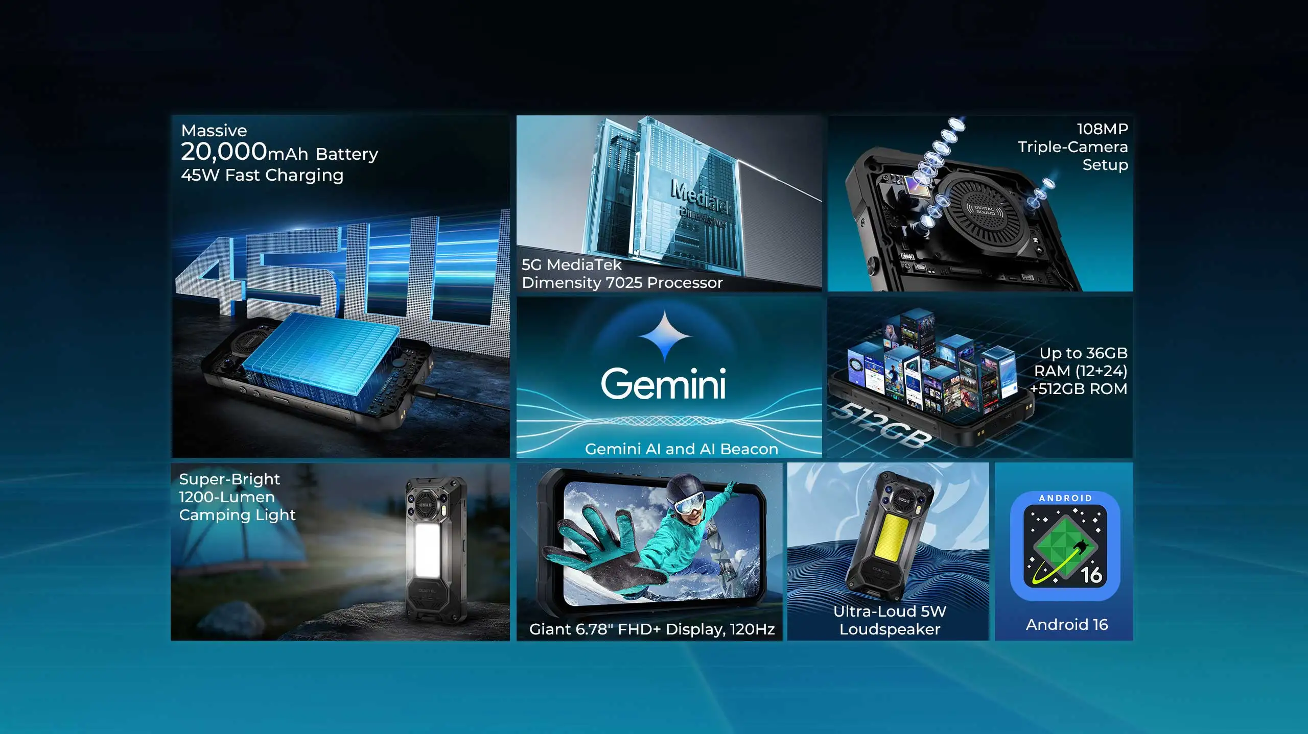 OUKITEL WP61 Ultra — це професійний захищений смартфон нового покоління з тепловізором, створений для роботи в найскладніших умовах: будівництво, енергетика, рятувальні операції, виробництво та експедиція. Масивний корпус із металевими елементами, гумовими вставками та посиленими углами гарантує максимальну витривалість та захист від механічних пошкоджень. Смартфон відповідає стандартам IP68/IP69K та MIL-STD-810H, що означає повну стійкість до води, пилу, бруду, ударів, вібрацій та перепадів температур. Це не просто смартфон — це надійний інструмент для роботи там, де звичайна техніка не витримує. Смартфон оснащений великим 6.78-дюймовим IPS-дисплеєм із роздільною здатністю 1080x2460 (FHD+) та підвищеною частотою оновлення 120 Гц, що забезпечує плавну та чітку картинку. Яскравість до 650 нит дозволяє комфортно користуватися пристроєм навіть під прямим сонцем, а Gorilla Glass 5 захищає екран від царапин та ударів. Це найкращий варіант як для роботи, так і для мультимедіа. Смартфон оснащений 6-нм процесором MediaTek Dimensity 7025 з підтримкою 5G, 12 ГБ оперативної пам'яті (з розширенням до 36 ГБ) та накопичувачем на 512 ГБ з можливістю розширення до 2 ТБ, що забезпечує високу продуктивність та величезний обсяг для зберігання даних. Пристрій орієнтований на професійне використання та роботу в суворих умовах. Фотографічні можливості представлені потужними камерами, де головну роль відіграє основний сенсор на 108 МП, що створює деталізовані знімки професійної якості навіть у складних погодних умовах. Для роботи у повній темряві передбачено спеціалізовану 8-мегапіксельну камеру нічного бачення з ІЧ-підсвічуванням, яка дозволяє чітко бачити об'єкти там, де людське око безсиле, а за бездоганні селфі та якісний відеозв'язок відповідає фронтальний модуль на 32 МП. Такий арсенал оптики перетворює захищений смартфон на універсальний інструмент для фіксації пригод та робочих процесів у будь-який час доби. Тепловізор у OUKITEL WP61 Ultra — це повноцінний професійний модуль на базі сенсора InfiRay, який забезпечує точне виявлення температурних змін у режимі реального часу навіть у повній темряві, димі чи тумані: роздільна здатність 256х192, чутливість NETD <50 мК, спектральний діапазон 8–14 мкм, кут огляду 56°, вимірювання температур від -10°C до +550°C з точністю до ±0,5°C (для тіла) та ±2°C (для технічних задач); підтримуються різні режими відображення (ІЧ, RGB, MIX, PIP), що дозволяє аналізувати об’єкти, знаходити витоки тепла, перевіряти електрообладнання, контролювати будівлі та ефективно працювати в складних умовах. Однією з особливостей смартфону є його безпрецедентна оснащеність для польових умов: смартфон обладнаний надпотужним кемпінговим ліхтарем на 1200 люмен, який здатний повністю висвітлити стоянку або робочу зону на десятки метрів вперед, і неймовірно гучним динаміком з піковою потужністю. Такий рівень гучності перевершує звук сирени і дозволяє чітко чути повідомлення або співрозмовника в умовах сильного промислового шуму, штормового вітру або використовувати пристрій як ефективний сигнал тривоги в екстреній ситуації Неймовірну автономність OUKITEL WP61 Ultra забезпечує колосальний акумулятор ємністю 20 000 мАг, що дозволяє смартфону працювати до трьох місяців у режимі очікування або кілька днів у режимі екстремальних навантажень без підзарядки. У комплекті йде потужний блок живлення на 45 Вт для оперативн