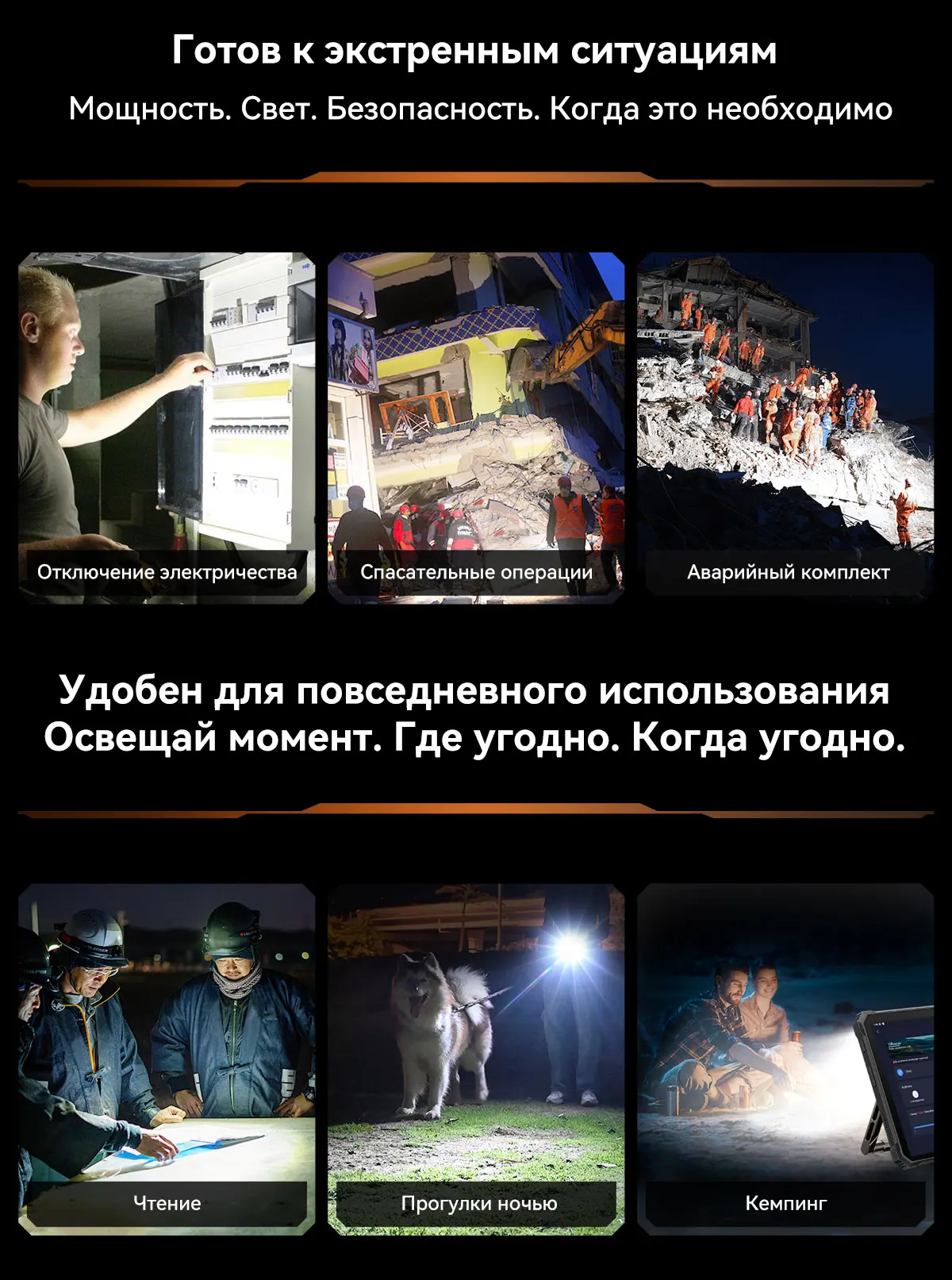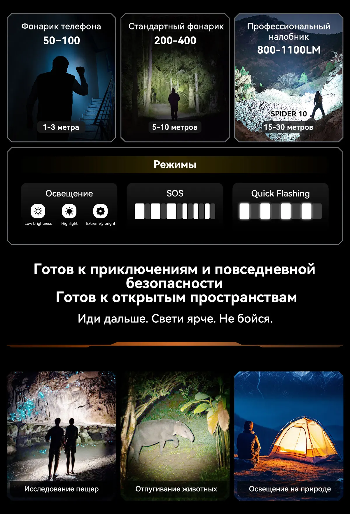 Кемпінговий ліхтарик — Яскравість: 800 - 1100 люмен, Режими: Ліхтарик телефону (50 - 100 Люмен): 1 -3 м, Стандартний ліхтарик (200 - 400 Люмен): 5 - 10 м, Професійний налобник (800 - 1100 Люмен): 15 - 30 м Кнопка, що настроюється ЗВУК