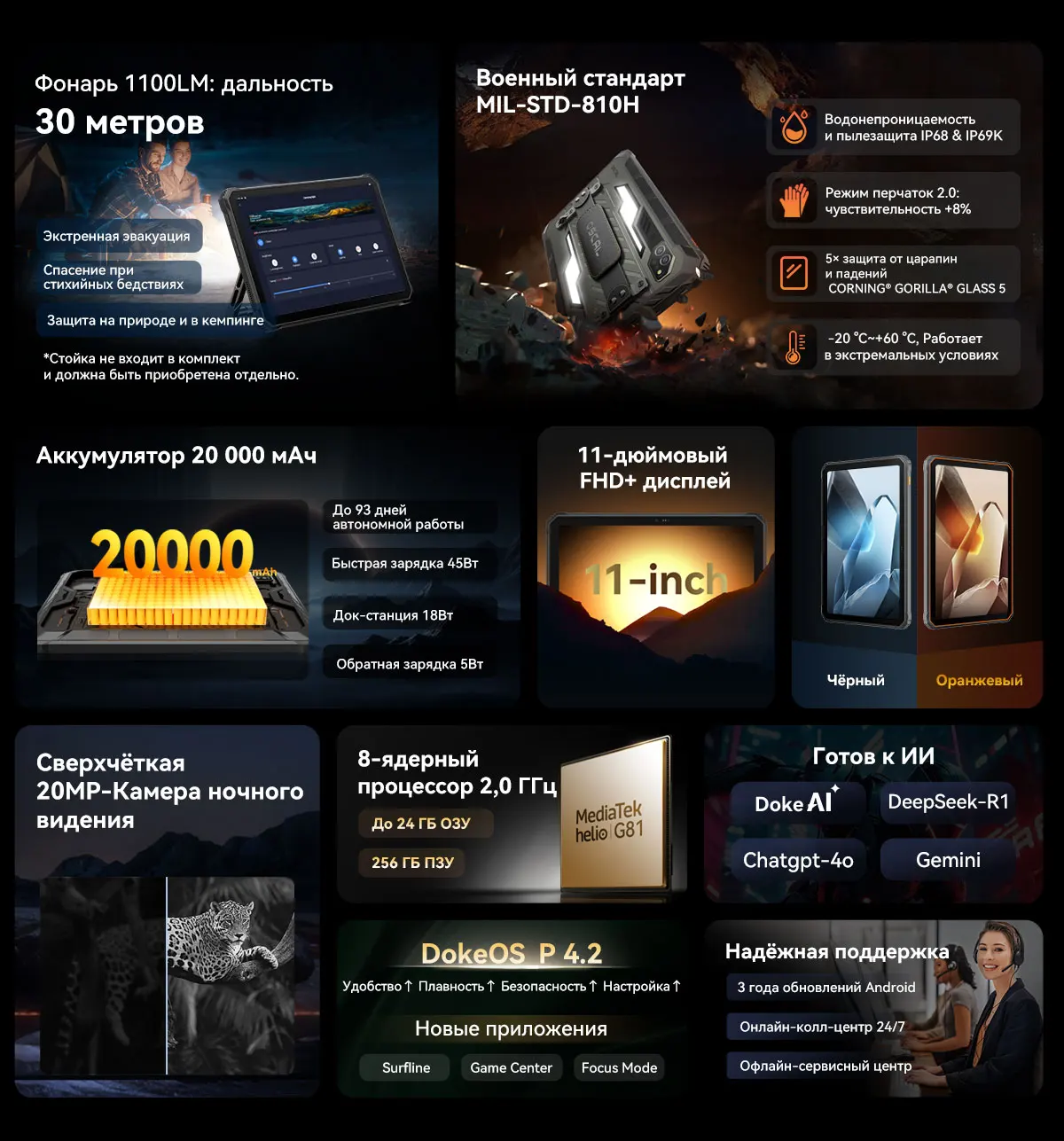 Планшет, USB кабель, Блок живлення, Викрутка, Стілус, Ремінець на зап'ястя, Перехідник Type-C/USB, Інстумент для вилучення лотка з SIM картами, Інструкція