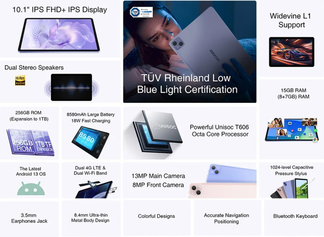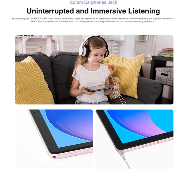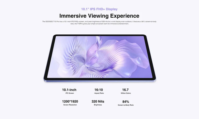 Doogee T10 Pro 8/256GB – це логічне продовження популярної моделі Doogee T10, що є сучасним дизайном та інноваційними функціями, що зробили його лідером у своїй ціновій категорії. Кожна деталь цього планшета витримана у стилі та красі! Виготовлений із високоякісних матеріалів, Doogee T10 Pro відрізняється першокласною якістю складання, що характерно для всієї лінійки продукції Doogee. Доступний у трьох приголомшливих кольорах: чорному (Black), рожевому (Pink) та фіолетовому (Purple), він має витончені розміри 242.3 x 161.5 x 8.5 мм і вагою всього 568 грам, що робить його зручним для перенесення та використання в будь-якому місці. Дисплей, що є обличчям усіх планшетів, у Doogee T10 Pro також на найвищому рівні! 10.1-дюймовий IPS екран з роздільною здатністю 1200×1920 пікселів забезпечує яскраві та насичені кольори, а сертифікація TÜV SÜD blue light гарантує захист очей користувача або дитини при тривалому використанні пристрою. Однак варто відзначити, що процесор залишився тим самим, що й у попередній моделі Doogee T10. Усередині Doogee T10 Pro 8/256GB працює процесор Unisoc T606 з 8 ядрами та максимальною частотою 1.6 ГГц. Це забезпечує плавну роботу додатків, швидкий відгук та здатність до багатозадачності, хоча планшет може відчувати труднощі із сучасними вимогливими іграми. Завдяки збільшеному об'єму вбудованої пам'яті до 256 ГБ Doogee T10 Pro надає величезний простір для зберігання даних. За потреби її можна розширити за допомогою карти MicroSD до 1024 ГБ, забезпечуючи максимальну гнучкість у використанні. Doogee T10 Pro обладнаний основною камерою на 13 Мп та фронтальною камерою на 8 Мп, що дозволяє створювати чудові фотографії та відео. Ви зможете відобразити кожну важливу мить і ділитися ними з друзями та родиною. А зі збільшеною ємністю акумулятора до 8580 мАг, планшет готовий до роботи весь день з ранку до вечора, не вимагаючи постійної підзарядки. При менш інтенсивному використанні пристрій може працювати 2-3 дні без необхідності підзарядки. Насолоджуйтесь високоякісним стереозвуком під час прослуховування музики, перегляду фільмів та ігор на Doogee T10 Pro. Незважаючи на тренд відмови від роз'єму 3.5 мм, виробник реагує на потреби користувачів, зберігаючи 3.5-міліметровий роз'єм для навушників Doogee T10 Pro, забезпечуючи можливість насолоджуватись музикою у будь-який час без необхідності використання адаптерів. Doogee T10 Pro — універсальний пристрій, який повністю задовольняє всі вимоги сучасного користувача, поєднуючи в собі стиль, продуктивність та безліч додаткових функцій! ОСНОВНЕ Операційна система — Android 13 КОРПУС Тип корпусу — Моноблок Матеріал корпусу — Алюмінієвий сплав КОМУНІКАЦІЇ Кількість SIM-карт — 2 Тип SIM-карток — nanoSIM Тип слота — SIM + Гібридний (SIM або MicroSD) GSM-модуль — Є Стандарти зв'язку — 3G, 4G (LTE) ЕКРАН Діагональ екрану — 10.1" Роздільна здатність екрана — 1920x1200 пікс. Тип екрану — IPS Щільність пікселів — 224 ppi Частота оновлення — 60 Гц ПРОЦЕСОР Процесор — Unisoc Tiger T606 Кількість ядер — 8 ядер Частота процесора — 2x 1.6 ГГц ARM Cortex-A75, 6x 1.4 ГГц ARM Cortex-A55 Графічне ядро — ARM Mali-G57 MP1 ПАМ'ЯТЬ Внутрішня пам'ять — 256 ГБ Оперативна пам'ять — 8 ГБ (+ 7 ГБ віртуальної пам'яті) Підтримка карт пам'яті — Є, MicroSD до 1 ТБ КАМЕРА Задня камера — 13 МП + 2 МП Фронтальна камера — 8 МП БЕЗДРОТОВІ ТЕХНОЛОГІЇ Bluetooth — 5.0 Wi-Fi — 5 (802.11aс) GPS — A-GPS, GLONASS, BeiDou VoLTE — Є NFC — Немає ІНТЕРФЕЙС / РОЗ'ЄМИ Роз'єм живлення — Type-C Роз'єм під навушники — Є, mini-Jack (3.5 мм) ЗВУК Стереозвук — Є ДАТЧИКИ Да