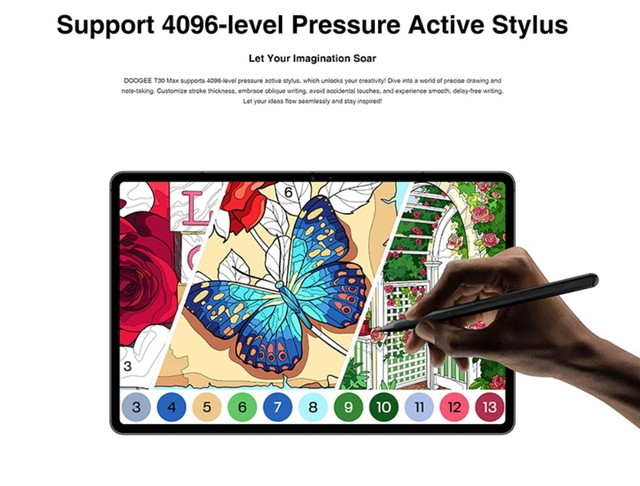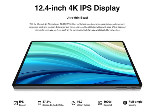 Doogee T30 Max вражає сучасним та елегантним дизайном. З перших моментів використання стає зрозуміло, що перед вами висококласний планшет, виготовлений із першокласних матеріалів. Ця новинка представлена в декількох колірних варіантах: чорному (Black), зеленому (Green) та кольорі хакі (Khaki), що дає змогу вибрати опцію, що відбиває ваші уподобання та стиль. Габарити Doogee T30 Max великі: 285.1 x 185.4 x 7.9, і його легка вага становить 678 грамів. Ергономічний дизайн забезпечує зручне та комфортне використання, піднімаючи стиль планшета на нову висоту. Doogee T30 Max пропонує захопливий екран із діагоналлю 12.4 дюйма та потужною роздільною здатністю 2560x1600 пікселів. Цей широкий дисплей забезпечує чітке та яскраве зображення з високою деталізацією, надаючи перегляду контенту на пристрої справжнє задоволення. Технологія IPS гарантує природне передавання кольорів, а якість зображення Doogee T30 Max залишається незмінною навіть у разі різких кутів огляду. Екран цього планшета дійсно вражає, і в цьому важко засумніватися. Планшет обладнаний потужним процесором MediaTek Helio G99, який забезпечує високу продуктивність і бездоганну роботу пристрою. З частотою роботи до 2.2 ГГц і 8 ГБ оперативної пам'яті, що працює під керуванням новітньої операційної системи Android 14, планшет забезпечує швидкий запуск застосунків, плавний відгук і видатну ігрову продуктивність. Doogee T30 Max легко справляється з найвимогливішими застосунками, забезпечуючи комфортне використання вдома, в офісі або в дорозі. З великими 512 ГБ вбудованої пам'яті у вас буде вдосталь місця для всіх ваших даних. Doogee T30 Max обладнаний високоякісною камерною системою, яка дасть змогу зобразити всі яскраві моменти життя. Задній блок із двома об'єктивами — 50 МП основної та 2 МП допоміжної камер, дає змогу створювати професійні знімки з ефектом боке та безліччю інших можливостей. Фронтальна камера з роздільною здатністю 20 МП ідеально підходить для відеодзвінків та якісних селфі. Незалежно від умов освітлення, камери планшета можуть легко створювати видатні фотографії та відео, які збережуть ваші спогади назавжди. DOOGEE T30 Max обладнаний потужним і ємним акумулятором ємністю 10800 мА·год, що забезпечує до трьох діб автономної роботи на одному заряді. Крім того, Doogee T30 Max пропонує безліч цікавих можливостей, які роблять ваше життя зручнішим і різноманітнішим. Серед них: підтримка швидкого заряджання потужністю 33 Вт, сканер відбитків пальців для максимальної безпеки, а також підтримка різних навігаційних систем, включно з GPS, ГЛОНАСС, BeiDou та Galileo, і швидкий LTE-інтернет. ОСНОВНОЕ Стандарти та технології — 3G, 4G (LTE) Операційна система — Android 14 Кількість SIM-карток — 2 SIM Формат SIM-картки — Nano Тип слота SIM-карт — SIM + Гібридний (SIM або MicroSD) Тип корпусу — Моноблок Матеріал корпусу — Алюмінієвий сплав, Штучна шкіра Захищеність — Немає ЕКРАН Діагональ екрана — 12.4" Роздільна здатність екрана — 2560x1600 пікс. Тип екрана — IPS Щільність пікселів — 243 ppi ПРОЦЕССОР Процесор — MediaTek Helio G99 Кількість ядер — 8 ядер Частота процесора — 2x 2.2 ГГц Cortex-A76 + 6x 2.0 ГГц Cortex-A55 Графічне ядро — Mali-G57 MC2 ПАМ'ЯТЬ Внутрішня пам'ять — 512 ГБ Оперативна пам'ять — 8 ГБ (+ 8 ГБ віртуальної пам'яті) Підтримка карт пам'яті — Є MicroSD можливе розширення — до 2 ТБ КАМЕРА Задня камера — 50 МП + 2 МП Автофокус, LED-спалах, Діафрагма Так/2.0, Панорамне знімання, HDR-знімання, налаштування ISO Записування відео — FullHD 1920x1080 Ф