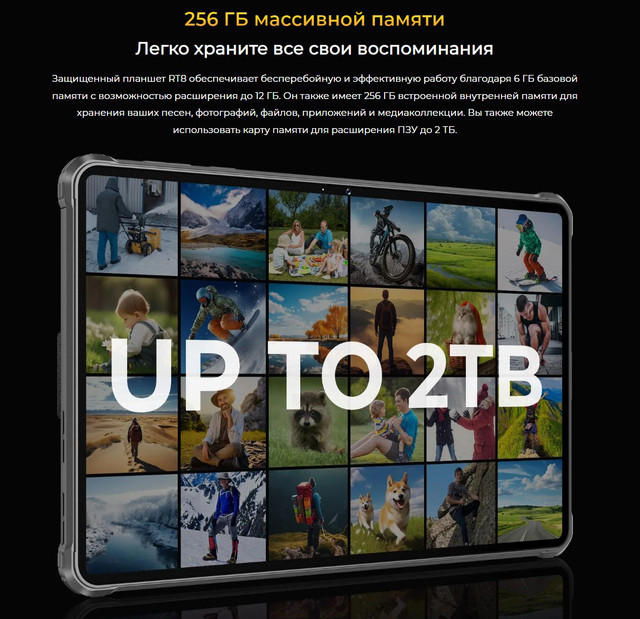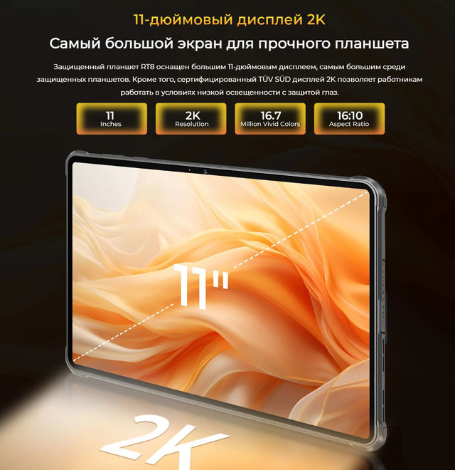 Oukitel RT8 – захищений планшет, що пропонує користувачам унікальні можливості. Хоча ця модель зазнала деяких змін порівняно з попередніми моделями, вона залишається надійним пристроєм, адаптованим до різних умов. Незважаючи на зменшення автономності та зміни в процесорі, Oukitel RT8 оснащений модулем NFC, що дозволяє користувачам легко здійснювати бездротові платежі та взаємодіяти з іншими пристроями. Цей планшет має високий рівень захисту за стандартом IP69K, що означає, що він стійкий до дії води і може витримати падіння з висоти до 1,5 метра. Крім того, його технічні характеристики усередині теж вражають. Oukitel RT8 оснащений 11-дюймовим дисплеєм з роздільною здатністю 2K та IPS-матрицею, що забезпечує користувачу яскраві, насичені кольори та відмінну якість зображення. Цей екран дозволяє повністю насолодитися мультимедіа-вмістом та деталізованими зображеннями, надаючи приємний досвід під час перегляду. Особливою перевагою пристрою є додатковий тримач, що покращує мобільність та зручність використання планшета. Ця функція дозволяє легко переміщувати пристрій або використовувати його в різних положеннях для максимальної зручності користувача. Oukitel RT8 оснащений процесором MediaTek Helio G99, який забезпечує стабільну та ефективну роботу пристрою. Цей чіпсет добре зарекомендував себе в різних пристроях завдяки оптимальному співвідношенню продуктивності та енергоспоживання. Планшет має 6 ГБ оперативної пам'яті, що достатньо для забезпечення стабільної роботи системи та всіх додатків, включаючи ігри. Вбудованої пам'яті об'ємом 256 ГБ достатньо для зберігання великої кількості файлів та програм. Планшет працює на операційній системі Android 13, яка забезпечує доступ до останніх функцій та оновлень, а також підвищену безпеку та продуктивність. Android 13 практично не має недоліків, забезпечуючи комфортне використання планшета. Oukitel RT8 оснащений основною камерою з роздільною здатністю 48 МП, 20 МП камера нічного бачення та 5 МП макрокамера, що забезпечує високу якість фотографій як вдень, так і вночі. Це робить планшет ідеальним вибором для тих, хто любить фотографувати та прагне створювати якісні знімки у різних умовах освітлення. Фронтальна камера з роздільною здатністю 32 МП дозволяє створювати вражаючі селфі, які здивували ваших друзів. Висока роздільна здатність забезпечує чіткість і деталізацію, підкреслюючи всі риси та вирази на знімках. Oukitel RT8 - це планшет з великою ємністю акумулятора в 20000 мАг, що забезпечує достатню автономність для роботи протягом 7-8 годин у різних додатках. Планшет заряджається через 3 години завдяки блоку живлення потужністю 33 Вт, що дозволяє швидко повернути пристрій до роботи. Товщина планшета складає 15,1 мм, що робить його зручнішим у використанні порівняно з попередньою моделлю. Це дозволяє користувачам зручно тримати пристрій у руках і брати його із собою в дорогу. ОСНОВНЕ Операційна система — Android 13 Інтерфейс користувача — Doke OS 3.0 КОРПУС Тип корпусу — Моноблок Матеріал корпусу — Полікарбонат, пластик, метал Захищеність — Пило-вологозахист: IP68; IP69K, ударозахист: MIL-STD-810; MIL-STD-810H ЗВ'ЯЗОК Можливість здійснювати дзвінки — Є Стандарти та технології — 2G, 3G, 4G Кількість SIM-карт — 2 SIM Формат SIM-карти — Nano Тип слота SIM-карт — SIM + Гібридний (SIM або MicroSD) ЕКРАН Діагональ екрану — 11" Роздільна здатність екрана — 1920x1200 пікс. Тип екрану — IPS Щ
