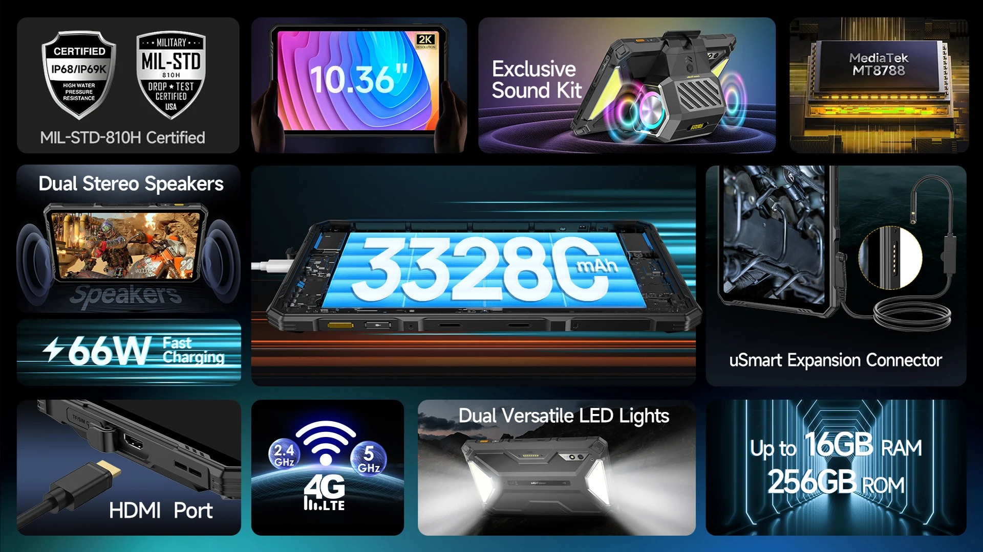 Ulefone Armor Pad 3 Pro — захищений планшет із найбільшим акумулятором на момент анонсу, але крім автономності він має й інші переваги. Дисплей Ulefone Armor Pad 3 Pro має діагональ 10,36 дюйми, що забезпечує великий робочий простір для різних завдань. Яскравість дисплея знаходиться у межах середніх показників, що дозволяє зручно працювати навіть на вулиці. Роздільна здатність екрану становить 2000×1200 пікселів, а матриця IPS гарантує чудові кути огляду і насичену кольору, характерну для пристроїв Ulefone. Захист від ударів забезпечується склом Gorilla Glass 5, який відрізняється високою стійкістю до подряпин, зберігаючи екран у відмінному стані навіть після тривалого використання. Частота оновлення екрана складає стандартні 60 Гц. З точки зору швидкодії, Ulefone Armor Pad 3 Pro є стандартним пристроєм без будь-яких особливих переваг. Хоча процесор і восьмиядерний, це досить простий чіп MT8788, який підходить для роботи в багатьох додатках. Його основними перевагами є низьке енергоспоживання та відсутність перегріву під час роботи. Операційна система Android 13, 8 ГБ оперативної пам'яті та 256 ГБ вбудованої пам'яті – це стандартні характеристики для сучасного гаджета, що забезпечують комфортну роботу. Одна з ключових переваг Ulefone Armor Pad 3 Pro – камери. Основна камера здатна робити фотографії з роздільною здатністю 50 МП, що є чудовим показником навіть для смартфонів. Вона забезпечує високу чіткість, особливо під час зйомки великих об'єктів на невеликій відстані. Відеозапис ведеться у форматі FullHD із частотою 30 кадрів за секунду. Фронтальна камера має роздільну здатність 32 МП і є одним із найкращих модулів серед планшетів в цілому. Вона підходить не тільки для селфі, але і для роботи та відеоконференцій, що робить її дуже практичною. Виробник встановив два потужні ліхтарі, кожен з яких випромінює неймовірно яскраве світло – 1100 люменів. Спільно вони забезпечують відмінне освітлення, достатнє навіть для цілої житлової кімнати. Яскравість можна регулювати через спеціальну програму, тому немає необхідності використовувати максимальну потужність – можна налаштувати рівень освітлення відповідно до ваших потреб. Що стосується аудіо, то симетричні подвійні динаміки на передній панелі забезпечують гучний стереозвук з покращеною чіткістю та збалансованим відтворенням частот, створюючи ефект просторового звуку. Це гарантує цікавий мультимедійний досвід без необхідності використання навушників. Вбудований акумулятор планшета має ємність 33280 мАг, що є рекордним показником серед захищених планшетів 2024 року. Такий запас енергії дозволяє безперервно відтворювати відео протягом 18 годин, а працювати у додатках – понад 15 годин. Заряджається планшет досить швидко завдяки зарядному блоку потужністю 66 Вт, що входить в комплект. Однак слід враховувати, що через великий акумулятор вага Ulefone Armor Pad 3 Pro перевищує 1 кг, що може бути недоліком для деяких користувачів. Швидке бездротове з'єднання доступне всюди. Armor Pad 3 Pro оснащений підтримкою 4G LTE для двох SIM-карток, а також Wi-Fi 2,4 ГГц та 5 ГГц. Це дозволяє залишатися на зв'язку в дорозі та легко отримувати доступ до контенту та оновлювати його у режимі реального часу. ОСНОВНЕ Операційна система — Android 13 Інтерфейс користувача — Doke OS 3.0 КОРПУС Тип корпусу — Моноблок Матеріал корпусу — Полікарбонат, пластик Захищеність — Пило-вологозахист: IP68; IP69K, ударозах