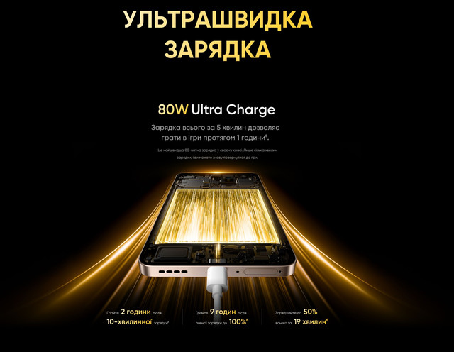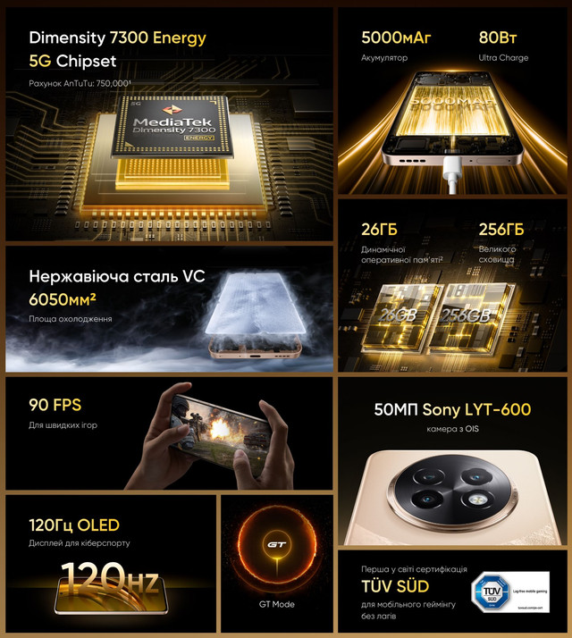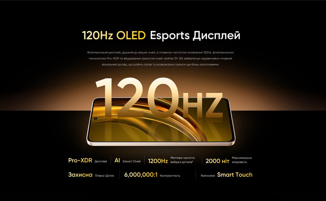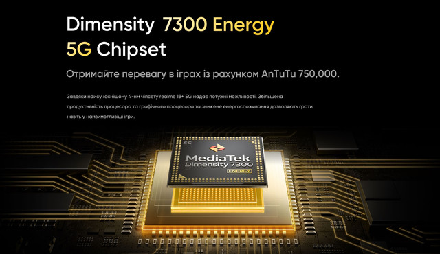 Екран (6.67", OLED, 2400х1080, 120 Гц) / MediaTek Dimensity 7300 (2.5 ГГц) / Основна камера 50 МП + 2 МП + 0.3 МП, Фронтальна камера: 16 МП / RAM 8 ГБ / 256 ГБ вбудованої пам'яті / 3G / 4G (LTE) / 5G / GPS / ГЛОНАСС / Galileo / BDS / Підтримка 2х SIM-карт (SIM + Гібридний (SIM або MicroSD))/ Android 14, Realme UI 5.0 / 5000 мА*год / 80 Вт Новий смартфон REALME 13+ (PLUS) 5G призначений для тих, хто цінує сучасні технології та неперевершений комфорт у повсякденному використанні. З найновішим чіпсетом Dimensity 7300, яскравим 120 Гц OLED-екраном та підтримкою 5G, цей пристрій поєднує продуктивність, стильний дизайн та інноваційні функції, що роблять його ідеальним вибором для роботи, розваг та спілкування. REALME 13+ (PLUS) 5G оснащений 120 Гц OLED-екраном розміром 16.94 см (6.67 дюйма), який ідеально підходить для ігор та мультимедіа. Завдяки яскравості 600 ніт у типовому режимі і пікової 2000 ніт, дисплей забезпечує чудову видимість навіть під яскравим сонцем. Частота оновлення до 120 Гц і частота відгуку на дотик до 180 Гц (з миттєвою реакцією до 1200 Гц) 1080x2400 FHD+, контрастність 6,000,000:1 та співвідношення екрана до корпусу 92. Функція Rainwater Smart Touch дозволяє комфортно використовувати пристрій навіть в умовах дощу або високої вологості, що робить дисплей ідеальним для будь-яких ситуацій. Апарат оснащений потужним чіпсетом Dimensity 7300 Energy 5G, створеним за 4-нм техпроцесом. Восьмиядерний процесор працює з максимальною частотою до 2.5 ГГц, а графічний прискорювач Arm® Mali-G615 забезпечує відмінну продуктивність у графічно насичених задачах, таких як ігри та мультимедіа. Смартфон пропонує комбінації пам'яті з 8 ГБ оперативної пам'яті (LPDDR4X) та 256 ГБ вбудованого сховища (UFS 3.1), що гарантує швидкість програми та високу ємність для зберігання файлів. Завдяки функції динамічної оперативної пам'яті її обсяг може бути збільшений до 18 ГБ (18 ГБ фізичної + 10 ГБ віртуальної), що забезпечує неймовірну багатозадачність та стабільність роботи системи. Смартфон REALME 13+ (PLUS) 5G оснащений передовими камерами для створення якісних фото та відео. Основна камера використовує 50-МП сенсор Sony LYT-600 із підтримкою OIS (оптична стабілізація зображення). фокусна відстань 26 мм та 5P-лінза. фоторежим, відео, нічний, портретний, панорама, професійний, високу деталізацію, повільний рух, нахил-зміщення, тривалу експозицію, таймлапс, кінорежим, відео з подвійною камерою, сканер документів та Google Lens. @60/30fps, 720P @60/30fps зі стабілізацією EIS/OIS. Фронтальна камера на 16 МП з діафрагмою f/2.4, кутом огляду 82.3° та 5P-лінзою підтримує режими: фоторежим, відео, портретний, нічний, панораму, таймлапс та відео з подвійною камерою. Вона записує відео у форматах 1080P@30. 30fps за замовчуванням. Обидві камери забезпечують високу деталізацію та чіткість знімків, а широкий набір режимів робить смартфон ідеальним вибором для фото- та відеозйомки. Смартфон оснащений акумулятором ємністю 5000 мАг, що забезпечує тривалу автономну роботу. Завдяки технології 80 Вт Ultra Charge пристрій швидко заряджається, дозволяючи залишатися на зв'язку навіть за мінімального часу на підзарядку. У комплекті передбачений адаптер для заряджання потужністю 80 Вт, а для зручності використовується порт USB Type-C. ХАРАКТЕРИСТИКИ КОРПУС Матеріал корпусу — Пластик, Скло, Метал, Штучна шкіра Ступінь захисту — IP65 (Захист від бризок і пили) ПРОГРАМНІ ХАРАКТЕРИСТИКИ Операційна система — Android 14 Фірмова оболонка — Realme UI 5.0 ЗВ'ЯЗОК Стандарти зв'язку — G, 3G, 4G (LTE), 5G Кількість SIM-карт — 2 SIM Тип SIM-карти — Nano-SIM Ти