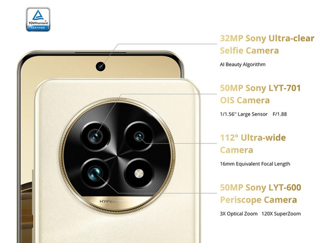 50 МП (Телеоб'єктив): 4-елементна лінза, Сенсор: Sony LYT-600, Датчик: CMOS (1/1,95"), Фокусна відстань: 73 мм. Діафрагма f/2.65, Кут огляду: 32.8°, 3x Оптичний зум