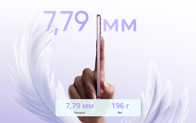 Цей смартфон важить всього 196 грамів і має товщину 7,79 мм – він легкий, тонкий та по-справжньому зручний. І водночас виглядає привабливо. Його дизайн Light Feather, натхненний птахами пір'ям, відтворює на задній панелі малюнок, який переливається як живий залежно від світла і кута огляду. А вбудований світловий індикатор Pulse Light дозволяє вибрати колір і режим свічення для повідомлень, надаючи ще більше індивідуальності пристрою.
