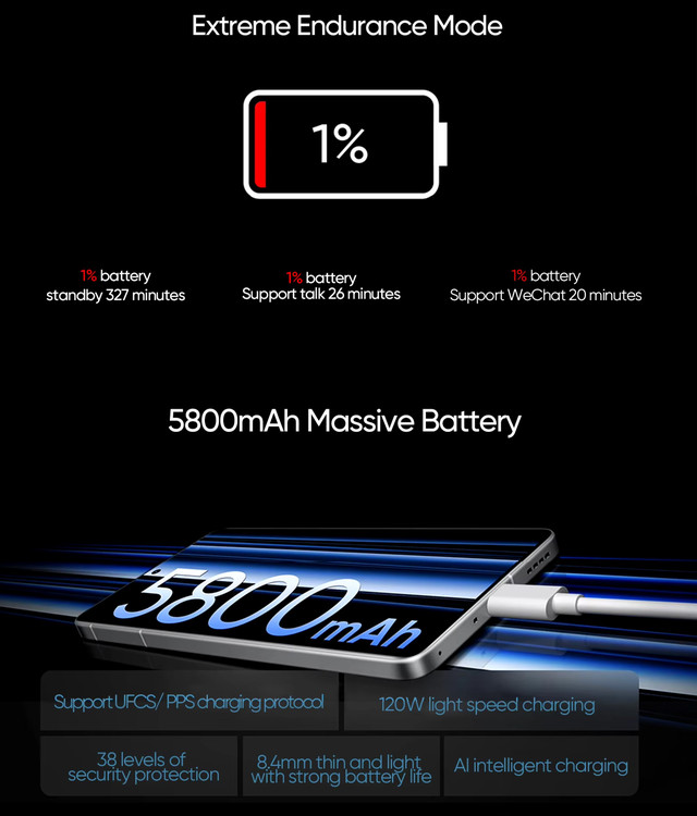 Екран (6.78", AMOLED, 2780х1264, 120 Гц) / Qualcomm Snapdragon 8 Gen 3 (3.3 ГГц) / Основна камера 50 МП + 8 МП, Фронтальна камера: 16 МП / RAM 12 ГБ / 256 ГБ вбудованої пам'яті / 3G / 4G (LTE) 5G / GPS / ГЛОНАСС / Galileo / BDS / підтримка 2х SIM-карт (Nano SIM + Nano SIM) / Android 14, Realme UI 5.0 / 5800 мА*г / 120 Вт