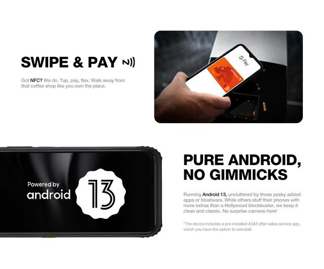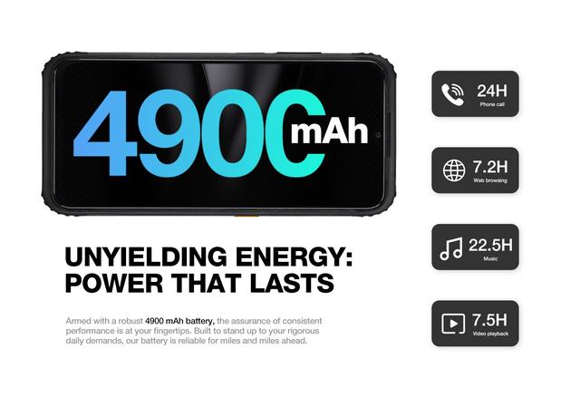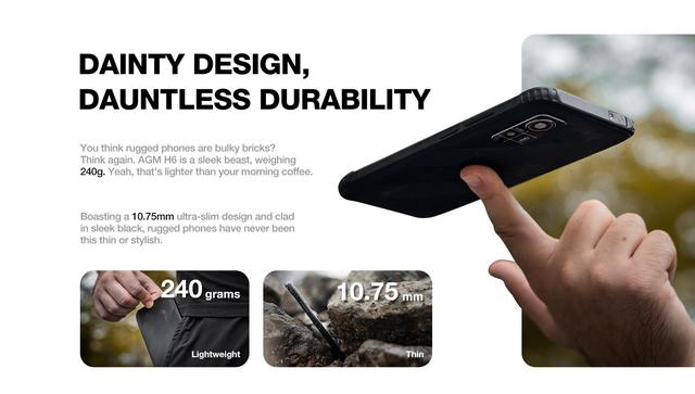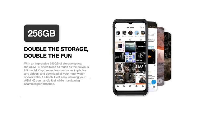 Добавляйте отваги своим приключениям с AGM H6, разработанным для настоящей жизни. Этот смартфон изготовлен с учетом всех требований современного потребителя, сочетая здоровую дозу прочности и удобства. Давайте рассмотрим некоторые впечатляющие особенности, которые делают AGM H6 самым лучшим собратом для всех ваших путешествий. Сегодня защищенные смартфоны часто слишком большие, толстые и тяжелые, чтобы быть практичными в использовании. Наши исследования свидетельствуют, что 63% пользователей отказываются от таких устройств из-за их "неприемлемых размеров". Именно здесь AGM Mobile делает свой шаг. Представляем AGM H6: компактный крепкий смартфон, который удобно лежит в любом кармане, даже в самых тесных джинсах, не уступая при этом в прочности. Наконец, крепость встретилась с повседневным удобным использованием. Неуклюжие руки? Активные приключения? Больше не проблема. То ли горный маршрут, то ли городские бетонные джунгли, это "зверино" AGM H6 уже не остановить! Забудьте о хрупких устройствах. Благодаря стандарту защиты MIL-STD-810H – смартфон способен выдержать падение с высоты 1.8 м, что на 20% выше, чем большинство конкурентных моделей с уровнем высоты до 1.5 м. IP68, IP69K свидетельствует об абсолютной защите от пыли и воды при любых обстоятельствах. Защищенный смартфон AGM H6 8/256GB может похвастаться абсолютной стойкостью, ощущаемой в каждом его элементе. Вес большинства защищенных экстремальных смартфонов составляет около 400 г, а толщина от 18 мм. Является ли это аксиомой, что все крепкие телефоны обязательно должны быть такими массивными? Мы так не думаем! AGM H6 – это стильный зверь, весом всего 240 г, что легче вашей утренней чашки кофе. Противоударный телефон AGM H6 обладает впечатляющим 10.75 мм ультратонким дизайном в черном цвете, доказывая, что прочные телефоны могут быть комфортными в использовании. Не разрешайте средним стандартам ограничивать ваш выбор! С впечатляющим объемом встроенной памяти 256 ГБ, телефон AGM H6 открывает для вас мир бесконечных возможностей. Сохраняйте свои воспоминания, мгновенно делитесь своими впечатлениями и загружайте все, что вам нравится, не утрачивая качества работы вашего устройства. Благодаря новому мощному процессору UNISOC Tiger T606 и впечатляющей оперативной памяти общим объемом 16 ГБ (8 ГБ + 8 ГБ расширения), сумасшедший смартфон-зверь AGM H6 способен обеспечить вам нужную производительность для решения самых сложных задач, включая мощный софт и игры. AGM H6 дарит возможность одновременно использовать две SIM-карты и дополнительно выделенный слот для microSD, который способен вместить до 512 ГБ информации. Это ваш смартфон – вы определяете правила! Двойная 50-мегапиксельная камера Samsung Al с искусственным интеллектом позволяет тебе наслаждаться радостью от четкой фотографии. Независимо от того, отдаленные ли это пейзажи, портретная фотография, или макро съемка – фотографировать новый смартфон AGM H6 умеет просто замечательно! Большой 6.56-дюймовый экран с высокой частотой обновления 90 Гц дарит вам максимальный комфорт и удовольствие от каждого экранного касания. С таким размером и четкостью изображения этот экран станет твоим окном в цифровой мир. Благодаря прочной аккумуляторной батарее на 4900 мАч, AGM H6 обеспечивает надежную и стабильную работу на протяжении множества часов непрерывно. Разработанный специально, чтобы выдерживать сам