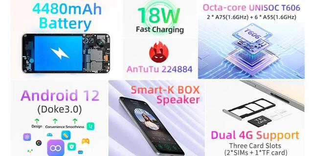 Бюджетный смартфон Blackview A85 (8+128 Гб) - идеальный гаджет для многих. Его основная философия в простоте, доступности, но многозадачности. Компания Blackview сумела удивить, ведь за столь скромные деньги выпустила очень востребованный смартфон. Дизайн его очень интересный, пусть даже напоминает один из флагманов от Xiaomi. Комплектуется модель при этом чехлом, поэтому поцарапать всю эту красоту Вы не сможете. В чем преимущества? Прежде всего, несмотря на закат 2022 года, в смартфоне Blackview A85 есть разъём 3.5 мм для подключения проводных наушников! Так же здесь есть Type-C для зарядки, сама зарядка при этом быстрая, а ёмкость аккумулятора составляет 4480 мАч. Хватает этого примерно на один день, зато и толщина корпуса смартфона минимальная - 8.6 мм. Добавьте ко всему качественный звук динамика и получите идеальный за свои деньги бюджетный "монстр"! Железо - "огонь"! Смартфон Blackview A85 работает быстро, ведь с процессором Unisoc T606 по-другому нельзя. Он 8-ядерный, при этом оперативной памяти предустановлено 8 Гб. Есть возможность программного расширения оперативной памяти до 14 Гб! Встроенной памяти 128 Гб, а карты памяти поддерживаются до 1 Тб. Да, и это не все, ведь слот для сим-карт у смартфона не комбинированный, так что карта памяти вставляется в третий, отдельный слот! Дисплей, как у флагманов. Blackview A85 (8+128 Гб) действительно получил шикарную IPS матрицу, которая хороша как в плане цветопередачи, так и яркости. Но, если Вы обратили внимание на характеристики, то частота обновления здесь составляет 90 Гц - это отлично сказывается на плавности отрисовки. С таким дисплеем одно удовольствие как в игры играть, так и фильмы смотреть - проблем нет. Чувствительный сенсорный слой тому подтверждение, ведь он играет важную роль на самом то деле. Камера для профессионалов. Снимает девайс на 50-Мп модуль отлично. Это именно тот модуль, который компания научилась настраивать на примере своих нескольких других моделей, что были дороже. Здесь же Вы сразу получаете идеальный баланс белого, идеальную скорость фокусировки и неплохую запись видео. Фронтальная 8-Мп камера так же порадует, ведь она имеет все необходимое для того, что бы Ваши селфи получались идеальными. ОПЕРАЦИОННАЯ СИСТЕМА Операционная система — Android 12 КОРПУС Материал корпуса — Пластик, Стекло СВЯЗЬ Количество SIM-карт — 2 SIM Формат SIM-карты — Nano-SIM Тип слота — SIM + Гибридный (SIM или MicroSD) Стандарты связи — GSM, CDMA, 3G, 4G (LTE) ЭКРАН Диагональ экрана — 6,5" Тип экрана — IPS LCD Разрешение экрана — 1612х720 пикс. Частота обновления экрана — 90 Гц Количество цветов — 16 миллионов Плотность пикселей — 272 ppi ПРОЦЕССОР Процессор — UNISOC T606 Количество ядер — 8 Частота процеcсора — 1,6 ГГц Графический процессор — Mali-G57 MP1 ПАМЯТЬ Оперативная память — 8 ГБ Внутренняя память — 128 ГБ Слот для карты памяти — Есть Поддержка карт памяти — microSD до 128 ГБ КАМЕРА Камера — 50 Мп + 8 Мп Диафрагма — f/1.8 + f/2.2 Запись видео — Full HD (1920x1080) Автофокус — Есть Вспышка основной камеры — Есть, LED Фронтальная камера — 8 Мп, f/2,2 (широкоугольная). Дополнительно — Съемка Full HD (1080p): 1920х1080 пикс 30 к/с БЕСПРОВОДНЫЕ ТЕХНОЛОГИИ Wi-Fi — IEEE 802.11 a/b/g/n/ac Технология GPS — A-GPS, GPS Спутниковая система — GPS, ГЛОНАСС, Beidou, Galileo Bluetooth — 5.0 Инфракрасный порт — Нет NFC — Нет ИНТЕРФЕЙСЫ Разъем для наушников — Есть, Аудио 3,5 Интерфейсы и подключения — USB Type-C ТЕХНОЛОГИИ Датчик приближения, Сканер отпечатка пальца, Датчик освещенн