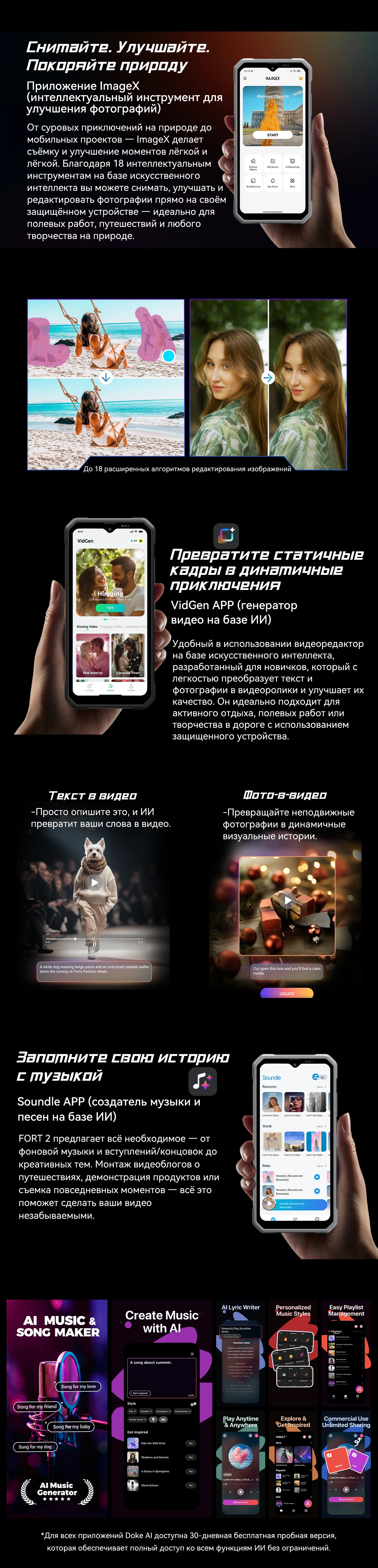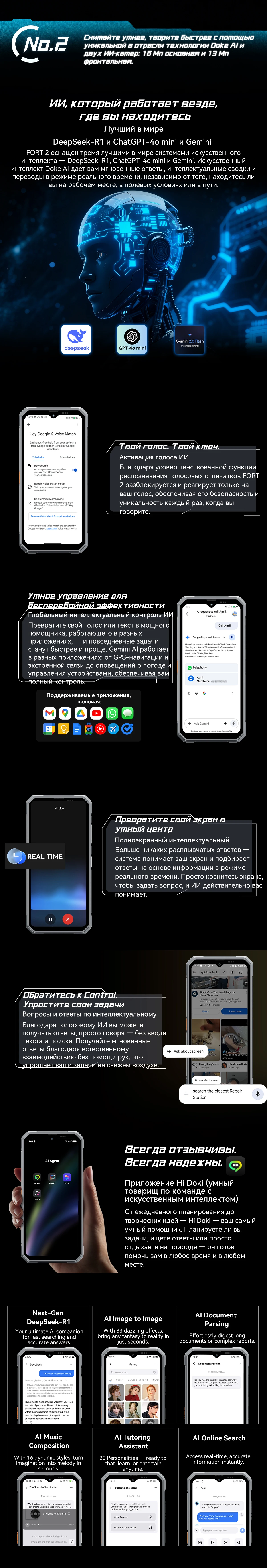 ОПЕРАЦИОННАЯ СИСТЕМА Операционная система — Android 15.0 (DokeOS 4.1) КОРПУС Стандарт защиты — IP68 / IP69K / MIL-STD-810 Защита корпуса — Водозащита, Влагозащита, Пылезащищенная, Ударопрочная Материал корпуса — Металл, Авиационный алюминий, Пластик, Поликарбонат, Резина повышенной прочности и износостойкости, Стекло СВЯЗЬ Количество SIM-карт — 2 SIM Формат SIM-карты — Nano-SIM Тип слота SIM-карты — SIM + Гибридный (SIM или MicroSD) Стандарты связи — GSM, 3G, 4G (LTE) ЭКРАН Диагональ экрана — 6.56" Тип экрана — IPS Разрешение экрана — 1612х720 пикс Частота обновления экрана — 90 Гц Плотность пикселей — 269 ppi Защитное стекло — Panda Glass ПРОЦЕССОР Процессор — MediaTek Helio G81 Количество ядер — 8 Частота процессора — 2x 2.0 ГГц ARM Cortex-A75, 6x 1.7 ГГц ARM Cortex-A55 Графический процессор — ARM Mali-G52 ПАМЯТЬ Внутренняя память — 256 ГБ Оперативная память — 8 ГБ (+ 16 ГБ виртуальной памяти) Слот для карты памяти — Есть, microSD 2 ТБ КАМЕРА Камера — 16 МП + 2 МП Фронтальная камера — 13 МП БЕСПРОВОДНЫЕ ТЕХНОЛОГИИ Wi-Fi — 5 (802.11ac) Технология GPS — A-GPS, GPS Спутниковая система — GPS, ГЛОНАСС, Galileo, Beidou Bluetooth — 5.2 VoLTE — Есть NFC — Есть Инфракрасный порт — Нет ИНТЕРФЕЙСЫ Аудио выход (3.5 мм) — Нет Разъем для синхронизации — USB Type-C 2.0 ЗАЩИЩЕННОСТЬ IP (степень защиты от проникновения) — IP68 / IP69K / Военный сертификат MIL-STD-810 Защита от пыли — Пыль не может попасть в устройство. Полная защита от контакта. Защита от воды — Выдерживает погружение на глубину до 2 м более 30 минут, устройство при этом сохраняет работоспособность и может работать в погруженном режиме. Защита от удара/падения — Корпус и электроника защищены от падений и ударов, с высоты до 2 м. Стекло — Закаленное ударопрочное, устойчивое к царапинам, ударам и другим механическим воздействиям. Температура — от -35°C до +50°C ТЕХНОЛОГИИ Акселерометр, Датчик освещения, Датчик приближения, Компас, Гироскоп, Боковой датчик отпечатков пальцев АККУМУЛЯТОР Емкость аккумулятора — 5000 мАч Быстрая зарядка — Есть Особенности быстрой зарядки — 18 Вт ГАБАРИТЫ Размеры — 174.6 x 83 x 10.7 мм Вес — 245 г КОМПЛЕКТАЦИЯ Смартфон, Кабель USB Type-C, Блок подзарядки, Инструмент для извлечения SIM-карты, Инструкция Характеристики и комплектация товара могут изменяться производителем без уведомления.ГBlackview FORT 2