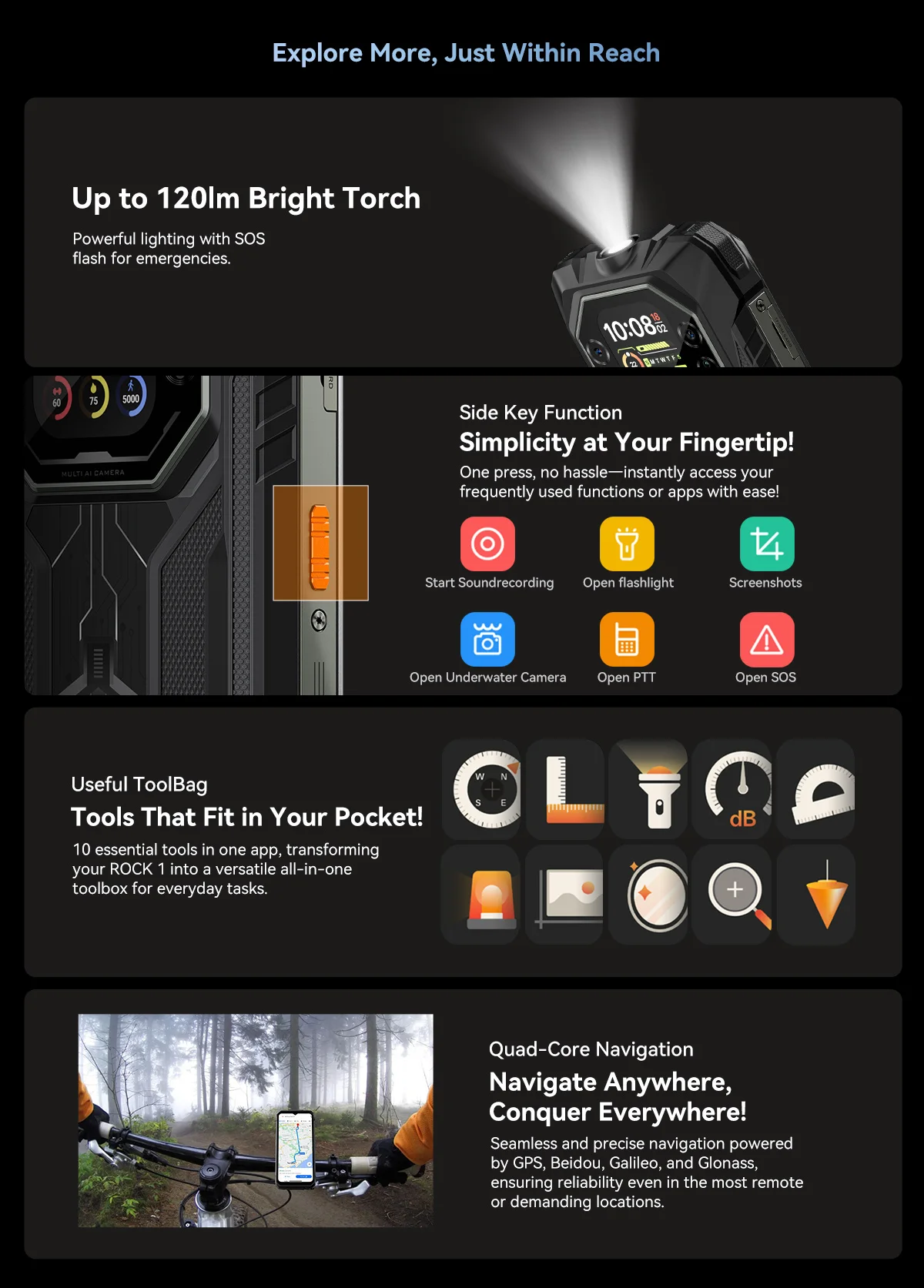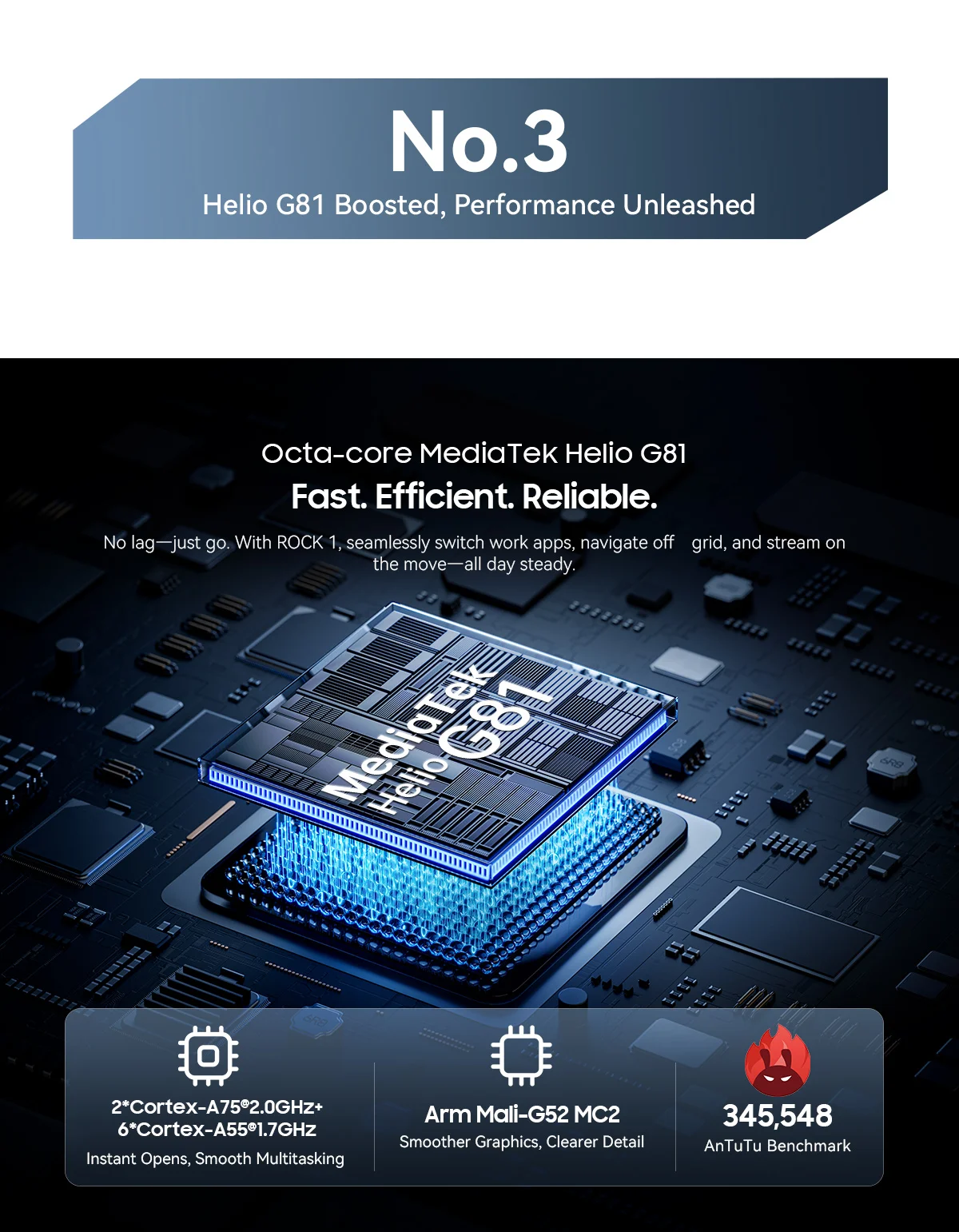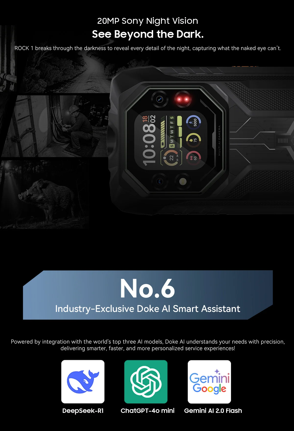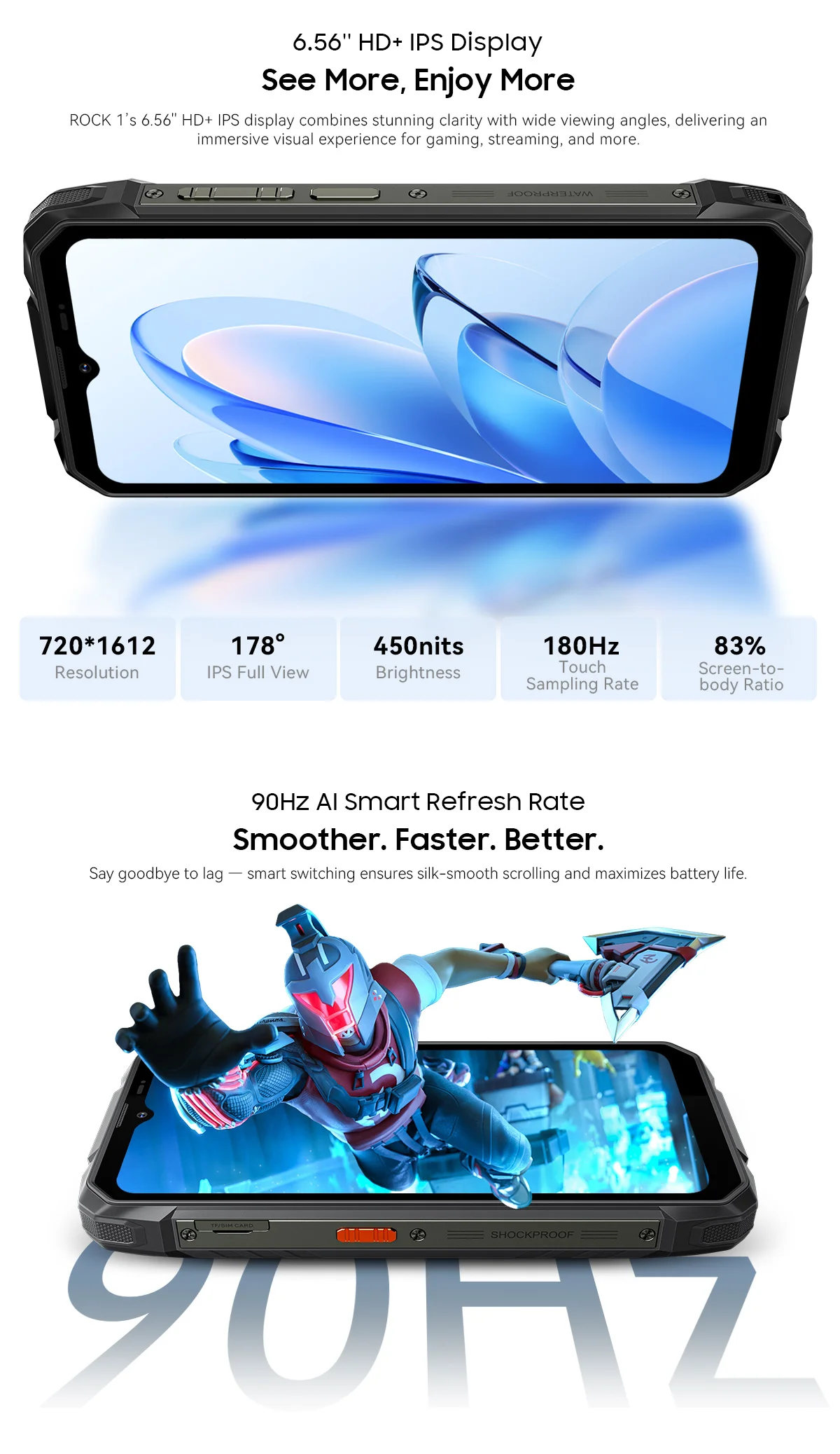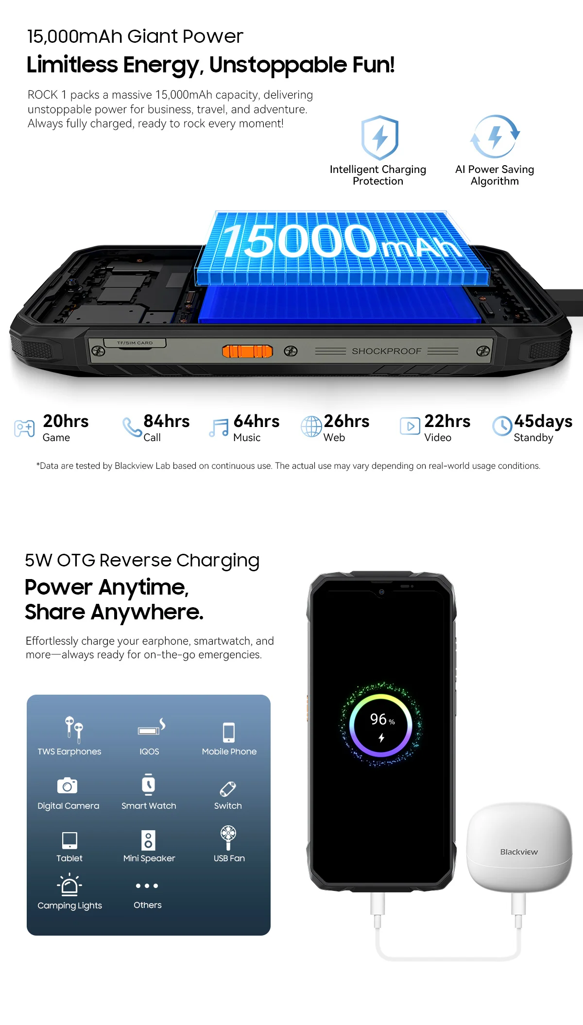Blackview ROCK 1 — это мощный защищенный смартфон класса Rugged, предназначенный для экстремальных условий, тяжелой работы и активной жизни. Устройство изготовлено в прочном корпусе с усиленными углами и выдерживает испытание водой, пылью, ударами и падениями благодаря сертификациям IP68 и IP69K, а также стандарту MIL-STD-810H, что подтверждает его устойчивость к вибрациям, ударам, погружениям и сильным струям. Это делает телефон идеальным выбором для строительства, походов, полевых работ или условий, где обычный смартфон может не выдержать нагрузки. Смартфон оснащен большим 6,56-дюймовым IPS-дисплеем с разрешением 720x1612 (HD+), что обеспечивает четкое и яркое отображение видео, фото, карт и приложений. Частота обновления 90 Гц гарантирует плавную прокрутку интерфейса и комфортное взаимодействие с контентом. Дисплей имеет широкие уголки обзора и оптимизированную плотность пикселей для качественного просмотра при разном освещении. Телефон также имеет дополнительный 2,01-дюймовый дисплей на тыльной стороне с отдельной информацией – для быстрого просмотра часов, уведомлений, погоды, музыкальных элементов или компаса без включения основного экрана. Blackview ROCK 1 работает на базе 8-ядерного процессора MediaTek Helio G81, состоящего из мощных и энергоэффективных ядер для стабильной работы системы, просмотра видео, серфинга в интернете и игр среднего уровня. Смартфон оснащен 8 ГБ оперативной памяти LPDDR4X для плавной многозадачности и 256 ГБ внутреннего накопителя eMMC 5.1, достаточного для хранения фотографий, видео, музыки и больших программ. Есть возможность расширения памяти microSD для хранения еще большего объема данных Смартфон оснащен двухкамерной основной системой, включающей 16 МП главный сенсор и 20 МП ночную камеру (Night Vision), позволяющую делать лучшие детализированные кадры при слабом освещении. Такое сочетание отлично подходит для фото природы, документирования полевых работ или ночных кадров. Фронтальная камера 13 МП обеспечивает качественные селфи и стабильные видеозвонки, записывая видео в Full HD 1080p при 30 fps – все, что нужно для современного контента и общения. Одним из наиболее существенных преимуществ ROCK 1 является сверхмощный аккумулятор на 15000 мАч, обеспечивающий дни работы без подзарядки даже при активном использовании сети, видео, навигации и игр. Благодаря алгоритмам интеллектуального энергосбережения телефон может работать очень долго, а опция реверсивной зарядки (OTG) позволяет заряжать другие устройства через USB-C с разъемом. Поддерживается 33 Вт быстрая зарядка, значительно сокращающая время восстановления энергии батареи — идеально для путешествий или ежедневного использования без длительных пауз. Blackview ROCK 1 предлагает широкий набор современных коммуникаций и полезных функций: Смартфон работает на DokeOS 5.0 на базе Android 16, который предлагает современный интерфейс, актуальные функции и оптимизированную производительность. ОПЕРАЦИОННАЯ СИСТЕМА Операционная система — Android 16.0 (DokeOS 5.0) КОРПУС Стандарт защиты — IP68 / IP69K / MIL-STD-810H Защита корпуса — Водозащита, Влагозащита, Пылезащищенная, Ударопрочная Материал корпуса — Металл, Авиационный алюминий, Пластик, Поликарбонат, Резина повышенной прочности и износостойкости, Стекло СВЯЗЬ Количество SIM-карт — 2 SIM Формат SIM-карты — Nano-SIM Тип слота SIM-карты — SIM + Гибридный (SIM или MicroSD) Стандарты связи — GSM, 3G, 4G (LTE) ЭКРА
