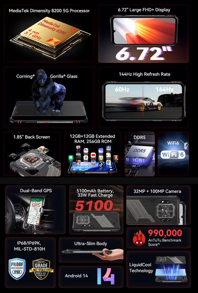 CUBOT KingKong Star 2 – це потужний та витривалий смартфон, що поєднує в собі новітні технології та міцний дизайн, створений для найскладніших умов. Завдяки захисту за стандартами IP68/IP69K і MIL-STD-810H, цей телефон стійкий до води, пилу та ударів, що робить його ідеальним вибором для тих, хто живе активним життям. Екран 6,72 дюйма FHD+ із частотою оновлення 144 Гц забезпечує неймовірно плавний та чіткий візуальний досвід. Завдяки високій частоті оновлення цей дисплей ідеально підходить для динамічних ігор, перегляду відео та щоденного використання, де важлива швидка реакція. Яскраві кольори та висока чіткість роблять зображення реалістичними та насиченими. Екран захищений Corning Gorilla Glass, що забезпечує підвищену міцність та стійкість до подряпин та ударів, а також комфорт під час тривалого використання. Це гарантує, що ваш смартфон буде готовий до будь-яких викликів як у повсякденному житті, так і в екстремальних умовах. Отримуйте доступ до основних програм, оповіщень та елементів керування музикою за допомогою 1,85-дюймового допоміжного екрана. Цей завжди увімкнений дисплей забезпечує швидкий та зручний спосіб перевірити повідомлення, пропущені дзвінки або змінити музику без необхідності розблокувати телефон. Простий у використанні дозволяє швидко переглядати важливу інформацію і легко керувати треками під час прогулянок або інших активностей. Залишайтеся в курсі справ та насолоджуйтесь музикою навіть під час руху. Процесор MediaTek Dimensity 8200 з 4-нанометровою архітектурою та тактовою частотою 3,1 ГГц забезпечує відмінну продуктивність та надзвичайно плавну багатозадачність. Це ідеальний вибір для геймерів, стримерів та користувачів, які потребують максимальної швидкості та ефективності під час роботи або розваг у дорозі.Оперативна пам'ять 12 ГБ (до 24 ГБ з розширенням) та 256 ГБ внутрішньої пам'яті забезпечують простір для всіх програм, файлів та медіа. Можливість розширення пам'яті гарантує, що завжди буде достатньо місця. Технологія охолодження LiquidCool дозволяє підтримувати оптимальну температуру пристрою навіть за інтенсивного використання. Це забезпечує стабільну продуктивність протягом тривалого часу, дозволяючи вам безперервно грати, дивитися відео або виконувати інші завдання без перегріву. Основна камера 100 МП та передня 32 МП забезпечують неймовірну якість фотографій та відео в будь-яких умовах. Знімайте моменти з максимальною деталізацією, чіткістю та насиченими кольорами, незалежно від освітлення чи місця. Основна камера гарантує відмінну якість знімків природи, міських пейзажів або динамічних сцен, а передня камера ідеально підходить для селфі та відеодзвінків, роблячи кожен кадр живим та яскравим. Акумулятор ємністю 5100 мАг гарантує тривалу роботу без необхідності частої підзарядки. Ви можете насолоджуватися улюбленими іграми, відео та додатками протягом дня без перерв. Завдяки швидкій зарядці 33 Вт швидко відновите енергію пристрою, повертаючи його до повної потужності за короткий час, що робить його ідеальним для активного життя на ходу. Навігація: Підтримка GPS, GLONASS, Galileo та BEIDOU гарантує точну та надійну навігацію навіть у найвіддаленіших або найскладніших для доступу місцях. Ви завжди зможете знайти свій шлях незалежно від обставин. WiFi 6 та пам'ять DDR5: Ці передові технології забезпечують високі швидкості з'єднання та передачі 