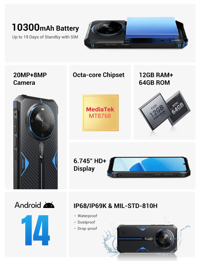 Пропонуємо новинку від FOSSIBOT на ринку бюджетних захищених смартфонів – FOSSIBOT F105. Пристрій порадує великою ємністю акумулятора, досить потужними характеристиками та привабливою ціною. FOSSiBOT F105 оснащений великим 6,745-дюймовим HD+ дисплеєм із захисним склом Dragontrail, що забезпечує надзвичайно чітке та яскраве зображення. Такий екран ідеально підходить для перегляду відео, ігор та роботи з програмами, доставляючи користувачам справжнє задоволення від використання. Завдяки високій роздільній здатності, ви зможете насолоджуватися кожною деталлю зображення, що робить цей смартфон ідеальним вибором для любителів мультимедійного контенту. Високопродуктивний восьмиядерний чіп MT8768, виготовлений за 12-нм техпроцесом, гарантує ідеальний баланс між потужністю та ефективністю. Смартфон має 4 ГБ оперативної пам'яті та 64 ГБ вбудованої пам'яті. Завдяки технології розширення пам'яті оперативну пам'ять можна збільшити до 12 ГБ для багатозадачної обробки та безперебійної роботи програм. Смартфон оснащений основною камерою на 20 МП, яка дозволяє зберегти кожен пам'ятний момент з приголомшливою деталізацією та високою роздільною здатністю. 8-мегапіксельна фронтальна камера забезпечує яскраві та чіткі селфи, дозволяючи вам фіксувати важливі моменти. Акумулятор великої ємності 10300 мАг дозволяє залишатися на зв'язку до 19 днів без підзарядки, що робить його ідеальним супутником для далеких подорожей. З цією потужною батареєю можна отримати до 19 днів у режимі очікування (без SIM-картки) або 19 днів у режимі очікування (з однією SIM-карткою). FOSSiBOT F105 також може виступати в ролі павербанка, заряджаючи інші пристрої, такі як бездротові навушники, мобільні телефони, смарт-годинник і т.д. ОПЕРАЦІЙНА СИСТЕМА Операційна система — Android 14 КОРПУС Матеріал корпусу — Метал, Авіаційний алюміній, Пластик, Полікарбонат, Гума підвищеної міцності та зносостійкості, Скло Стандарт захисту — IP68, IP69K, MIL-STD-810G Захист корпусу — Водозахист, Вологозахист, Пилозахищений, Ударостійкий ЗВ'ЯЗОК Стандарти зв'язку — GSM, 3G, 4G (LTE) Кількість SIM-карт — 2 SIM Формат SIM-карти — Nano-SIM Тип слота SIM-карт — SIM + Гібридний (SIM або MicroSD) ЕКРАН Діагональ екрану — 6.745" Тип екрану — IPS Роздільна здатність екрана — 1600х720 пікс.(20:9) Частота оновлення екрану — 60 Гц Щільність пікселів — 269 ppi Захист екрану — Dragontrail glass Яскравість екрану — 450 ниток ПРОЦЕСОР Процесор — MediaTek MT8768 (Helio P22) Кількість ядер — 8 Частота процесора — 4x 2.3 ГГц Cortex A53 + 4x 1.8 ГГц Cortex A53 Графічний процесор — Power GE8320 ПАМ'ЯТЬ Оперативна пам'ять — 4 ГБ (+ 8 ГБ віртуальної пам'яті) Внутрішня пам'ять — 64 ГБ Слот для картки пам'яті — microSD до 512 ГБ КАМЕРА Камера — 13 МП + 0.3 МП + 0.3 МП Фронтальна камера — 5 МП БЕЗДРОТОВІ ТЕХНОЛОГІЇ Wi-Fi — 802.11 a/b/g/n/ac/ax Технологія GPS — A-GPS, GPS Супутникова система — GPS, ГЛОНАСС, Galileo, BDS Bluetooth — 5.0 NFC — Немає VoLTE — Є ІНТЕРФЕЙСИ Аудіо вихід — Немає Роз'єм для синхронізації — Type-C ЗАХИЩЕННІСТЬ IP (ступінь захисту від проникнення) — IP68 / IP69K / Військовий сертифікат MIL-STD-810G Захист від пилу — Пил не може потрапити у пристрій. Повний захист від контакту. Захист від води — Витримує занурення на глибину до 2 м більше 30 хвилин, пристрій при цьому зберігає працездатність і може працювати в зануреному режимі. Захист від удару/падіння — Корпус і електроніка захищені від падінь і ударів, з висоти до 2 м. Скло — Гартоване удароміцне, стійке до подряпин, ударів та інших меха