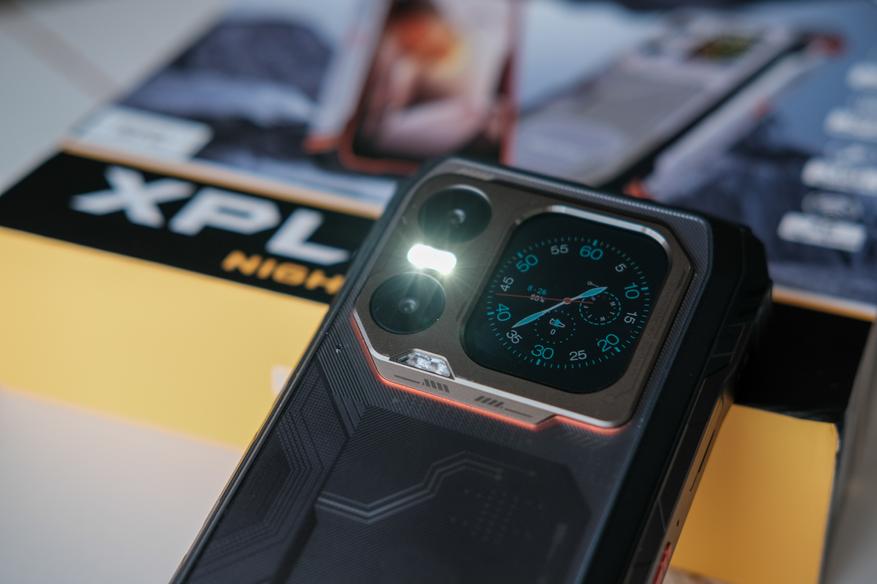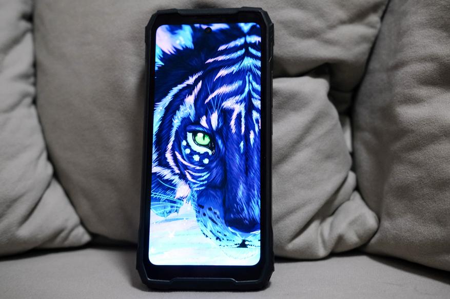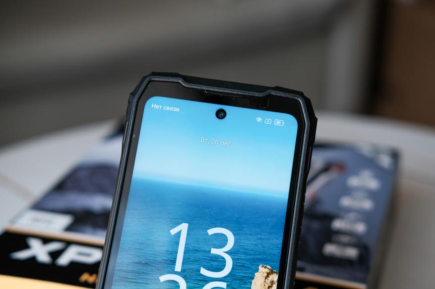 Вокруг экрана естественно имеются бортики около 1мм, как у любого защищённого смартфона. А в верхней его части находится передняя камера 50 МП (Samsung ISOCELL JN1). Чуть выше камеры также находится слегка заметный вырез решетки слухового динамика