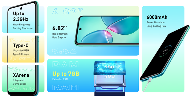 Смартфон Infinix является мощным до глубины души, поскольку он позволяет вам наслаждаться плавной производительностью при доступе к нескольким приложениям, поскольку он оснащен ядром Octa (1,82 ГГц) Unisoc T610. Кроме того, телефон поставляется с 4 ГБ оперативной памяти и 64 ГБ встроенной памяти, так что вы можете хранить все свои песни, видео, игры, фотографии и другие вещи, не беспокоясь об ограничениях пространства. IPS-ДИСПЛЕЙ На ярком 6.82” IPS-дисплее с разрешением HD+ 90 Гц изображение выглядит красочно и реалистично. ДИСПЛЕЙ PUNCH HOLE Особенность дисплея Punch Hole Display – фронтальная камера в виде крошечного отверстия, которая предоставляет больше полезного пространства приложениям и смотрится стильно. Чтобы приблизиться к совершенству, интерфейсы приложений были изменены для полной интеграции с новым типом дисплея. А режим защиты глаз регулирует насыщенность оттенков, уменьшая часть синего цвета и тем самым снижает нагрузку на глаза. АККУМУЛЯТОР 6000 МА*Ч HOT 12 Play оборудован мощным аккумулятором емкостью 6000 мА*ч. Вместе с интеллектуальной системой управления энергопотреблением это позволяет смартфону демонстрировать отличную автономность. ИГРОВОЙ ПРОЦЕССОР HOT 12 Play имеет мощный процессор Unisoc Tiger T610. Вместе с интеллектуальной системой управления энергопотреблением это позволяет смартфону демонстрировать отличную автономность и невероятную производительность в играх. МНОГО ПАМЯТИ НЕ БЫВАЕТ Благодаря оперативной памяти объемом 4+3 ГБ и встроенной памяти объемом 64 ГБ можно установить много приложений и переключаться между ними без потери производительности. Дополнительно в смартфоне можно установить карту памяти объемом до 512 ГБ. Карту памяти можно использовать одновременно с двумя SIM-картами (оба SIM-слота поддерживают 4G). ХАРАКТЕРИСТИКИ: Производитель — Infinix Модель — HOT 12 Play Страна-производитель — Китай Страна регистрации бренда — Китай Материал корпуса — Стеклянная передняя панель, пластиковая задняя панель, пластиковая рама ОПЕРАЦИОННАЯ СИСТЕМА ОС — Android 11 Пользовательский интерфейс — XOS 7.6 СВЯЗЬ Количество SIM-карт — 2 SIM Формат SIM-карты — Nano-SIM Стандарты связи — 3G, 4G (LTE), GSM Тип слота — SIM + SIM + MicroSD ЭКРАН Тип экрана — IPS Диагональ экрана — 6.82" Разрешение — HD + 1612х720 пикс. Соотношение сторон — 20:9 Частота обновления экрана — 90 Гц Количество цветов — 16 млн Плотность пикселей — 259 ppi ПРОЦЕССОР Процессор — Unisoc (Spreadtrum) T610 Количество ядер — 8-ядерный Частота процессора — 6x Cortex-A55 1.8 ГГц, 2x Cortex-A75 1.8 ГГц Графический процессор — Mali-G52 MP2 ПАМЯТЬ Оперативная память — 4 ГБ Внутренняя память — 64 ГБ Слот для карты памяти — до 512 Гб КАМЕРА Основная камера — 13 Мп + 0.08 Мп Диафрагма — f/1.8 Формат видеосъемки — Full HD (1920x1080 (30 кадр./сек.) Фокусировка — Автоматическая Стабилизация — Нет Вспышка основной камеры — Есть, четверная светодиодная Фронтальная камера — 8 Мп Вспышка фронтальной камеры — Нет ФУНКЦИИ И ОСНАЩЕНИЕ Интерфейсы — USB Type-C, Аудио 3.5, OTG БЕСПРОВОДНЫЕ ТЕХНОЛОГИИ Bluetooth — Есть v5.0 Wi-Fi — Есть 4 (802.11n), 5 (802.11ac) NFC — Есть GPS — ГЛОНАСС, GPS, A-GPS, BeiDou ОСНАЩЕНИЕ Распознавание лица, сканер отпечатков пальцев (сзади корпуса), Акселерометр, Компас, Приближение, Освещённость АККУМУЛЯТОР Емкость аккумулятора — 6000 мАч Тип аккумулятора — Li-polymer Мощность зарядки — 10 Вт Время работы в режиме ожидания — 720 ч Время работы в режиме разговора — 20 ч КОМПЛЕКТАЦИЯ Смартфон, Зарядное устройст
