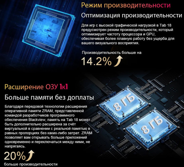 Совершенно новый планшет Blackview Tab 18 получился с огромным экраном, внушительным объемом оперативной памяти в 8 ГБ + 8 ГБ и четырьмя улучшенными динамиками. Blackview Tab 18 предлагает впечатляющий 12-дюймовый экран с разрешением 2,4K FHD+. Этот планшет также поддерживает WideVine L1, что позволяет вам наслаждаться потоковым видео в высоком качестве, включая поддержку Netflix и передачу HD 1080P на платформах, таких как Amazon Prime Video, Disney+ и Hulu. Четыре динамика Harman Kardon, настроенные с помощью Harman AudioEFX 2.0, обеспечивают отличное аудиокачество. Кроме того, Tab 18 сертифицирован TUV SUD по низкому уровню синего света и имеет три режима защиты глаз для комфортного и продолжительного просмотра. Blackview Tab 18 дебютирует с операционной системой DokeOS_P 4.0 на базе Android 13. Это обновление включает в себя множество улучшений, включая переработанный режим разделенного экрана, новый режим ПК 2.0 и доработанные настройки таймера, учитывающие предпочтения пользователей. Обновленный режим разделенного экрана позволяет проводить удаленные встречи и делать заметки одновременно. Совершенно новое магнитное перо S Pen Gen 2 и Bluetooth-клавиатура/мышь в режиме ПК 2.0 делают Tab 18 мощным 12-дюймовым ПК для разнообразных задач. Планшет Tab 18 оборудован восьмиядерным процессором MediaTek Helio G99, построенным на 6-нм технологическом процессе. Этот процессор обеспечивает плавную работу приложений, игр и многозадачность. Кроме того, Tab 18 оснащен до 16 ГБ оперативной памяти, 256 ГБ встроенной флеш-памяти и поддерживает карты памяти объемом до 1 ТБ. Это гарантирует высокую производительность и много места для ваших данных и приложений. Планшет Tab 18 оснащен мощным аккумулятором емкостью 8800 мА•ч, что обеспечивает до 12 часов ежедневного использования и до 18 дней в режиме ожидания. Благодаря быстрой зарядке мощностью 33 Вт, Tab 18 может быстро зарядиться с 20% до 70% всего за час. Планшет также имеет в своем арсенале фронтальную камеру Samsung 8 МП для видеозвонков и селфи, а также заднюю камеру 16 МП для создания качественных фотографий. ОСНОВНОЕ Операционная система — Android 13 Фирменная оболочка — DokeOS P 4.0 КОРПУС Тип корпуса — Моноблок Материал корпуса — Пластик, Металл СВЯЗЬ Возможность совершать звонки — Есть Стандарты и технологии — 2G, 3G, 4G Количество SIM-карт — 2 SIM Формат SIM-карты — Nano Тип слота SIM-карт — SIM + Гибридный (SIM или MicroSD) ЭКРАН Диагональ экрана — 12" Разрешение экрана — 2000х1200 пикс. 2.4K FullHD+ Тип экрана — IPS Плотность пикселей — 195 ppi Частота обновления — 60 Гц Соотношения экран/корпус — 86.6% ПРОЦЕССОР Процессор — MediaTek Helio G99 Количество ядер — 8 ядер Частота процессора — 2x 2.2 ГГц Cortex-A76, 6x 2.0 ГГц Cortex-A55 Графическое ядро — ARM Mali-G57 MC2 ПАМЯТЬ Внутренняя память — 256 ГБ Оперативная память — 8 ГБ (+ 8 ГБ виртуальной памяти) Поддержка карт памяти — Есть, MicroSD до 2 ТБ КАМЕРА Задняя камера — 16 МП Фронтальная камера — 8 МП ДОПОЛНИТЕЛЬНО БЕСПРОВОДНЫЕ ТЕХНОЛОГИИ Bluetooth — 5.2 GPS — A-GPS, GPS, Glonass, Galileo, Beidou Wi-Fi — 802.11 a/b/g/n/ac VoLTE — Есть NFC — Нет ИНТЕРФЕЙС / РАЗЪЕМЫ Разъем питания — Type-C ЗВУК Стереозвук — Есть ДАТЧИКИ Акселерометр, Датчик приближения, Датчик света, Компас, Датчик Холла АККУМУЛЯТОР Емкость аккумулятора — 8800 мАч Мощность зарядки — 33 Вт (50% за 1 час) ГАБАРИТЫ Размеры — 277.6 x 173.2 x 7.9 мм Вес — 632 г КОМПЛЕКТАЦИЯ Планшет, USB кабель, Зарядное устройство, Чехол, Наушники, Инструмент для извлечения SIM-карты, Инструкция Дополнительно:Blackview Tab 18