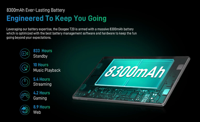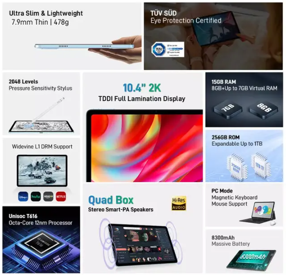 В наличии новый, стильный и функциональный планшет Doogee T20 8/256Gb, который порадует своими техническими характеристиками даже самого требовательного пользователя! Планшет имеет 10,4-дюймовый дисплей с разрешением 2K. Он сертифицирован как безопасный для глаз в соответствии со стандартами безопасности TUV SUD. Кроме того, планшет получил 4 стереодинамика с алгоритмом smartPA, позволяющим использовать внутреннее пространство планшета для создания более качественного звуков. Планшет поддерживает звук Hi-Res, что гарантирует очень качественное звучание. Что касается памяти, Doogee T20 является одним из немногих планшетов, предлагающих накопитель ёмкостью 256 ГБ в базовой версии. Кроме того, имеется возможность расширения памяти на 1 ТБ с помощью карты microSD. Оперативная память объёмом 8 ГБ может достигать 15 ГБ при помощи 7 ГБ виртуальной памяти. Планшет Dogee T20 построен на базе однокристальной системы Unisoc T616. Он также поставляется со стилусом T20 (2048 степеней нажатия) и магнитными контактами и оригинальным чехлом-книжкой. Оснащен аккумулятором емкостью 8300 мАч с поддержкой быстрой зарядки на 18 Вт ОСНОВНОЕ Интерфейс подключения — Type-C Стандарты и технологии — 3G, 4G Операционная система — Android 12 Количество SIM-карт — 2 SIM Формат SIM-карты — Nano Тип слота SIM-карт — SIM + Гибридный (SIM или MicroSD) Тип корпуса — Моноблок Материал корпуса — Металл, Пластик, Поликарбонат, Стекло Защищенность — Нет ПРОЦЕССОР Процессор — Unisoc T616 Графическое ядро — Mali-G57 MP1 Количество ядер — 8 ядер Частота процессора — 2.0 ГГц ЭКРАН Диагональ экрана — 10.4 Разрешение экрана — 2000x1200 пикс. Тип экрана — IPS Плотность пикселей — 224 ppi Количество цветов — 16 миллионов КАМЕРА Задняя камера — 16 МП, ƒ/ 2.2 Фронтальная камера — 8 МП, ƒ/ 2.0 Запись видео — FullHD ПАМЯТЬ Внутренняя память — 256 ГБ Оперативная память — 8 ГБ (+ 7 ГБ виртуальной памяти) Поддержка карт памяти — Есть microSD возможно расширение — до 1 Тб БЕСПРОВОДНЫЕ ТЕХНОЛОГИИ Bluetooth — 5.0 GPS — A-GPS / GPS / Glonass / Galileo / Beidou Wi-F — 802.11 a/b/g/n/ac ЗВУК Стереозвук — Есть АККУМУЛЯТОР Емкость аккумулятора — 8300 мАч ГАБАРИТЫ Размеры — 245.8 х 155.6 х 7.9 мм Вес — 590 г КОМПЛЕКТАЦИЯ Планшет, USB кабель, Зарядное устройство, Чехол, Стилус, Инструкция