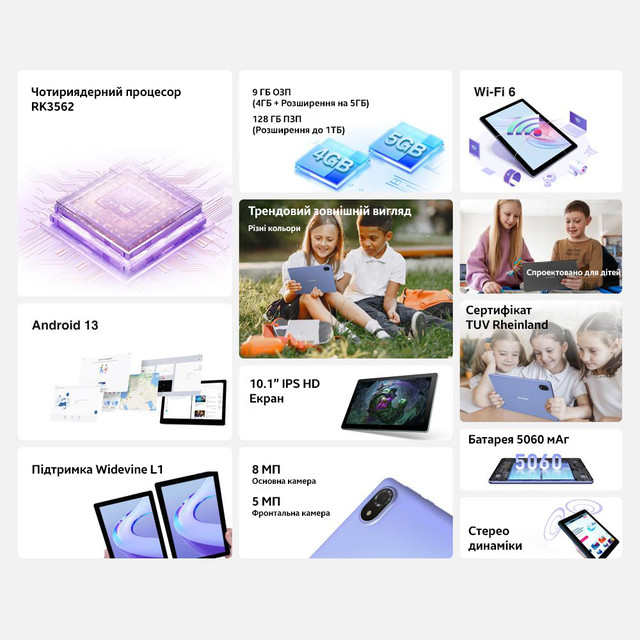 Doogee U10 оснащений чотириядерним процесором RK3562, забезпечуючи високу продуктивність для різноманітних завдань, від перегляду фільмів до ігор та багатозадачності. Планшет пропонує до 9 ГБ оперативної пам'яті (4 ГБ базової та 5 ГБ розширюваної) та 128 ГБ вбудованої пам'яті, що розширюється до 1 ТБ, що забезпечує достатньо місця для зберігання даних. За допомогою Wi-Fi 6, Doogee U10 пропонує швидкий і стабільний інтернет-зв'язок, підвищуючи ефективність роботи та розваг. Планшет працює на останній версії Android 13, забезпечуючи інтуїтивно зрозумілий інтерфейс користувача з покращеною безпекою і приватністю. Завдяки потужній батареї DOOGEE U10, ви зможете поринути у світ ігор, перегляду фільмів та серфінгу в інтернеті без необхідності постійної підзарядки. Цей планшет спроектований так, щоб максимізувати ваше задоволення від використання та мінімізувати переривання, спричинені необхідністю підзарядки, роблячи його ідеальним супутником для тривалих подорожей чи домашнього дозвілля. ОСНОВНЕ Інтерфейс підключення — Type-C Операційна система — Android 13 Підтримка SIM-карток — Немає Тип корпусу — Моноблок Матеріал корпусу — Пластик ЕКРАН Діагональ екрану — 10.1" Роздільна здатність екрана — 1280x800 пікс. Тип екрану — IPS (PLS) Щільність пікселів — 149 ppi Частота оновлення — 60 Гц ПРОЦЕСОР Процесор — Rockchip RK3562 Кількість ядер — 4 ядра Частота процесора — 2.0 ГГц Cortex-A53 Графічне ядро — Mali-G52 2EE ПАМ'ЯТЬ Внутрішня пам'ять — 128 ГБ Оперативна пам'ять — 4 ГБ (+ 5 ГБ віртуальної пам'яті) Підтримка карт пам'яті — Є microSD можливе розширення — до 1 ТБ КАМЕРА Задня камера — 8 МП Запис відео — FullHD БЕЗДРОТОВІ ТЕХНОЛОГІЇ Bluetooth — 5.0 GPS — Немає Wi-F — 6 (802.11ax) ІНТЕРФЕЙС / РОЗ'ЄМИ Роз'єм для навушників — Є, 3,5 мм Роз'єм живлення — Type-C ДАТЧИКИ Датчик наближення, Акселерометр, Датчик Холла АКУМУЛЯТОР Місткість акумулятора — 5060 мАг Потужність зарядки — 10 Вт ГАБАРИТИ Розміри — 245.3 x 163.3 x 9.9 мм Вага — 514 г КОМПЛЕКТАЦІЯ Планшет, USB кабель, Зарядний пристрій, Скріпка, ІнструкціяDOOGEE U10