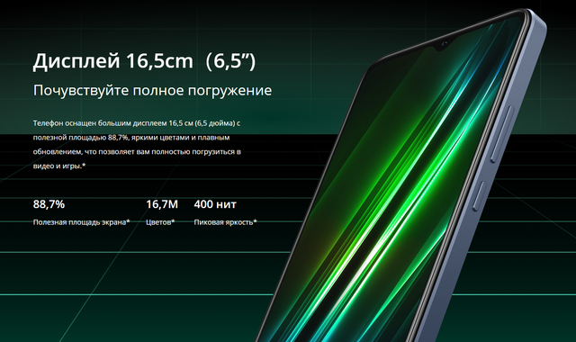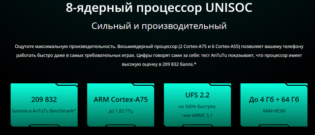 Сильный и производительный Ощутите максимальную производительность. Восьмиядерный процессор (2 Cortex-A75 и 6 Cortex-A55) позволяет вашему телефону работать быстро даже в самых требовательных играх. Цифры говорят сами за себя: тест AnTuTu показывает, что процессор имеет высокую оценку в 209 832 балла. Тройной слот Realme Narzo 50i Prime оснащен слотом для 2 нано Sim и внешней карты памяти объемом до 1 Тб, что обеспечивает максимальную универсальность. Это означает, что у вас больше выбора, чем когда-либо: 2 сим-карты, чтобы всегда оставаться на связи, слот для карты памяти - больше места для хранения ваших любимых фотографий и видео, а также больше игр и файлов в вашей медиатеке. Сильный и мощный Мощный аккумулятор емкостью 5000 мАч обеспечивает ваш смартфон энергией в течение всего дня. Этот аккумулятор позволит вам не расставаться с любимыми играми и видео, а ваши близкие будут всегда на связи. Режим супер-энергосбережения Забыли зарядку? Наш режим супер-энергосбережения позаботится об этом. Даже при мощности всего 5% вы все равно можете уверенно использовать основные функции своего телефона. Почувствуйте полное погружение Телефон оснащен большим дисплеем 16,5 см (6,5 дюйма) с полезной площадью 88,7%, яркими цветами и плавным обновлением, что позволяет вам полностью погрузиться в видео и игры. ХАРАКТЕРИСТИКИ: Материал корпуса — Пластик ПРОГРАММНЫЕ ХАРАКТЕРИСТИКИ Операционная система — Android 11.0 Go Edidtion Фирменная оболочка — Realme UI Go СВЯЗЬ Стандарты связи — 2G, 3G, 4G (LTE) Кол-во Sim карт — 2 слота (Nano-SIM) Тип слота — SIM + SIM + MicroSD ЭКРАН Диагональ — 6,5" Разрешение экрана — 1600x720 пикс. PPI — 269 Тип матрицы — LCD IPS ПРОЦЕССОР Процессор — Unisoc Tiger T612 Количество ядер — 8 Частота процессора — 2x1,8 ГГц Cortex-A75 & 6x1,8 ГГц Cortex-A55 Графический процессор — ARM Mali-G57 ПАМЯТЬ Оперативная память — 4 Гб Встроенная память — 64 Гб Поддержка карт памяти — microSD до 256 Тб КАМЕРА Основная камера — 18 Мп Диафрагма — f/2,0, 27 мм (широкоугольный), 1/4,0", 1,12µm, HDR Видеосъемка — 1920x1080 (30 кадр./с). Вспышка основной камеры — Есть, LED Автофокус — Есть Фронтальная камера — f/2,2, 27 мм (широкоугольный), 1/5,0", 1,12µm. Видеосъемка — 720p (30 кадр./с). HDR КОММУНИКАЦИИ Wi-Fi — 4 (802.11n) GPRS — Есть Bluetooth — Есть (v 5.0) NFC — Нет Навигация — GPS, GLONASS, Beidou FM-радио — Есть РАЗЪЕМЫ Разъем питания — micro-USB 2.0, USB On-The-Go Jack 3.5 mm — Есть ДАТЧИКИ Датчик приближения, Датчик освещения, Гироскоп, Акселерометр ПИТАНИЕ Тип аккумулятора — Несъемный Ёмкость 5000 мАч Быстрая зарядка — Есть ГАБАРИТЫ Размеры устройства — 75,6x164,1x8,5 мм Вес устройства — 182 гр КОМПЛЕКТАЦИЯ Cмартфон, Кабель для синхронизации, Скрепка для извлечения SIM-карты, Документация Realme Narzo 50i Prime 4/64Gb