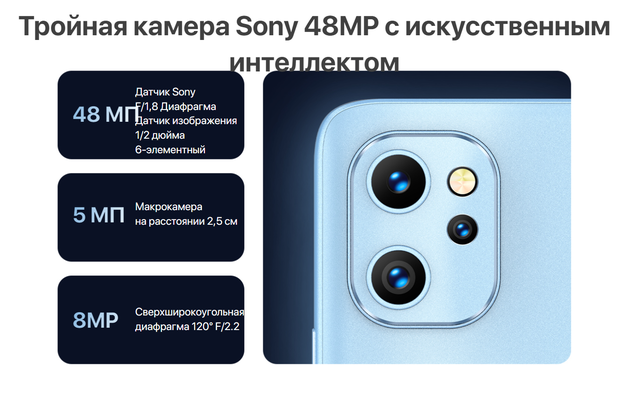 смартфон UMIDIGI F3S випущений у 2022 році. Він оснащений чіпсетом Unico Tiger T610, 6 GB оперативної пам'яті і 128 GB вбудованої пам'яті. UMIDIGI F3S працює на Android OS v11.0. Він поставляється з батареєю Li-Po 5150 mAh, невід'ємний. Він має 6,7 дюймів IPS-дислей з роздільною здатністю 720 x 1650 px. Технологія IPS є однією з найбільш прогресивних ЖК-технологій у світі. ХАРАКТЕРИСТКИ: ОПЕРАЦІЙНА СИСТЕМА Операційна система — Android 11 КОРПУС Матеріал для корпусу — Пластик Захист від пилу та вологи — Немає СВЯЗЬ Кількість IM-карт — 2 SIM Формат SIM-карти — Nano-SIM Тип слоту — Nno-SIM + microSD (Комбінований) Стандартні зв’язки — GSM, CDMA, 3G, 4G (LTE) ДИСПЛІЙ Тип матриці — IPS Діагональ екрана — 6.7" Роздільна здатність — 1650х720 Щільність пікселів — 269 PPI ПРОЦЕССОР Процесор — Unisoc T610 Кількість ядер — 8 Частота процесора — 1.8 ГГц Графічний процесор — Mali-G52 ПАМ’ЯТЬ Об' єм оперативної пам' яті — 6 ГБ Об’ єм вбудованої пам’ яті — 128 ГБ Підтримка SD-карти — до 256 ГБ КАМЕРА Головна камера — 48 Мп + 8 Мп + 5 Мп Діафрагма — f/1.8, ширококутна + f/2.2, надширококутна, 120 градусів + f/2.4, макро-об'єкт Спалах головної камери — Світлодіодна Фронтальна камера — 16 Мп КОММУНІКАЦІЇ NFC — Да. Навігація — GPS, A-GPS, GLONASS, Beidou, Galileo Стандартний зв’ язок — 4G (LTE) Bluetooth — Bluetooth 5.0 Аудиорозъем — 3.5 mm Wi-Fi — 802.11ac Інтерфейсний роз'їзд — USB Type-C ДАТЧИКИ Датчик наближення, Датчик світла, Акселерометр, Гіроскоп, електричний компас БЕЗОПАСНОСТЬ Сканер відбитків пальців на корпусі — Є Сканер обличчя — Да. АККУМУЛЯТОР Емкість акумулятора — 5150 мА/ч Швидка зарядка — Нет. ГАБАРИТЫ Розміри — 168.3 х76.6х8.75 мм Вага — 195 КОМПЛЕКТАЦІЯ Смартфон, Зарядний пристрій, Кабель, Чехол, Документація Характеристики та комплектація товару можуть бути змінені виробником без попередження.Umidigi F3S 6/128GB
