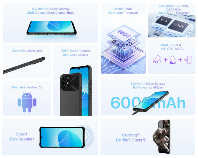 UMIDIGI G5 Mecha пропонує низку вражаючих функцій та можливостей, які зроблять його привабливим вибором. Задня частина UMIDIGI G5 Mecha виконана із цільного шматка матового композитного матеріалу AG, який забезпечує міцність та стильний зовнішній вигляд пристрою. Цей матеріал має матову текстуру, яка надає смартфону елегантності та приємного на дотик відчуття. Крім того, пристрій відповідає стандартам захисту IP68, IP69K та MIL-STD-810G, він оснащений гумовими прокладками на кутах, які допомагають захистити його від випадкових падінь та ударів. Ці прокладки сприяють амортизації під час падіння, знижуючи ризик пошкодження смартфона та його компонентів. Такий дизайн та міцні матеріали роблять UMIDIGI G5 Mecha більш стійким до пошкоджень та підвищують його довговічність у повсякденному використанні. Це особливо важливо для користувачів, які шукають надійного пристрою, здатного витримувати повсякденні труднощі та випадкові падіння. UMIDIGI G5 Mecha працює на восьмиядерному процесорі Unisoc T606, який забезпечує високу продуктивність та здатність справлятися з різними завданнями. Цей процесор оснащений вісьмома ядрами, які працюють спільно для забезпечення плавного та швидкого виконання операцій. Графічний процесор Mali-G57, вбудований у UMIDIGI G5 Mecha, забезпечує відмінну графіку та обробку графічних даних. Він здатний обробляти складні графічні програми, ігри та відео, що дозволяє насолоджуватися високою якістю візуального контенту на пристрої. UMIDIGI G5 Mecha також має 8 ГБ оперативної пам'яті, що забезпечує швидку та плавну роботу при багатозадачності. Високий обсяг оперативної пам'яті дозволяє запускати кілька програм одночасно і перемикатися між ними без затримок або уповільнень. Вбудована пам'ять становить 128 ГБ, що забезпечує достатній простір для зберігання фотографій, відео, програм та інших даних. Ви зможете відобразити кожен чудовий момент і мати всі необхідні файли та дані під рукою. Цей поєднання процесора, графічного процесора, оперативної та вбудованої пам'яті забезпечує високу продуктивність та можливість ефективно виконувати різноманітні завдання на UMIDIGI G5 Mecha. Висока роздільна здатність камери дозволяє отримувати зображення з великою кількістю пікселів, що призводить до більш ясних і гострих фотографій. Це особливо корисно при фотографуванні деталей, пейзажів або створенні збільшених знімків. Крім того, надчітка камера UMIDIGI G5 Mecha може мати додаткові функції, такі як автофокус, оптична стабілізація зображення, режими HDR та нічна зйомка, які допоможуть вам отримати більш якісні фотографії в різних умовах освітлення. Окремо є режим підводної камери, який дозволяє відобразити приголомшливі спогади навіть під водою. Це чудова функція для любителів плавання, дайвінгу чи інших водних видів спорту. Завдяки надчіткою 50-мегапіксельній камері UMIDIGI G5 Mecha ви зможете відобразити кожен момент з високим рівнем деталізації, колірною точністю та чіткістю, створюючи вражаючі фотографії для збереження спогадів. Додатково пристрій пропонує 8-мегапіксельну селфі-камеру для красивих селфі. Смартфон має 6,6-дюймовий повноекранний дисплей з роздільною здатністю HD+, який забезпечує широку перспективу та чітке візуальне сприйняття. Цей дисплей також піклується про здоров'я очей і пропонує яскраві зображення для захисту очей протягом усього дня. Захист екрану забезпечуєтьс