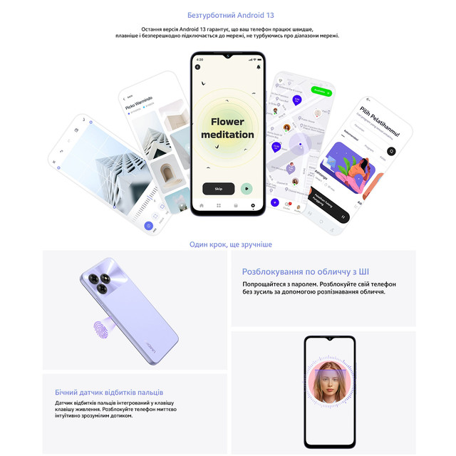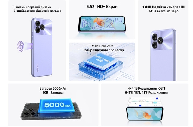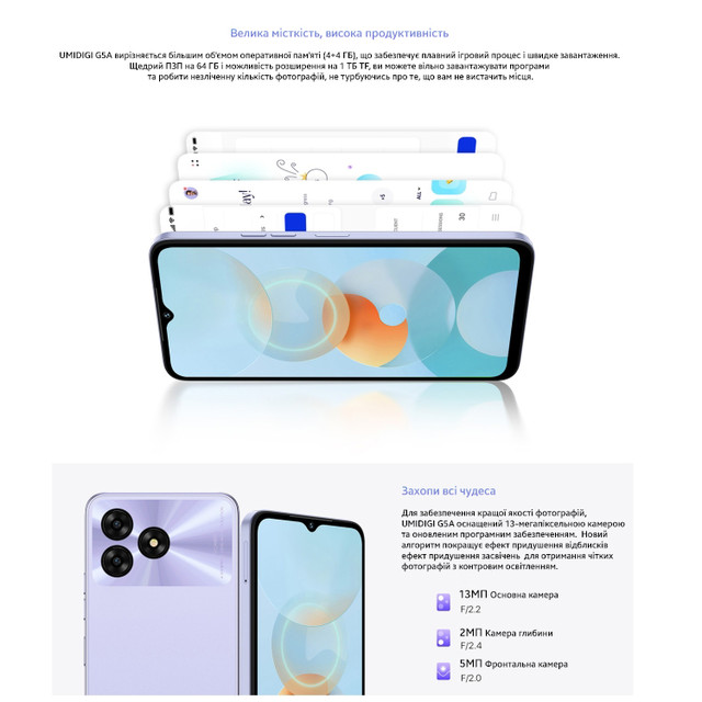 Смартфон UMIDIGI G5A отримав елегантний та компактний дизайн, актуальний трендам 2024 року, із закругленими кутами, рубаними гранями та стильним оформленням блоку тилових камер. Міцний корпус, виконаний із AG композитного матеріалу, який використовується при виробництві стрілецької зброї. Задня панель фінішована матовою текстурою, яка приємна на дотик і забезпечує підвищену міцність та стійкість до відбитків пальців. Склоподібне покриття рамки, де розташовані фото сенсори основної камери, додає телефону нотку елегантності та відчуття преміум-класу, та створює яскраві світлові ефекти під різними кутами огляду. Завдяки поєднанню матового композитного матеріалу AG зі склоподібним покриттям UMIDIGI G5A досягає балансу між міцністю, візуальною естетикою та зручністю використання за доступною ціною. З HD+ IPS екраном 6.52-дюйми UMIDIGI G5A зберіг компактні розміри. Такий екран дозволяє пристрою залишатися портативним і зручним у використанні, не перетворюючись на занадто громіздкий. Оптимальна діагональ дозволяє взаємодіяти з екраном однією рукою, що може бути надзвичайно важливим для користувачів, які хочуть швидко та зручно тримати свій телефон без використання обох рук. Зручне розташування фізичних клавіш керування та сканера відбитків пальців дозволяють впевнено користуватися телефоном однією рукою. Сканер відбитків пальців розташований у боковій клавіші блокування телефону. Адже ця кнопка є природним місцем для вбудованого сканера відбитків пальців. Вона зазвичай розташована зручно для доступу під час утримання пристрою в руках. Створіть свій світ фотографії нового покоління з потужною подвійною камерою на 13 МП, яка вражає не лише кришталево чіткими знімками, а й глибиною, яку надає додатковий фотосенсор 2 МП. Завдяки неймовірно точної техніки, ви матимете можливість створювати професійні фотографії з ефектом боке та вражаючими фотоефектами. А нічний режим зйомки дозволить вашим кадрам виглядати так, ніби вони стосуються зірок. 64-бітовий процесор MediaTek Helio A22 з результатом синтетичного тесту Antutu більше 54 000 балів відмінно підходить для легких та середніх ігор, забезпечуючи плавний геймплей та ефективне управління ресурсами. Його оптимізована продуктивність дозволяє легко перемикатися між різними завданнями від ігор до швидкого перегляду в Інтернеті або використання соціальних мереж. Справжня потужність у твоїх руках! Завдяки 4 ГБ оперативної пам'яті та додатковим 4 ГБ файлу підкачування, цей смартфон готовий розкрити тобі всю ефективність миттєвого доступу до додатків та швидкості виконання завдань. З вбудованими 64 ГБ пам'яті, яку легко можна збільшити до 1 ТБ за допомогою картки MicroSD, ти матимеш нескінченне сховище для своїх улюблених фотографій, програм та фільмів. Цілий день без заряджання і навіть більше. Перевірте це, якщо є сили. Батарея на 5000 мАч забезпечить тривалу автономність при активному використанні смартфона протягом дня. UMIDIGI G5A, заряджений підтримкою 4G LTE для обох SIM-карт та дводіапазонним Wi-Fi6 (2.4+5G), гарантує стрімке та надійне з'єднання з інтернетом, дозволяючи вам насолоджуватися безперервним доступом до контенту та швидким завантаженням даних. КОРПУС Матеріал корпусу — Пластик ПРОГРАМНІ ХАРАКТЕРИСТИКИ Операційна система — Android 13 ЗВ'ЯЗОК Кількість SIM-карт — 2 SIM Стандарти зв'язку — GSM, 3G, 4G (LTE) Формат SIM-карти — N