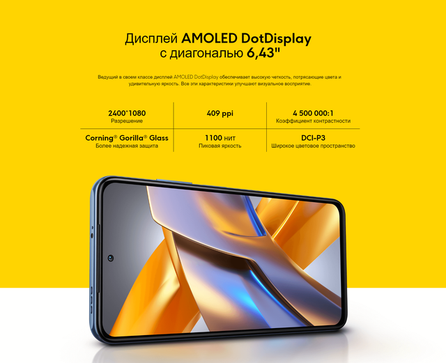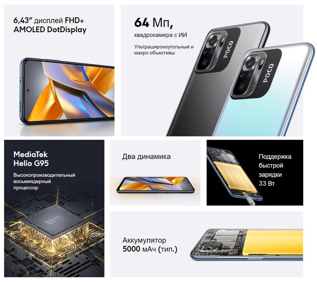 Экран (6.43", AMOLED, 2400x1080, DC Dimming) / MediaTek Helio G95 (2.05 ГГц) / основная камера 64 Мп + 8 Мп + 2 Мп + 2 Мп, фронтальная камера: 13 Мп / RAM 4 ГБ / 128 ГБ встроенной памяти / 3G / 4G (LTE)/ GPS / ГЛОНАСС/ поддержка 2х SIM-карт (SIM + SIM + MicroSD) / MIUI 13.0, Android 12/ 5000 мА*ч