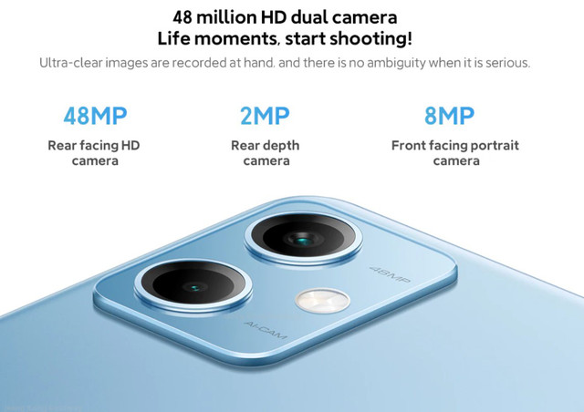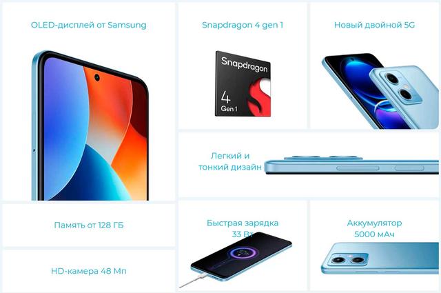 Экран (6.67", AMOLED, 2400x1080, 120 Гц) / Qualcomm Snapdragon 4 Gen 1 (2.0 ГГц) / Основная камера 48 Мп + 2 Мп, Фронтальная камера: 8 Мп / RAM 8 ГБ / 256 ГБ встроенной памяти / 3G / 4G (LTE) / VoLTE / 5G / GPS / ГЛОНАСС / Galileo / BDS / поддержка 2х SIM-карт (SIM + Гибридный (SIM или MicroSD)) / MIUI 13, Android 12 /5000 мА*ч