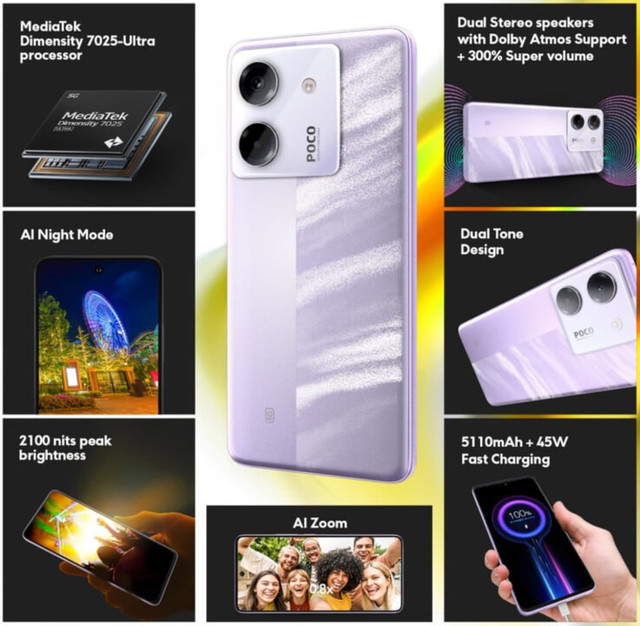 Xiaomi POCO M7 PRO 5G — новинка 2025 року, що ідеально поєднує стильний дизайн та передові технології. Смартфон має сертифікат IP64 по захисту від води та пилу, POCO оснащений 6,67-дюймовим дисплеєм AMOLED, основною камерою на 50 МП і акумулятором ємністю 5110 мАч з підтримкою швидкої зарядки 45 Вт, забезпечуючи комфорт, продуктивність та яскраві враження від використання. Смартфон оснащений 6,67-дюймовим дисплеєм Super AMOLED з роздільною здатністю FHD+ (1080x2400 пікселів), адаптивною частотою оновлення 60/90/120 Гц, миттєвою частотою дискретизації 2160 Гц, максимальною яскравістю до 2100 ніт, високою чуйністю сенсора та захистом Corning Gorilla Glass 5 для надійності та якісного відображення. POCO M7 Pro 5G оснащений потужним процесором MediaTek Dimensity 7025-Ultra SoC та 12 ГБ оперативної пам'яті з можливістю збільшення до 24 ГБ за рахунок віртуальної пам'яті. Працює смартфон на сучасній системі HyperOS, заснованій на Android 14, з гарантією отримання оновлень Android протягом 2 років та оновлень безпеки протягом 4 років. На задній панелі POCO M7 Pro 5G розташована подвійна камера зі світлодіодним спалахом: основний сенсор Sony LYT-600 на 50 МП із підтримкою оптичної стабілізації зображення (OIS) та додатковий датчик глибини на 2 МП. Для селфі передбачена фронтальна камера з одним сенсором на 20 МП, що забезпечує чіткі та деталізовані знімки. POCO M7 Pro 5G оснащений аудіороз'ємом 3,5 мм, стереодинаміками з підтримкою Dolby Atmos та сертифікацією Hi-Res Audio, що забезпечує занурення в якісний та об'ємний звук як при використанні навушників, так і при відтворенні через вбудовані динаміки. Акумулятор ємністю 5110 мАг з підтримкою швидкої зарядки 45 Вт, що забезпечує вдвічі швидше поповнення заряду порівняно з попередником. ХАРАКТЕРИСТИКИ ПРОГРАМНІ ХАРАКТЕРИСТИКИ Операційна система — Android 14 Інтерфейс користувача— HyperOS КОРПУС Матеріал корпусу — Пластик, Алюмінієвий сплав, Скло Ступінь захисту — IP64 (Захист від бризок і пили) ЗВ'ЯЗОК Стандарт зв'язку — GPRS, GSM, 3G, 4G (LTE), 5G Кількість SIM-карт — 2 Nano-SIM Тип слота SIM-карт — SIM + Гібридний (SIM або MicroSD) ДИСПЛЕЙ Діагональ екрану — 6.67" Тип екрану — AMOLED Роздільна здатність дисплея — 2400x1080 пікс. Частота оновлення — 120 Гц Щільність пікселів — 395 ppi ПРОЦЕСОР Процесор — MediaTek Dimensity 7025-Ultra Кількість ядер — 8 Частота процесора — 2x 2.5 ГГц ARM Cortex A78 + 6x 2.0 ГГц ARM CortexA55 Графічний процесор — IMG BXM-8-256 ПАМ'ЯТЬ Об'єм вбудованої пам'яті — 512 ГБ Об'єм оперативної пам'яті — 12 ГБ (+ 12 ГБ віртуальної пам'яті) Слот для картки пам'яті — microSD до 2 ТБ КАМЕРА Камера — 50 МП + 2 МП Фронтальна камера — 20 МП МУЛЬТИМЕДІА Аудіо вихід (3,5 мм) — Є Роз'єм для синхронізації — USB Type-C КОМУНІКАЦІЇ Wi-Fi — 5 (802.11ac) Bluetooth — 5.3 Функція GPS — A-GPS, GLONASS, QZSS, Galileo, BeiDou NFC — Є ІЧ-порт — Є VoLTE — Є ЗВУК Стерео динаміки — Є ДАТЧИКИ Акселерометр, Гіроскоп, Датчик наближення, Датчик освітлення, Електронний компас, Ультразвуковий датчик наближення, Сканер відбитків пальців АКУМУЛЯТОР Місткість акумулятора — 5110 mAh (Незнімний) Швидка зарядка — Є (Power Delivery 3.0) Потужність зарядки — 45 Вт (Уточнювати чи поставляється в комплекті) Можливість бездротової зарядки — Немає ГАБАРИТИ Розмір — 162.4 x 75.7 x 7.99 мм Вага — 190 г КОМПЛЕКТАЦІЯ Смартфон, Кабель Type-C, Захисний чохол, Інструмент для вилучення SIM-карти, Інструкція Характеристики та комплектація товару можуть бути змінені виробником без попередження.Xiaomi POCO M7 PRO 5G Global Version
