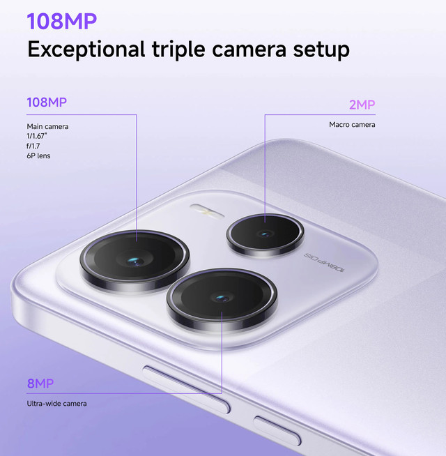 Екран (6.67", AMOLED, 1080x2400, 120 Гц) / MediaTek Dimensity 7025 (2.5 ГГц) / Основна камера 108 МП + 8 МП + 2 МП, Фронтальна камера: 20 МП / RAM 6 ГБ / 128 ГБ вбудованої пам'яті / 3G / 4G (LTE) / 5G/ GPS / ГЛОНАСС / Galileo / BDS / підтримка 2х SIM-карт (SIM + Гібридний (SIM або MicroSD)) / Android 14, HyperOS / 5110 мА*г / 45 Вт